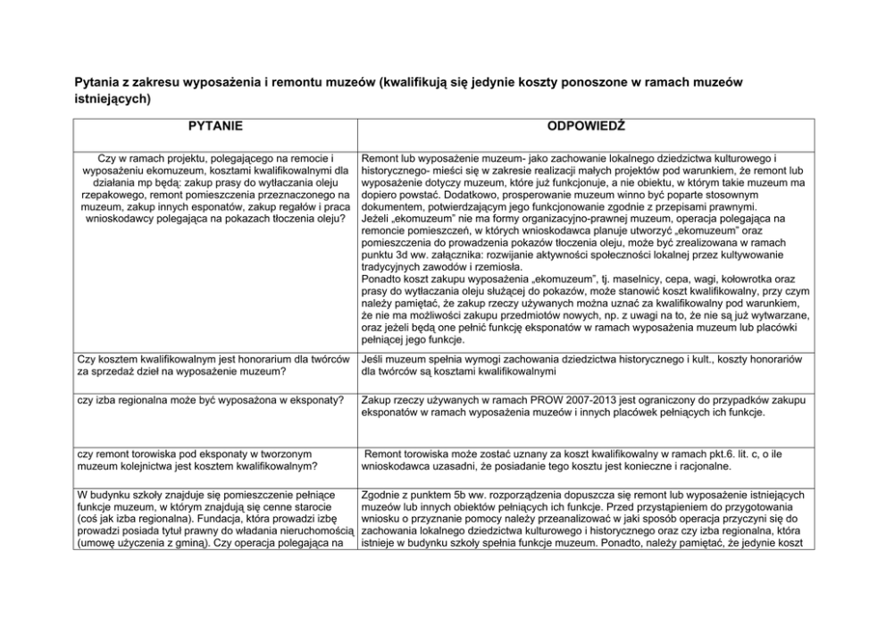Pytania z zakresu wyposażenia i remontu muzeów (kwalifikują się jedynie koszty ponoszone w ramach muzeów istniejących) PYTANIE ODPOWIEDŹ Czy w ramach projektu, polegającego na remocie i wyposażeniu ekomuzeum, kosztami kwalifikowalnymi dla działania mp będą: zakup prasy do wytłaczania oleju rzepakowego, remont pomieszczenia przeznaczonego na muzeum, zakup innych esponatów, zakup regałów i praca wnioskodawcy polegająca na pokazach tłoczenia oleju? Remont lub wyposażenie muzeum- jako zachowanie lokalnego dziedzictwa kulturowego i historycznego- mieści się w zakresie realizacji małych projektów pod warunkiem, że remont lub wyposażenie dotyczy muzeum, które już funkcjonuje, a nie obiektu, w którym takie muzeum ma dopiero powstać. Dodatkowo, prosperowanie muzeum winno być poparte stosownym dokumentem, potwierdzającym jego funkcjonowanie zgodnie z przepisami prawnymi. Jeżeli „ekomuzeum” nie ma formy organizacyjno-prawnej muzeum, operacja polegająca na remoncie pomieszczeń, w których wnioskodawca planuje utworzyć „ekomuzeum” oraz pomieszczenia do prowadzenia pokazów tłoczenia oleju, może być zrealizowana w ramach punktu 3d ww. załącznika: rozwijanie aktywności społeczności lokalnej przez kultywowanie tradycyjnych zawodów i rzemiosła. Ponadto koszt zakupu wyposażenia „ekomuzeum”, tj. maselnicy, cepa, wagi, kołowrotka oraz prasy do wytłaczania oleju służącej do pokazów, może stanowić koszt kwalifikowalny, przy czym należy pamiętać, że zakup rzeczy używanych można uznać za kwalifikowalny pod warunkiem, że nie ma możliwości zakupu przedmiotów nowych, np. z uwagi na to, że nie są już wytwarzane, oraz jeżeli będą one pełnić funkcję eksponatów w ramach wyposażenia muzeum lub placówki pełniącej jego funkcje. Czy kosztem kwalifikowalnym jest honorarium dla twórców za sprzedaż dzieł na wyposażenie muzeum? Jeśli muzeum spełnia wymogi zachowania dziedzictwa historycznego i kult., koszty honorariów dla twórców są kosztami kwalifikowalnymi czy izba regionalna może być wyposażona w eksponaty? Zakup rzeczy używanych w ramach PROW 2007-2013 jest ograniczony do przypadków zakupu eksponatów w ramach wyposażenia muzeów i innych placówek pełniących ich funkcje. czy remont torowiska pod eksponaty w tworzonym muzeum kolejnictwa jest kosztem kwalifikowalnym? Remont torowiska może zostać uznany za koszt kwalifikowalny w ramach pkt.6. lit. c, o ile wnioskodawca uzasadni, że posiadanie tego kosztu jest konieczne i racjonalne. W budynku szkoły znajduje się pomieszczenie pełniące funkcje muzeum, w którym znajdują się cenne starocie (coś jak izba regionalna). Fundacja, która prowadzi izbę prowadzi posiada tytuł prawny do władania nieruchomością (umowę użyczenia z gminą). Czy operacja polegająca na Zgodnie z punktem 5b ww. rozporządzenia dopuszcza się remont lub wyposażenie istniejących muzeów lub innych obiektów pełniących ich funkcje. Przed przystąpieniem do przygotowania wniosku o przyznanie pomocy należy przeanalizować w jaki sposób operacja przyczyni się do zachowania lokalnego dziedzictwa kulturowego i historycznego oraz czy izba regionalna, która istnieje w budynku szkoły spełnia funkcje muzeum. Ponadto, należy pamiętać, że jedynie koszt remoncie pomieszczenia izby wpisuje się w zakres małych projektów? Czy obiekt pełniący funkcje muzeum musi działać na podstawie ustawy o muzeach . Jaki załącznik do wniosku jest potwierdzeniem faktu, że obiekt pełni funkcje muzeum? remontu i wyposażenia muzeum istniejącego (prowadzącego działalność kulturalną) może być zaliczony do kosztów kwalifikowalnych operacji. Jednocześnie przedstawiony opis projektu nie pozwala stwierdzić, czy pomieszczenie w budynku szkoły, w którym znajdują się cenne starocie spełnia rzeczywiście kryteria wskazane w rozporządzeniu. Istnienie i działalność muzeum lub obiektu pełniącego funkcje muzeum powinno być zalegalizowane, tzn. opierać się na przepisach ustaw, np. ustawy o muzeach z dnia 21 listopada 1996 (Dz.U. z 1997 Nr.5, poz.24 z późn. zm.) albo np. ustawy o organizowaniu i prowadzeniu działalności kulturalnej z dnia 25 października 1991 r. (Dz.U. Nr 114, poz. 493 z późn. zm.). W przypadku obiektów działających na podstawie ustawy o muzeach, niezależnie od tego czy jest to instytucja publiczna, czy podmiot prywatny, potwierdzeniem prowadzenia muzeum jest uzgodniony z Ministerstwem Kultury i Dziedzictwa Narodowego regulamin muzeum albo dokument potwierdzający wpis do państwowego rejestru muzeów (tylko niektóre muzea spełniają wymogi aby znaleźć się w tym rejestrze). Obiekt, który działa na podstawie ustawy o organizowaniu i prowadzeniu działalności kulturalnej, posiada akt utworzenia nadany przez organizatora, statut oraz wpis do rejestru obiektów prowadzony przez organizatora. Dany obiekt może być utworzony i działać również na podstawie umowy zawartej przez organizatora i osobę fizyczną, osobę prawną lub jednostkę organizacyjną nieposiadającą osobowości prawnej. Wnioskodawca, który ubiega się o przyznanie pomocy z zakresu małych projektów (punkt 5b załącznika do rozporządzenia) powinien załączyć do wniosku jeden z wymienionych dokumentów, w zależności od sytuacji prawnej w jakiej się znajduje. Pozostałe obiekty, które pełnią funkcje muzeów działają na podstawie ustaw odrębnych np. ustawy o stowarzyszeniach, ustawy o fundacjach albo ustawy o swobodzie działalności gospodarczej. W takim przypadku potwierdzeniem prowadzenia obiektu pełniącego funkcje muzeów jest statut osoby prawnej, w którym wskazane są cele działalności lub dokumenty potwierdzające prowadzenie działalności (nawet gospodarczej) związanej z zachowaniem dziedzictwa kulturowego i historycznego (odpowiednie PKD) oraz regulamin działalności obiektu (przy czym koniecznym warunkiem jest udostępnianie zbiorów). Mając na uwadz