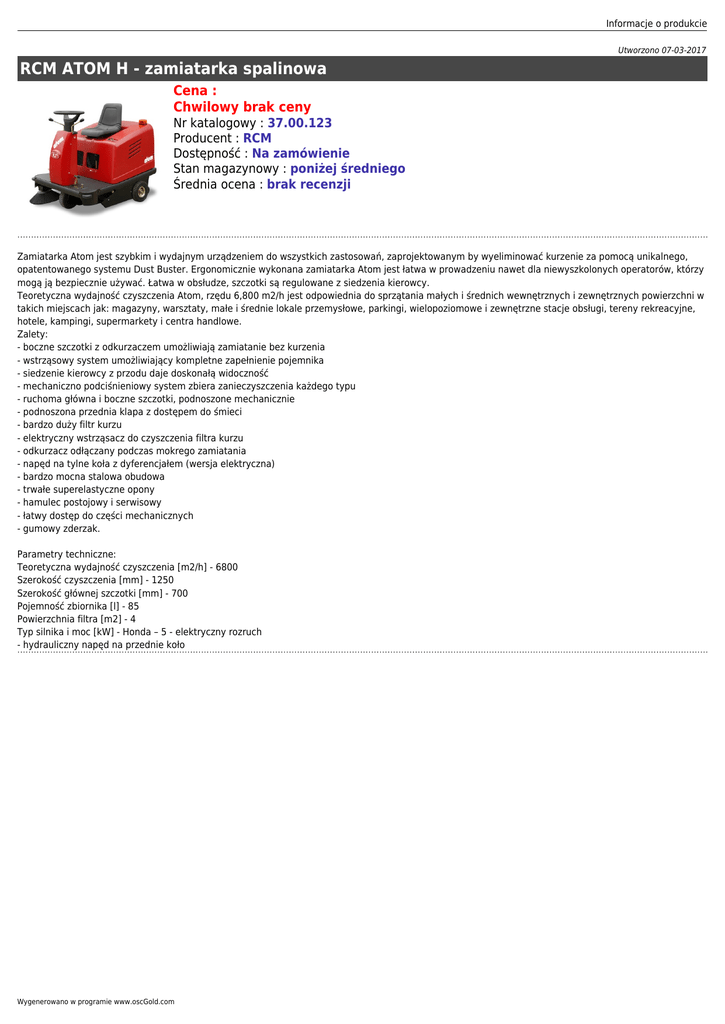 Informacje o produkcie Utworzono 07-03-2017 RCM ATOM H - zamiatarka spalinowa Cena : Chwilowy brak ceny Nr katalogowy : 37.00.123 Producent : RCM Dostępność : Na zamówienie Stan magazynowy : poniżej średniego Średnia ocena : brak recenzji Zamiatarka Atom jest szybkim i wydajnym urządzeniem do wszystkich zastosowań, zaprojektowanym by wyeliminować kurzenie za pomocą unikalnego, opatentowanego systemu Dust Buster. Ergonomicznie wykonana zamiatarka Atom jest łatwa w prowadzeniu nawet dla niewyszkolonych operatorów, którzy mogą ją bezpiecznie używać. Łatwa w obsłudze, szczotki są regulowane z siedzenia kierowcy. Teoretyczna wydajność czyszczenia Atom, rzędu 6,800 m2/h jest odpowiednia do sprzątania małych i średnich wewnętrznych i zewnętrznych powierzchni w takich miejscach jak: magazyny, warsztaty, małe i średnie lokale przemysłowe, parkingi, wielopoziomowe i zewnętrzne stacje obsługi, tereny rekreacyjne, hotele, kampingi, supermarkety i centra handlowe. Zalety: - boczne szczotki z odkurzaczem umożliwiają zamiatanie bez kurzenia - wstrząsowy system umożliwiający kompletne zapełnienie pojemnika - siedzenie kierowcy z przodu daje doskonałą widoczność - mechaniczno podciśnieniowy system zbiera zanieczyszczenia każdego typu - ruchoma główna i boczne szczotki, podnoszone mechanicznie - podnoszona przednia klapa z dostępem do śmieci - bardzo duży filtr kurzu - elektryczny wstrząsacz do czyszczenia filtra kurzu - odkurzacz odłączany podczas mokrego zamiatania - napęd na tylne koła z dyferencjałem (wersja elektryczna) - bardzo mocna stalowa obudowa - trwałe superelastyczne opony - hamulec postojowy i serwisowy - łatwy dostęp do części mechanicznych - gumowy zderzak. Parametry techniczne: Teoretyczna wydajność czyszczenia [m2/h] - 6800 Szerokość czyszczenia [mm] - 1250 Szerokość głównej szczotki [mm] - 700 Pojemność zbiornika [l] - 85 Powierzchnia filtra [m2] - 4 Typ silnika i moc [kW] - Honda – 5 - elektryczny rozruch - hydrauliczny napęd na przednie koło Wygenerowano w programie www.oscGold.com