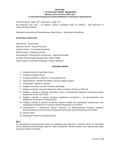 PROTOKÓŁ z VII SESJI RADY GMINY BRĄSZEWICE odbytej w dniu 25 marca 2015 roku w sali konferencyjnej przy Gminnej Bibliotece Publicznej w Brąszewicach Otwarcie obrad – godz. 1000, zamknięcie – godz. 1410. Na ustawowy stan rady – 15 radnych, udział w obradach brało 15 radnych – lista obecności w załączeniu do protokołu. Obradom przewodniczył Przewodniczący Rady Gminy – radny Adam Sowizdrzał. W obradach udział brali: Wójt Gminy – Karol Misiak Sekretarz Gminy – Renata Plucińska Skarbnik Gminy – Krzesisława Kamińska Radca Prawny – Andrzej Frontczak Kierownik Ref. Infrastruktury Technicznej – Agnieszka Drzazga Dyrektor Powiatowego Zarządu Dróg - Robert Piątek Sołtysi sołectw: Kamieniki, Wojtyszki, Chajew, Bukowiec PORZĄDEK OBRAD 1. 2. 3. 4. 5. 6. 7. 8. 9. 10. 11. 12. 13. Otwarcie obrad VII sesji Rady Gminy. Przyjęcie porządku obrad. Przyjęcie protokołu z obrad V i VI sesji Rady Gminy. Sprawozdanie z działalności Wójta w okresie między sesjami. Interpelacje i zapytania radnych. Podjęcie uchwały w sprawie funduszu sołeckiego. Podjęcie uchwały w sprawie dokonania zmian w budżecie Gminy na 2015 rok. Podjęcie uchwały w sprawie dokonania zmian w Wieloletniej Prognozie Finansowej Gminy Brąszewice na lata 2015-2029. Podjęcie uchwały w sprawie przyjęcia regulaminu korzystania z sali gimnastycznej przy Publicznym Gimnazjum w Brąszewicach. Podjęcie uchwały w sprawie określenia Programu opieki nad zwierzętami bezdomnymi oraz zapobiegania bezdomności zwierząt w Gminie Brąszewice na rok 2015. Sprawozdanie z udzielonych dotacji celowych na dofinansowanie budowy przyłączy kanalizacyjnych do nieruchomości położonych na terenie Gminy Brąszewice za rok 2014. Sprawy różne. Zamknięcie obrad VII sesji Rady Gminy. Ad. 1 Po stwierdzeniu prawomocności obrad na podstawie listy obecności, otwarcia obrad VII sesji Rady Gminy dokonał przewodniczący rady Pan Adam Sowizdrzał. Powitał radnych oraz zaproszonych gości biorących udział w obradach. Strona 1 z 10 Ad. 2 Przewodniczący Rady przedstawił proponowany porządek obrad. Wójt Gminy poinformował, że około godziny 12:00 przybędzie na sesję Dyrektor Powiatowego Zarządu Dróg – Pan Robert Piątek oraz poprosił radnych, aby umożliwili Dyrektorowi PZD wejście w trakcie proponowanego porządku obrad. Ze względu na brak uwag do proponowanego porządku obrad Przewodniczący Rady poddał go pod głosowanie. W głosowaniu wzięło udział 15 radnych obecnych na sali obrad. Rada nie wniosła zastrzeżeń i opowiedziała się jednogłośnie za przyjęciem proponowanego porządku. Ad. 3 Przewodniczący Rady poddał pod głosowanie protokoły z V i VI sesji. Protokół z V Sesji Rady Gminy został przyjęty (12 głosów ZA, 3 radnych WSTRZYMAŁO się od głosu). Protokół z VI Sesji Rady Gminy został przyjęty (12 głosów ZA, 3 radnych WSTRZYMAŁO się od głosu). Ad. 4 W sprawozdaniu ze swej działalności między sesjami w okresie od 19 lutego 2015 r. do dnia 25 marca 2015 roku, Wójt poinformował: 1. Dnia 19.02.2015 – obcinanie gałęzi utrudniających ruch pojazdów w miejscowości Sowizdrzały. 2. Dnia 20.02.2015 – naprawa przyłącza wodociągowego w Przedłęcze. 3. Zorganizowano w dniu 26.02.2015 – kurs chemizacyjny – udział wzięły 22 osoby. 4. Od 27.02.2015 – przywóz ziemi pod wyrównanie terenu zlokalizowanych trybun na boisku sportowym w Brąszewicach – 20 przyczep. 5. W dniu 13.03.2015 – naprawa przyłącza wodociągowego w Plutach. 6. W dniach 16-20.03.2015 – równanie dróg gminnych sprzętem gminnym. 7. W dniu 27 lutego 2015 r. otwarto przetarg na Przebudowę drogi relacji Brąszewice – Sokolenie (do oczyszczalni ścieków). Złożono 6 ofert: 1) SIDROG Sp. z o.o. Błaszki, Domaniew 2) Lider Konsorcjum: „BUD – TRANS” Roboty Budowlano – Drogowe Maria Karbowiak, Sieradz, 3) Przedsiębiorstwo Budownictwa Inżynierii, „EKO – INŻYNIERIA” Sp. z o.o., Ostrów Wielkopolski, 4) DROMAK Sp. z o.o., Zduńska Wola, 5) STRABAG Sp. z o.o., Pruszków, 6) Przedsiębiorstwo Robót Drogowych i Mostowych Sp. z o.o., Sieradz, Czartki 60. 8. Złożono wniosek do Fundacji Rozwoju Kultury Fizycznej Ministerstwa Sportu i Turystyki o dofinansowanie animatorów sportu na boisku ORLIK – przyznano nam dofinansowanie dla dwóch animatorów. 9. W dniu 26 lutego 2015 r. złożono wniosek do WFOŚiGW o pożyczko- dotację i pożyczkę pomostową na Budowę kanalizacji sanitarnej w miejscowości Godynice i Przedłęcze. Radny Jerzy Ławniczak zapytał, czy została wyłoniona firma, która zajmie się przebudową drogi Brąszewice – Sokolenie. Wójt Gminy poinformował, że na chwilę obecną firma nie została wyłoniona ze względu na brak środków w budżecie na ten cel oraz dodał, że wystąpił do oferentów o przedłużenie terminu rozstrzygnięcia przetargu. Ad. 5 Przewodniczący Adam Sowizdrzał: - poprosił o zmianę numerów na tablicy informującej o dojeździe do posesji w miejscowości Bukowiec. Obecnie jest zapisane 49-61, a powinno być 50-61 co może wprowadzać w błąd kierowców. Strona 2 z 10 - odniósł się do zamieszczania na portalu facebook.com pod nazwą Rada Gminy Brąszewice wpisów w imieniu całej Rady Gminy przez jednego Radnego. Przewodniczący jest zdania, że Rada Gminy to 15 Radnych, którzy o ile wie nie wyrażali zgody na reprezentowanie ich w Internecie. Radny Jacek Piotrowski poinformował, że jest to profil założony przez niego i że jest o tym informacja. Radca Prawny Andrzej Frontczak wyraził opinię, że każdy może poprzez media społecznościowe informować innych o własnej osobie i pełnionej funkcji, ale w żadnym wypadku nie może reprezentować organów Gminy bez zgody i upoważnienia do takich czynności. Dokonywanie wpisów w imieniu Rady Gminy przez jednego Radnego jest działaniem nieuprawnionym. Przewodniczący Rady Gminy poinformował, że jego zdaniem Radny może dokonywać takich wpisów, ale p