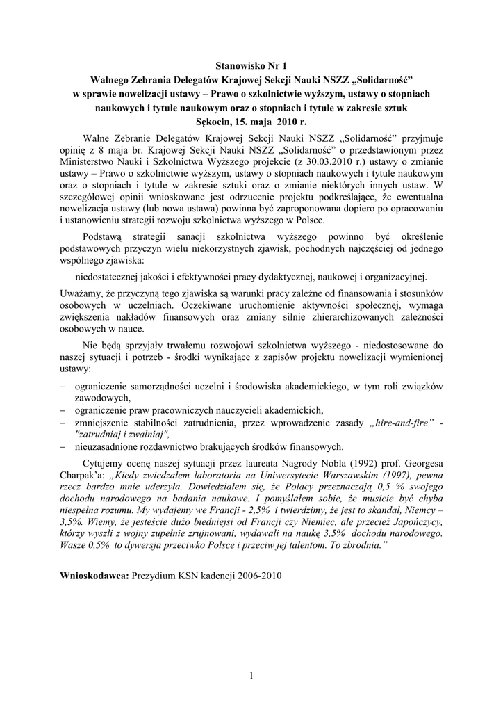 Stanowisko Nr 1 Walnego Zebrania Delegatów Krajowej Sekcji Nauki NSZZ „Solidarność” w sprawie nowelizacji ustawy – Prawo o szkolnictwie wyŜszym, ustawy o stopniach naukowych i tytule naukowym oraz o stopniach i tytule w zakresie sztuk Sękocin, 15. maja 2010 r. Walne Zebranie Delegatów Krajowej Sekcji Nauki NSZZ „Solidarność” przyjmuje opinię z 8 maja br. Krajowej Sekcji Nauki NSZZ „Solidarność” o przedstawionym przez Ministerstwo Nauki i Szkolnictwa WyŜszego projekcie (z 30.03.2010 r.) ustawy o zmianie ustawy – Prawo o szkolnictwie wyŜszym, ustawy o stopniach naukowych i tytule naukowym oraz o stopniach i tytule w zakresie sztuki oraz o zmianie niektórych innych ustaw. W szczegółowej opinii wnioskowane jest odrzucenie projektu podkreślające, Ŝe ewentualna nowelizacja ustawy (lub nowa ustawa) powinna być zaproponowana dopiero po opracowaniu i ustanowieniu strategii rozwoju szkolnictwa wyŜszego w Polsce. Podstawą strategii sanacji szkolnictwa wyŜszego powinno być określenie podstawowych przyczyn wielu niekorzystnych zjawisk, pochodnych najczęściej od jednego wspólnego zjawiska: niedostatecznej jakości i efektywności pracy dydaktycznej, naukowej i organizacyjnej. UwaŜamy, Ŝe przyczyną tego zjawiska są warunki pracy zaleŜne od finansowania i stosunków osobowych w uczelniach. Oczekiwane uruchomienie aktywności społecznej, wymaga zwiększenia nakładów finansowych oraz zmiany silnie zhierarchizowanych zaleŜności osobowych w nauce. Nie będą sprzyjały trwałemu rozwojowi szkolnictwa wyŜszego - niedostosowane do naszej sytuacji i potrzeb - środki wynikające z zapisów projektu nowelizacji wymienionej ustawy: − ograniczenie samorządności uczelni i środowiska akademickiego, w tym roli związków zawodowych, − ograniczenie praw pracowniczych nauczycieli akademickich, − zmniejszenie stabilności zatrudnienia, przez wprowadzenie zasady „hire-and-fire” "zatrudniaj i zwalniaj", − nieuzasadnione rozdawnictwo brakujących środków finansowych. Cytujemy ocenę naszej sytuacji przez laureata Nagrody Nobla (1992) prof. Georgesa Charpak’a: „Kiedy zwiedzałem laboratoria na Uniwersytecie Warszawskim (1997), pewna rzecz bardzo mnie uderzyła. Dowiedziałem się, Ŝe Polacy przeznaczają 0,5 % swojego dochodu narodowego na badania naukowe. I pomyślałem sobie, Ŝe musicie być chyba niespełna rozumu. My wydajemy we Francji - 2,5% i twierdzimy, Ŝe jest to skandal, Niemcy – 3,5%. Wiemy, Ŝe jesteście duŜo biedniejsi od Francji czy Niemiec, ale przecieŜ Japończycy, którzy wyszli z wojny zupełnie zrujnowani, wydawali na naukę 3,5% dochodu narodowego. Wasze 0,5% to dywersja przeciwko Polsce i przeciw jej talentom. To zbrodnia.” Wnioskodawca: Prezydium KSN kadencji 2006-2010 1 Stanowisko Nr 2 Walnego Zebrania Delegatów Krajowej Sekcji Nauki NSZZ „Solidarność” w sprawie zmiany wysokości przeciętnego miesięcznego wynagrodzenia w uczelni publicznej w poszczególnych grupach pracowników w relacji do prognozowanej kwoty przeciętnego miesięcznego wynagrodzenia brutto w gospodarce narodowej określonej corocznie w ustawie budŜetowej Sękocin, 15. maja 2010 r. Walne Zebranie Delegatów Krajowej Sekcji Nauki NSZZ „Solidarność” proponuje zmianę postanowień art. 151 ust. 1 pkt 1a-d w ustawie z dnia 27 lipca 2005 roku Prawo o szkolnictwie wyŜszym (Dz. U. z 2005 r., Nr 1164, poz. 1365, z późn. zm.) na: Art. 151. 1. Warunki wynagradzania za pracę i przyznawania innych świadczeń związanych z pracą dla pracowników zatrudnionych w uczelni publicznej do czasu objęcia ich układem zbiorowym pracy lub regulaminem wynagradzania określi, w drodze rozporządzenia, minister właściwy do spraw szkolnictwa wyŜszego w porozumieniu z ministrem właściwym do spraw pracy, ustalając: 1) wysokość minimalnej i maksymalnej stawki wynagrodzenia zasadniczego w odniesieniu do poszczególnych stanowisk oraz wysokość i warunki przyznawania innych składników wynagrodzenia tak, aby wysokość przeciętnego miesięcznego wynagrodzenia w uczelni publicznej, w poszczególnych grupach pracowników w relacji do prognozowanej przeciętnej kwoty miesięcznej wynagrodzenia brutto w gospodarce narodowej określonej corocznie w ustawie budŜetowej nie była niŜsza: a) w grupie stanowisk profesorów – od 300%; b) w grupie stanowisk docentów, adiunktów i starszych wykładowców, starszych kustoszy dyplomowanych, starszych dokumentalistów dyplomowanych, kustoszy dyplomowanych i dokumentalistów dyplomowanych, a takŜe adiunktów bibliotecznych i adiunktów dokumentacji i informacji naukowej – od 200%; c) w grupie stanowisk asystentów, wykładowców, lektorów, instruktorów, asystentów bibliotecznych, asystentów dokumentacji i informacji naukowej – od 100%; d) w grupie pracowników nie będących nauczycielami akademickimi – od 125%; prognozowanej miesięcznej kwoty wynagrodzenia brutto w gospodarce narodowej określanej corocznie w ustawie budŜetowej, z uwzględnieniem zasady, Ŝe wysokość indywidualnych stawek poszczególnych składników wynagrodzenia pracowników uczelni ustala rektor z uwzględnieniem przepisów ustawy z dnia 23 maja 1991 r. o związkach zawodowych (Dz. U. z 1991 r., Nr 55, poz. 234 z późn. zm.). Zaproponowani adresaci stanowiska: Minister Nauki i Szkolnictwa WyŜszego, Rada Główna Szkolnictwa WyŜszego, Konferencja Rektorów Akademickich Szkół Polskich. Wnioskodawcy: Krystyna Andrzejewska, mandat nr 3, Beata Zięba, mandat nr 180, Paweł Sobotka, mandat nr 141, Franciszka Orzeszkowska, mandat nr 108. 2 Stanowisko Nr 3 Walnego Zebrania Delegatów Krajowej Sekcji Nauki NSZZ „Solidarność” w sprawie zagroŜeń płynących z realizacji procesu bolońskiego Sękocin, 15. maja 2010 r. Walne Zebranie Delegatów Krajowej Sekcji Nauki NSZZ „Solidarność” wyraŜa zaniepokojenie z powodu zagroŜeń płynących z realizacji procesu bolońskiego, a w szczególności: • relatywnego spadku 