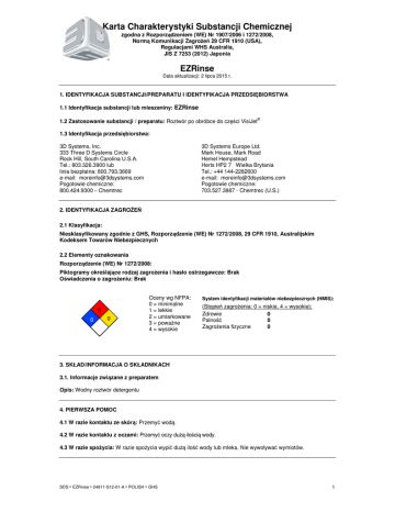 Karta Charakterystyki Substancji Chemicznej zgodna z Rozporządzeniem (WE) Nr 1907/2006 i 1272/2008, Normą Komunikacji Zagrożeń 29 CFR 1910 (USA), Regulacjami WHS Australia, JIS Z 7253 (2012) Japonia EZRinse Data aktualizacji: 2 lipca 2015 r. 1. IDENTYFIKACJA SUBSTANCJI/PREPARATU I IDENTYFIKACJA PRZEDSIĘBIORSTWA 1.1 Identyfikacja substancji lub mieszaniny: EZRinse 1.2 Zastosowanie substancji / preparatu: Roztwór po obróbce do części VisiJet ® 1.3 Identyfikacja przedsiębiorstwa: 3D Systems, Inc. 333 Three D Systems Circle Rock Hill, South Carolina U.S.A. Tel.: 803.326.3900 lub linia bezpłatna: 800.793.3669 e-mail: [email protected] Pogotowie chemiczne: 800.424.9300 – Chemtrec 3D Systems Europe Ltd. Mark House, Mark Road Hemel Hempstead Herts HP2 7 Wielka Brytania Tel.: +44 144-2282600 e-mail: [email protected] Pogotowie chemiczne: 703.527.3887 - Chemtrec (U.S.) 2. IDENTYFIKACJA ZAGROŻEŃ 2.1 Klasyfikacja: Niesklasyfikowany zgodnie z GHS, Rozporządzenie (WE) Nr 1272/2008, 29 CFR 1910, Australijskim Kodeksem Towarów Niebezpiecznych 2.2 Elementy oznakowania Rozporządzenie (WE) Nr 1272/2008: Piktogramy określające rodzaj zagrożenia i hasło ostrzegawcze: Brak Oświadczenia o zagrożeniu: Brak 0 0 0 Oceny wg NFPA: 0 = minimalne 1 = lekkie 2 = umiarkowane 3 = poważne 4 = wysokie System identyfikacji materiałów niebezpiecznych (HMIS): (Stopień zagrożenia: 0 = niskie, 4 = wysokie); Zdrowie 0 Palność 0 Zagrożenia fizyczne 0 3. SKŁAD/INFORMACJA O SKŁADNIKACH 3.1. Informacje związane z preparatem Opis: Wodny roztwór detergentu 4. PIERWSZA POMOC 4.1 W razie kontaktu ze skórą: Przemyć wodą. 4.2 W razie kontaktu z oczami: Przemyć oczy dużą ilością wody. 4.3 W razie spożycia: W razie spożycia wypić dużą ilość wody lub mleka. Nie wywoływać wymiotów. SDS • EZRinse • 24911-S12-01-A • POLISH • GHS 1 Karta Charakterystyki Substancji Chemicznej zgodna z Rozporządzeniem (WE) Nr 1907/2006 i 1272/2008, Normą Komunikacji Zagrożeń 29 CFR 1910 (USA), Regulacjami WHS Australia, JIS Z 7253 (2012) Japonia EZRinse Data aktualizacji: 2 lipca 2015 r. 5. ŚRODKI OCHRONY PRZECIWPOŻAROWEJ 5.1. Odpowiednie środki do gaszenia ognia: Niepalna ciecz. 6. ŚRODKI REAGOWANIA W RAZIE PRZYPADKOWEGO UWOLNIENIA Metody oczyszczania: Spłukać wodą do pojemnika lub do kanalizacji, jeśli ma zastosowanie zgodnie z miejscowymi wymogami dotyczącymi utylizacji. Chronić przed zamarzaniem. 7. OBSŁUGA I MAGAZYNOWANIE 7.1 Obsługa: Unikać kontaktu ze skórą i oczyma. Zakładać gogle ochronne lub maskę na twarz w przypadku rozpryskiwania lub rozpylania płynu. 7.2 Magazynowanie: Przechowywać w oryginalnym pojemniku w temperaturze pokojowej. Przechowywać w miejscu niedostępnym dla dzieci. 8. KONTROLE EKSPOZYCJI / OCHRONA OSOBISTA Kontrole narażenia Środki techniczne zapobiegające narażeniu: Stosować lokalne systemy wentylacji wyciągowej. Zalecenia zapobiegające narażeniu: Podczas użycia nie spożywać żywności, napojów ani nie palić tytoniu. Umyć ręce po obróbce oraz przed jedzeniem, paleniem tytoniu oraz korzystaniem z toalety pod koniec dnia. Środki ochrony osobistej: Ochrona dróg oddechowych: Dobra wentylacja ogólna jest wystarczająca. Ochrona rąk: Stosować nieprzepuszczalne rękawice nitrylowe, winylowe lub lateksowe. Ochrona oczu: Zakładać gogle ochronne lub zwykłe gogle. Ochrona ciała: Zakładać fartuch i pełne buty. 9. WŁAŚCIWOŚCI CHEMICZNE I FIZYCZNE 9.1 Wygląd: Stan skupienia: Płyn 9.2 Ważne informacje dotyczące zdrowia, bezpieczeństwa i środowiska Wartość pH (20 °C): Temperatura topnienia/zakres temperatur topnienia (°C): Temperatura wrzenia/zakres temperatur wrzenia (°C): Punkt zapłonu (°C): Temperatura zapłonu (°C): Ciśnienie pary (°C): 3 Gęstość (g/cm ): 3 Gęstość nasypowa (kg/m ): Rozpuszczalność w wodzie (20°C w g/l): Lepkość, dynamiczna (mPa s): Zagrożenie wybuchem pyłu węglowego: Granice wybuchowości: SDS • EZRinse • 24911-S12-01-A • POLISH • GHS 9,5-10,0 0° 100 Nie dot. Nie dot. Nie dot. 1,0 Nie dot. Rozpuszczalny Nie dot. Nie dot. Nie dot. 2 Karta Charakterystyki Substancji Chemicznej zgodna z Rozporządzeniem (WE) Nr 1907/2006 i 1272/2008, Normą Komunikacji Zagrożeń 29 CFR 1910 (USA), Regulacjami WHS Australia, JIS Z 7253 (2012) Japonia EZRinse Data aktualizacji: 2 lipca 2015 r. 10. STABILNOŚĆ I REAKTYWNOŚĆ Niebezpieczne produkty rozkładu: Dwutlenek węgla może być uwalniany w wysokich temperaturach lub po spaleniu. 11. INFORMACJE TOKSYKOLOGICZNE 11.1 Toksykokinetyka, metabolizm i rozmieszczenie Nie dot. 11.2 Uwagi ogólne: Działanie rakotwórcze: Żaden ze składników produktu nie jest wymieniony przez ACGIH, IARC, OSHA, NIOSH lub NTP. 12. Informacje ekologiczne 12.1 Ekotoksyczność: Toksyczność produktu na środowisko wodne nie jest znana. Brak dostępnych danych dla składników tego produktu. 12.2 Mobilność: Brak dostępnych informacji dla produktu. 12.3 Trwałość i zdolność do rozkładu: Brak dostępnych informacji dla produktu. 12.4 Wyniki oceny właściwości PBT: Brak dostępnych informacji dla produktu. 12.5 Inne szkodliwe skutki działania: Brak dostępnych informacji dla produktu. 13. WARUNKI USUWANIA Właściwa utylizacja / Produkt: Niezanieczyszczony materiał spłukać do kanalizacji, jeśli ma zastosowanie zgodnie z miejscowymi wymogami dotyczącymi utylizacji. Ograniczyć odpady poprzez całkowitą utylizację produktu. Pojemnik i jego zawartość utylizować zgodnie z wszystkimi przepisami lokalnymi, stanowymi i federalnymi. 14. INFORMACJE DOTYCZĄCE TRANSPORTU 14.1 Transport lądowy (ADR/RID/GGVSE): Nie podlega regulacji 14.2 Transport morski (kod IMDG/GGVSee): Nie podlega regulacji 14.3 Transport lotniczy (ICAO-IATA/DGR): Nie podlega regulacji 15. INFORMACJE DOTYCZĄCE PRZEPISÓW PRAWNYCH 15.1 Rozporządzenia UE EINEC/ELINCS/NLP: Wszystkie materiały są wymienione REACH Aneks XVII: Nie figuruje w wykazie 15.2. Federalne w USA TSCA: Wszystkie