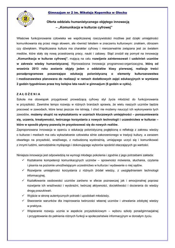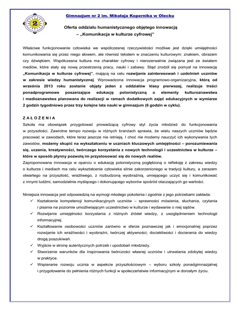 Gimnazjum nr 2 im. Mikołaja Kopernika w Olecku Oferta oddziału humanistycznego objętego innowacją – „Komunikacja w kulturze cyfrowej” Właściwe funkcjonowanie człowieka we współczesnej rzeczywistości możliwe jest dzięki umiejętności komunikowania się przez niego słowem, ale również tekstem w znaczeniu kulturowym: znakiem, obrazem czy dźwiękiem. Współczesna kultura ma charakter cyfrowy i nierozerwalnie związana jest ze światem mediów, które stały się nową przestrzenią pracy, nauki i zabawy. Stąd zrodził się pomysł na innowację „Komunikacja w kulturze cyfrowej”, mającą na celu rozwijanie zainteresowań i uzdolnień uczniów w zakresie wiedzy humanistycznej. Wprowadzona innowacja programowo-organizacyjna, którą od września 2013 roku zostanie objęty jeden z oddziałów klasy pierwszej, realizuje treści ponadprogramowe poszerzające edukację polonistyczną o elementy kulturoznawstwa i medioznawstwa planowana do realizacji w ramach dodatkowych zajęć edukacyjnych w wymiarze 2 godzin tygodniowo przez trzy kolejne lata nauki w gimnazjum (6 godzin w cyklu). ZAŁOŻENIA Szkoła ma obowiązek przygotować prowadzącą cyfrowy styl życia młodzież do funkcjonowania w przyszłości. Zawrotne tempo rozwoju w różnych branżach sprawia, że wielu naszych uczniów będzie pracować w zawodach, które teraz jeszcze nie istnieją. I choć nie możemy nauczyć ich wykonywania tych zawodów, możemy skupić na wykształceniu w uczniach kluczowych umiejętności – porozumiewania się, uczenia, kreatywności, twórczego korzystania z nowych technologii i uczestnictwa w kulturze – które w sposób płynny pozwolą im przystosować się do nowych realiów. Zaproponowana innowacja w oparciu o edukację polonistyczną pogłębioną o refleksję z zakresu wiedzy o kulturze i mediach ma celu wykształcenie człowieka silnie zakorzenionego w tradycji kultury, a zarazem otwartego na przyszłość, wrażliwego, z rozbudzoną wyobraźnią, umiejącego uczyć się i komunikować z innymi ludźmi, samodzielnie myślącego i dokonującego wyborów spośród otaczających go wartości. Niniejsza innowacja jest odpowiedzią na wymogi młodego pokolenia i zgodnie z jego potrzebami zakłada: Kształcenie kompetencji komunikacyjnych uczniów – sprawności mówienia, słuchania, czytania i pisania na poziomie umożliwiającym uczestnictwo w kulturze i wydawanie o niej sądów. Rozwijanie umiejętności korzystania z różnych źródeł wiedzy, z uwzględnieniem technologii informacyjnej. Kształtowanie osobowości uczniów zarówno w sferze poznawczej jak i emocjonalnej poprzez rozwijanie ich wrażliwości i wyobraźni, twórczej aktywności, dociekliwości i docierania do wiedzy drogą poszukiwań. Wyjście w stronę autentycznych potrzeb i upodobań młodzieży. Stworzenie warunków dla inspirowania twórczości własnej uczniów i utrwalania zdobytej wiedzy w praktyce. Wspieranie rozwoju ucznia w aspekcie przyszłościowym – wyboru szkoły ponadgimnazjalnej i przygotowanie do pełnienia różnych funkcji w społeczeństwie informacyjnym w dorosłym życiu. Gimnazjum nr 2 im. Mikołaja Kopernika w Olecku REKRUTACJA Kryterium przyjęcia do oddziału humanistycznego będą: co najmniej dobre oceny uzyskane przez kandydata w I półroczu roku szkolnego 2012/2013 z przedmiotów: język polski (bdb – 5 punków, db – 4 punkty) historia (bdb – 3 punkty, db – 2 punkty) informatyka (bdb – 2 punkty, db – 1 punkt); bardzo dobry (10 punktów) lub dobry (6 punktów) wynik ze sprawdzianu uzdolnień kierunkowych, który nie ocenia wiedzy kandydatów, a jego umiejętności językowe oraz możliwości twórczej pracy z tekstem (sprawdzian odbędzie 11 kwietnia 2013 roku, o godzinie 15.00 w siedzibie gimnazjum); osiągnięcia w konkursach wiedzy oraz w konkursach przedmiotowych z zakresu języka polskiego bądź historii, które w przypadku finalistów bądź laureatów zwalniają kandydata z przystępowania do sprawdzianu uzdolnień kierunkowych. O przyjęciu kandydata do oddziału humanistycznego decyduje uzyskana przez niego liczba punktów (maksymalnie można zdobyć 20 punktów) przyznana mu przez komisję rekrutacyjną na podstawie ocen z przedmiotów branych pod uwagę w procesie rekrutacji i wyników sprawdzianu uzdolnień kierunkowych. Ponadto kandydat do klasy I oddziału humanistycznego zobowiązany jest do: złożenia w sekretariacie szkoły karty zgłoszenia kandydata do oddziału humanistycznego w terminie do 5 kwietnia 2013 roku wraz z: pisemnym oświadczeniem woli rodziców (prawnych opiekunów), potwierdzającym wolę podjęcia nauki ich dziecka w oddziale humanistycznym (wzór do pobrania na stronie www.gim2.olecko.edu.pl /zakładka: Nabór na rok szkolny 2013/2014); aktualnym zdjęciem legitymacyjnym podpisanym na odwrocie (imię, nazwisko, data urodzenia); oryginałem świadectwa ukończenia szkoły podstawowej w terminie od 29 czerwca do 3 lipca 2013 roku; kopią opinii poradni psychologiczno-pedagogicznej stwierdzającą specyficzne trudności w uczeniu się (np. dysleksja, dysortografia, dysgrafia, itd.); zaświadczeniem OKE o wyniku sprawdzianu przeprowadzonego w ostatnim roku nauki w szkole podstawowej w terminie od 29 czerwca do 3 lipca 2013 roku; Kartę zgłoszenie kandydata do oddziału humanistycznego klasy I gimnazjum na rok szkolny 2013/2014 można pobrać na stronie www.gim2.olecko.edu.pl /zakładka: Nabór na rok szkolny 2013/2014 lub w sekretariacie Gimnazjum nr 2 im. Mikołaja Kopernika w Olecku. Mamy nadzieję, że innowacja – „Komunikacja w kulturze cyfrowej” – skłoni do współpracy z nami młodzież twórczą i szczególnie zainteresowaną uczestnictwem w kulturze. Szukamy osób niezależnych myślowo, mających „artystyczną duszę”, otwartych na otaczający nas świat i nieobojętnych na zachodzące w nim zmiany. Liczymy na kandydatów, którzy świadomie wybierając nasz program, chcą być nie tylko konsumentami k