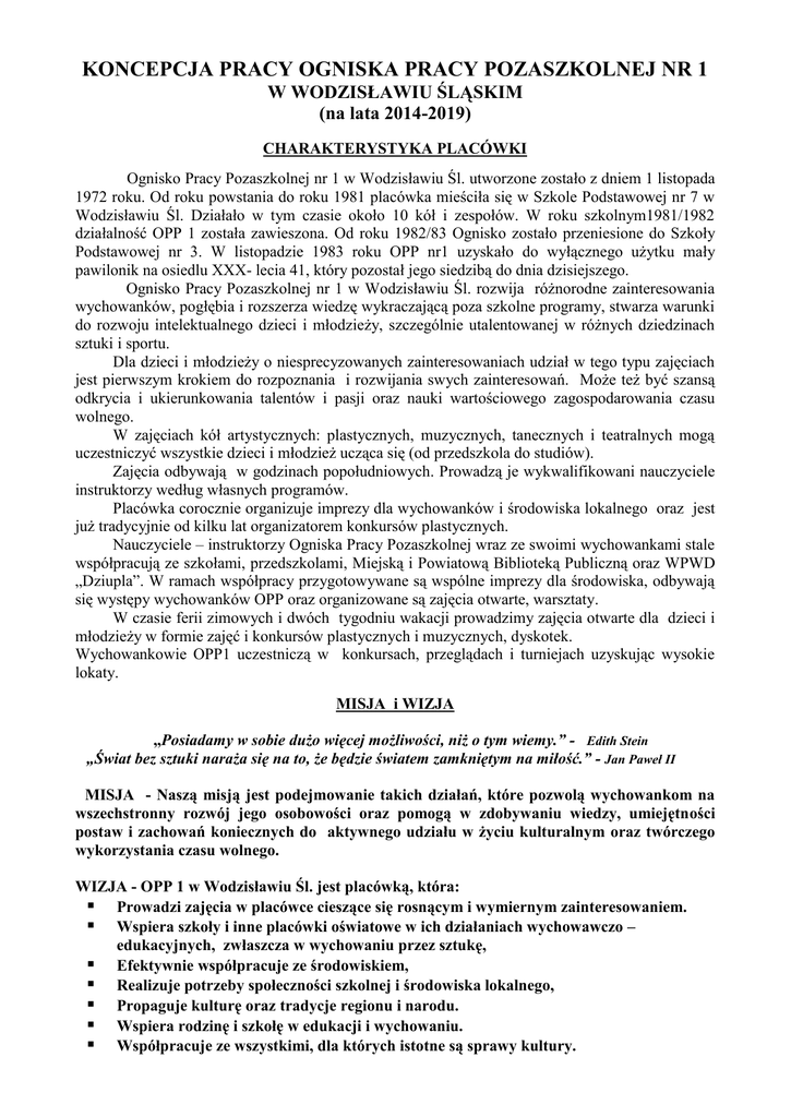 KONCEPCJA PRACY OGNISKA PRACY POZASZKOLNEJ NR 1 W WODZISŁAWIU ŚLĄSKIM (na lata 2014-2019) CHARAKTERYSTYKA PLACÓWKI Ognisko Pracy Pozaszkolnej nr 1 w Wodzisławiu Śl. utworzone zostało z dniem 1 listopada 1972 roku. Od roku powstania do roku 1981 placówka mieściła się w Szkole Podstawowej nr 7 w Wodzisławiu Śl. Działało w tym czasie około 10 kół i zespołów. W roku szkolnym1981/1982 działalność OPP 1 została zawieszona. Od roku 1982/83 Ognisko zostało przeniesione do Szkoły Podstawowej nr 3. W listopadzie 1983 roku OPP nr1 uzyskało do wyłącznego użytku mały pawilonik na osiedlu XXX- lecia 41, który pozostał jego siedzibą do dnia dzisiejszego. Ognisko Pracy Pozaszkolnej nr 1 w Wodzisławiu Śl. rozwija różnorodne zainteresowania wychowanków, pogłębia i rozszerza wiedzę wykraczającą poza szkolne programy, stwarza warunki do rozwoju intelektualnego dzieci i młodzieży, szczególnie utalentowanej w różnych dziedzinach sztuki i sportu. Dla dzieci i młodzieży o niesprecyzowanych zainteresowaniach udział w tego typu zajęciach jest pierwszym krokiem do rozpoznania i rozwijania swych zainteresowań. Może też być szansą odkrycia i ukierunkowania talentów i pasji oraz nauki wartościowego zagospodarowania czasu wolnego. W zajęciach kół artystycznych: plastycznych, muzycznych, tanecznych i teatralnych mogą uczestniczyć wszystkie dzieci i młodzież ucząca się (od przedszkola do studiów). Zajęcia odbywają w godzinach popołudniowych. Prowadzą je wykwalifikowani nauczyciele instruktorzy według własnych programów. Placówka corocznie organizuje imprezy dla wychowanków i środowiska lokalnego oraz jest już tradycyjnie od kilku lat organizatorem konkursów plastycznych. Nauczyciele – instruktorzy Ogniska Pracy Pozaszkolnej wraz ze swoimi wychowankami stale współpracują ze szkołami, przedszkolami, Miejską i Powiatową Biblioteką Publiczną oraz WPWD „Dziupla”. W ramach współpracy przygotowywane są wspólne imprezy dla środowiska, odbywają się występy wychowanków OPP oraz organizowane są zajęcia otwarte, warsztaty. W czasie ferii zimowych i dwóch tygodniu wakacji prowadzimy zajęcia otwarte dla dzieci i młodzieży w formie zajęć i konkursów plastycznych i muzycznych, dyskotek. Wychowankowie OPP1 uczestniczą w konkursach, przeglądach i turniejach uzyskując wysokie lokaty. MISJA i WIZJA „Posiadamy w sobie dużo więcej możliwości, niż o tym wiemy.” - Edith Stein „Świat bez sztuki naraża się na to, że będzie światem zamkniętym na miłość.” - Jan Paweł II MISJA - Naszą misją jest podejmowanie takich działań, które pozwolą wychowankom na wszechstronny rozwój jego osobowości oraz pomogą w zdobywaniu wiedzy, umiejętności postaw i zachowań koniecznych do aktywnego udziału w życiu kulturalnym oraz twórczego wykorzystania czasu wolnego. WIZJA - OPP 1 w Wodzisławiu Śl. jest placówką, która: Prowadzi zajęcia w placówce cieszące się rosnącym i wymiernym zainteresowaniem. Wspiera szkoły i inne placówki oświatowe w ich działaniach wychowawczo – edukacyjnych, zwłaszcza w wychowaniu przez sztukę, Efektywnie współpracuje ze środowiskiem, Realizuje potrzeby społeczności szkolnej i środowiska lokalnego, Propaguje kulturę oraz tradycje regionu i narodu. Wspiera rodzinę i szkołę w edukacji i wychowaniu. Współpracuje ze wszystkimi, dla których istotne są sprawy kultury. Stwarza możliwości wszechstronnego rozwoju osobowości, wrażliwości i kreatywności, zainteresowań, uzdolnień i umiejętności, przygotowując świadomych odbiorców kultury. GŁÓWNE ZAŁOŻENIA KONCEPCJI Stawiając na jakość działań edukacyjnych proponowanych przez OPP1dzieciom i młodzieży oraz biorąc pod uwagę możliwości kadrowe, bazowe i finansowe placówka wyznaczana stepujące cele: Zapewnienie dzieciom i młodzieży, możliwości czynnego udziału w wartościowych artystycznie, społecznie i wychowawczo różnorodnych formach działalności placówki; Zaangażowanie całej społeczności placówki w realizację wspólnych celów; Dbanie o odpowiednią strukturę organizacyjną i procedury funkcjonowania placówki; Program pracy placówki, uwzględniający potrzeby, oczekiwania i możliwości wychowanków; Doskonalenie i rozwój zawodowy kadry stosowny do edukacyjnych i organizacyjnych potrzeb placówki oraz stabilność kadry; Wysoki stopień zaangażowania i pomoc rodziców; Otwartość na współpracę z innymi placówkami oświatowymi i środowiskiem lokalnym; Promowanie własnych działań i ich efektów; Rozbudowę i modernizację bazy oraz wyposażenia placówki. DOKUMENTY WSPIERAJĄCE KONCEPCJĘ TO: Plan nadzoru pedagogicznego; Arkusz organizacyjny; Plan pracy placówki; Program wychowawczy i profilaktyczny; Statut OPP1. Plan imprez i współpracy ze środowiskiem AKTY PRAWNE Ustawa z dnia 7 września 1991 r. o systemie oświaty (Dz. U. 2004 nr 256, poz.2572 ze zm.) Ustawa z dnia 26 stycznia 1982 r. - Karta Nauczyciela ( Dz. U. 2006 nr 97, poz. 674 ze zm.) Rozporządzenie Ministra Edukacji narodowej z dnia 7 października 2009 w sprawie nadzoru pedagogicznego (Dz. U 2009 nr 168, poz.1324) Rozporządzenie Ministra Edukacji Narodowej z dnia 10 maja 2013 r. zmieniające rozporządzenie w sprawie nadzoru pedagogicznego Rozporządzenie Ministra Edukacji Narodowej z dnia 12 maja 2011 r. w sprawie rodzajów i szczegółowych zasad działania placówek publicznych, warunków pobytu dzieci i młodzieży w tych placówkach oraz wysokości i zasad odpłatności wnoszonej przez rodziców za pobyt ich dzieci w tych placówkach (Dz. U. z 2011 r., Nr 109, poz. 631) Rozporządzenie Ministra Edukacji Narodowej i Sportu z dnia 7 marca 2005 r. w sprawie ramowych statutów placówek publicznych (Dz.U. z 2005 r., Nr 52, poz. 466 EWALUACJA Ewaluacja zaproponowanej koncepcji odbywać się będzie na podstawie: analizy wniosków wynikających z nadzoru pedagogicznego; ewaluacji wewnętrznych i z