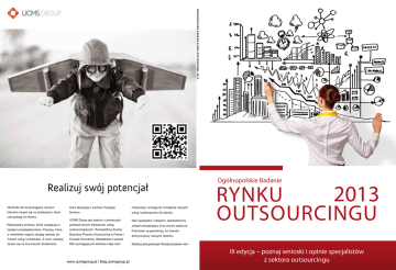 O g ó l n o p o l s k i e B a da n i e Ryn k u O u t s o u r c i n g u 2013 Realizuj swój potencjał Od blisko 20 lat pomagamy naszym które decydują o wartości Twojego motywację i energię do rozwijania naszych klientom skupić się na działaniach, które biznesu. usług i podnoszenia ich jakości. UCMS Group jest jednym z pierwszych Nasi specjaliści i eksperci, doświadczony Realizujemy procesy, które występują w profesjonalnych dostawców usług zespół zarządzający oraz mocne zaplecze każdym przedsiębiorstwie. Procesy, które outsourcingowych. Rozwijaliśmy branżę finansowe są gwarancją, że zawsze w niewielkim stopniu dodają wartość do Business Process Outsourcing w Polsce i Twoich usług i produktów. Z nami, możesz Europie Centralnej. Współpraca z ponad skupić się na kluczowych działaniach, 600 wymagającymi klientami daje nam uskrzydlają ich biznes. www.ucmsgroup.pl / blog.ucmsgroup.pl Ogólnopolskie Badanie 2013 Rynku Outsourcingu dotrzymujemy naszych obietnic. Realizuj swój potencjał. Resztę pozostaw nam. III edycja – poznaj wnioski i opinie specjalistów z sektora outsourcingu Payroll consulting Administracja wynagrodzeniami Zarzàdzanie dokumentacjà personalnà Pracownicy tymczasowi Konsultacje z zakresu prawa pracy Zalety wspó∏pracy: • Prawid∏owoÊç i terminowoÊç prowadzonych procesów personalnych. • Dost´p do nowoczesnych narz´dzi informatycznych. • Sta∏y dost´p do danych personalnych pracowników. • Profesjonalna reprezentacja w kontaktach z urz´dami przeprowadzajàcymi kontrole. • PoufnoÊç i bezpieczeƒstwo informacji. • Dost´p do aktualnej wiedzy z zakresu prawa pracy i ubezpieczeƒ spo∏ecznych. • Wsparcie dzia∏u HR w relacjach z pracownikami i zarzàdem. HRK S.A. • pl. Bankowy 2, 00-095 Warszawa • tel. +48 600 361 326 • e-mail: [email protected] • www.hrk.eu spis treści Plebiscyt Rzetelny Outsourcer 2 3 6 9 12 15 Grant Thornton Frąckowiak FK Partner Sellpoint MS Services HRK 18 Geneza Badania 41 Wybrać dostawcę z głową Sprawne narzędzia = skuteczne działania Outsourcing kadrowo-płacowy 47 Rola firmy outsourcingowej Przyszłość sektora 53 29 Outsourcing Zarządzania Finansami Rynek Outsourcingu w Polsce Kto zleca? Sektor B2B bardziej świadomy swoich potrzeb Brak doświadczenia, redukcja kosztów i koncentracja na core business – podstawowymi czynnikami w podejmowaniu decyzji o rozpoczęciu współpracy Więcej środków w krajowym portfelu na usługi outsourcingu? Niekoniecznie Ile firm zmieni dostawcę w przyszłym roku i dlaczego? Obszar współpracy Język korzyści 56 Outsourcing Usług IT Top lista usług IT Zarządzanie infrastrukturą IT Szeroki wachlarz usług IT cieszy się rosnącym zainteresowaniem 59 Outsourcing Sił Sprzedaży Blisko 1/3 ankietowanych prowadzi sprzedaż zewnętrzną Ekspansywna polityka sprzedaży celem polskich przedsiębiorstw Co jest największą zaletą outsourcingu sprzedaży? 37 Outsourcing Kontroli Jakości Jakość zawsze w cenie Oszczędność a wzrost Narzędzia przyspieszające rozwój Poznaj naszych ekspertów 20 Outsourcing Księgowości Outsourcing Usług HR Dojrzałość wyboru Dobra ocena potencjału Istota rzeczy usług HR 63 Outsourcing Back-Office Zlecanie usług back-office Outsourcing Call/Contact Center Outsourcing działu back-office w działach Co zlecamy i dlaczego? Sprawdzone korzyści Relacje przyszłości Outsourcing działu back-office w dziale obsługi marketingu – podział na branże klienta – podział na branże Ogólnopolskie Badanie Rynku Outsourcingu 2013 ADRES REDAKCJI: ul. Polska 13, 60-595 Poznań tel. (61) 66 83 116, fax (61) 66 55 806 KOORDYNATOR PROJEKTU: Krzysztof Kogut Redakcja: Beata Święcicka Krzysztof Kogut Anna Waligóra Biuro reklamy: Katarzyna Wojtczak [email protected] Mirella Szerszunowicz [email protected] SERWIS ZDJĘCIOWY: Fotolia PROMOCJA: Maria Kozerska [email protected] NAKŁAD: 5000 egz. REDAKTOR TECHNICZNy: Piotr Korytowski [email protected] DTP: P76 Advertising DRUK: CGS WYDAWCA: FORUM Press Sp. z o.o. ul. Polska 13, 60-595 Poznań tel. (61) 66 83 116 fax (61) 66 55 806 PREZES ZARZĄDU: Magdalena Balanicka Ogólnopolskie Badanie Rynku Outsourcingu 2013 | RAPORT 1 Rzetelny Outsourcer pięciu rzetelnych Poznaj laureatów plebiscytu Rzetelny Outsourcer 2013 Z lecenie zewnętrznej firmie części własnej działalności jest dla wielu przedsiębiorców sporym wyzwaniem. Natomiast te podmioty, które przywykły do tego rodzaju współpracy i rozumieją zasady jej działania, zazwyczaj są zadowolone z efektów końcowych. Outsourcing usług jest bowiem jednym z najprostszych i stosunkowo niedrogim sposobem poprawiania profesjonalizmu, wydajności oraz wyników określonych działów. Obecnie zlecić można obsługę praktycznie każdego działu w dowolnej formie. Sztuką jest jednak znaleźć i pracować ramię w ramię z profesjonalistami, którzy na co dzień będą traktować nasz interes jak swój własny. Specjalnie dla firm poszukujących pewnych partnerów biznesowych, na miarę naszych czasów, przygotowaliśmy III edycję plebiscytu „Rzetelny Outsourcer 2013”. To szczególna nagroda przyznawana podczas VII Ogólnopolskiego Kongresu Facility Management 2013. W tym roku statuetki „Rzetelnego Outsourcera” otrzyma 5 firm. Ich działalność ocenili sami klienci, którzy podsumowali wieloletnią współpracę na polu realizacji podpisanych kontraktów. Pod uwagę brane były również takie aspekty, jak elastyczność w podejściu do wykonywania powierzonych obowiązków, postępowanie w trakcie wdrażania usług, łatwość nawiązywania kontaktów, wymiana informacji oraz poziom realizacji wyznaczonych celów. Ocenie podlegała też jakość świadczonych usług, ich innowacyjność, dopasowanie do potrzeb klienta oraz zrozumienie jego potrzeb. Nie bez znaczenia było także kreatywne podejście usługodawców do rozwiązywania zaawansowanych problemów oraz stosunek ceny do j