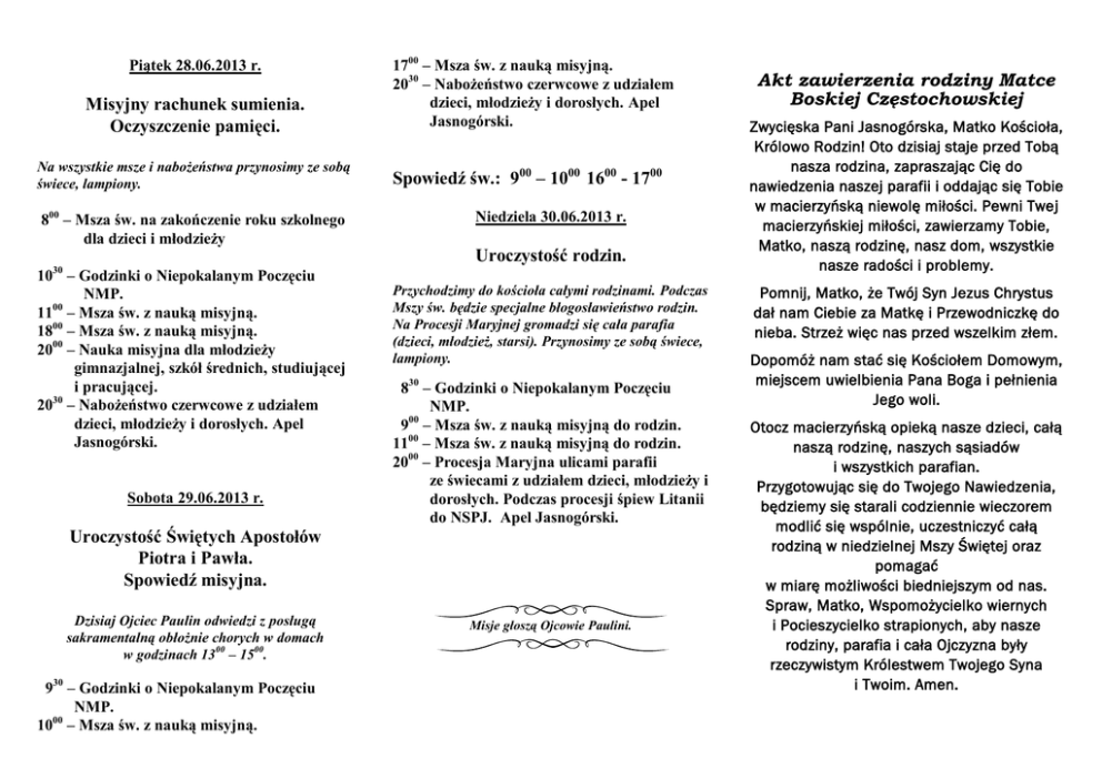 Piątek 28.06.2013 r. Misyjny rachunek sumienia. Oczyszczenie pamięci. Na wszystkie msze i nabożeństwa przynosimy ze sobą świece, lampiony. 800 – Msza św. na zakończenie roku szkolnego dla dzieci i młodzieży 1030 – Godzinki o Niepokalanym Poczęciu NMP. 1100 – Msza św. z nauką misyjną. 1800 – Msza św. z nauką misyjną. 2000 – Nauka misyjna dla młodzieży gimnazjalnej, szkół średnich, studiującej i pracującej. 30 20 – Nabożeństwo czerwcowe z udziałem dzieci, młodzieży i dorosłych. Apel Jasnogórski. Sobota 29.06.2013 r. 1700 – Msza św. z nauką misyjną. 2030 – Nabożeństwo czerwcowe z udziałem dzieci, młodzieży i dorosłych. Apel Jasnogórski. Spowiedź św.: 900 – 1000 1600 - 1700 Niedziela 30.06.2013 r. Uroczystość rodzin. Przychodzimy do kościoła całymi rodzinami. Podczas Mszy św. będzie specjalne błogosławieństwo rodzin. Na Procesji Maryjnej gromadzi się cała parafia (dzieci, młodzież, starsi). Przynosimy ze sobą świece, lampiony. 830 – Godzinki o Niepokalanym Poczęciu NMP. 00 9 – Msza św. z nauką misyjną do rodzin. 1100 – Msza św. z nauką misyjną do rodzin. 2000 – Procesja Maryjna ulicami parafii ze świecami z udziałem dzieci, młodzieży i dorosłych. Podczas procesji śpiew Litanii do NSPJ. Apel Jasnogórski. Uroczystość Świętych Apostołów Piotra i Pawła. Spowiedź misyjna. Dzisiaj Ojciec Paulin odwiedzi z posługą sakramentalną obłożnie chorych w domach w godzinach 1300 – 1500. 930 – Godzinki o Niepokalanym Poczęciu NMP. 1000 – Msza św. z nauką misyjną. Misje głoszą Ojcowie Paulini. Akt zawierzenia rodziny Matce Boskiej Częstochowskiej Zwycięska Pani Jasnogórska, Matko Kościoła, Królowo Rodzin! Oto dzisiaj staje przed Tobą nasza rodzina, zapraszając Cię do nawiedzenia naszej parafii i oddając się Tobie w macierzyńską niewolę miłości. Pewni Twej macierzyńskiej miłości, zawierzamy Tobie, Matko, naszą rodzinę, nasz dom, wszystkie nasze radości i problemy. Pomnij, Matko, że Twój Syn Jezus Chrystus dał nam Ciebie za Matkę i Przewodniczkę do nieba. Strzeż więc nas przed wszelkim złem. Dopomóż nam stać się Kościołem Domowym, miejscem uwielbienia Pana Boga i pełnienia Jego woli. Otocz macierzyńską opieką nasze dzieci, całą naszą rodzinę, naszych sąsiadów i wszystkich parafian. Przygotowując się do Twojego Nawiedzenia, będziemy się starali codziennie wieczorem modlić się wspólnie, uczestniczyć całą rodziną w niedzielnej Mszy Świętej oraz pomagać w miarę możliwości biedniejszym od nas. Spraw, Matko, Wspomożycielko wiernych i Pocieszycielko strapionych, aby nasze rodziny, parafia i cała Ojczyzna były rzeczywistym Królestwem Twojego Syna i Twoim. Amen. NAWIEDZENIE „Maryjo prowadź nas drogą wiary” Poniedziałek 1.07.2013 r. Uroczystość powitania Maryi. 1630 – Nabożeństwo oczekiwania i procesja na miejsce powitania. 1700 – Powitanie Matki Bożej i procesja do kościoła. Msza św. koncelebrowana pod przewodnictwem Księdza Biskupa. 1900 – Czuwanie: Kół Żywego Różańca 2100 – Apel Jasnogórski. 2200 – Czuwanie młodzieży. 2300 – Modlitwy za zmarłych. 800 – Msza św. dla chorych i ludzi w podeszłym wieku. Sakrament Namaszczenia Chorych. 930 – Msza św. dla młodzieży gimnazjalnej, szkół średnich, studiującej i pracującej. 1100 – Msza św. i specjalne błogosławieństwo niemowląt, dzieci przedszkolnych i szkolnych klas 0-VI. 30 12 – Czuwanie –Ogrodowa,Sosnowa,Leśna 1330 – Czuwanie –Osiedlowa,Welska,Cicha 1500 – Msza św. na zakończenie Nawiedzenia. Poświęcenie obrazów Matki Bożej Jasnogórskiej do naszych mieszkań. Liturgia pożegnania. MISJE NAWIEDZENIA 28-30.06.2013 r. NAWIEDZENIE OBRAZU MATKI BOŻEJ JASNOGÓRSKIEJ 1-2.07.2013 r. Wtorek 2.07.2013 r. Uroczystość czuwania z Maryją. 2400 – Pasterka Maryjna celebrowana przez kapłanów pochodzących z naszej parafii i tych, którzy tutaj pracowali. 100 – Czuwanie – Kaczek,Piaskowa 200 – Czuwanie –Bratian wyb. pod Rakowice 300 – Czuwanie – Bratian–Góry,Długa,Wąska 400 – Czuwanie – Olsztyńska,Polna 500 – Czuwanie – Grunwaldzka,Podgórna 600 – Czuwanie – Okrężna,Górna,Zatorze 700 – Czuwanie – Sportowa,Krótka,Kościelna 800 – Czuwanie – Mlyńska,Zamkowa,Kręta 730 – Godzinki o Niepokalanym Poczęciu NMP. Misje głoszą Ojcowie Paulini. Parafia Św. Brata Alberta Chmielowskiego BRATIAN