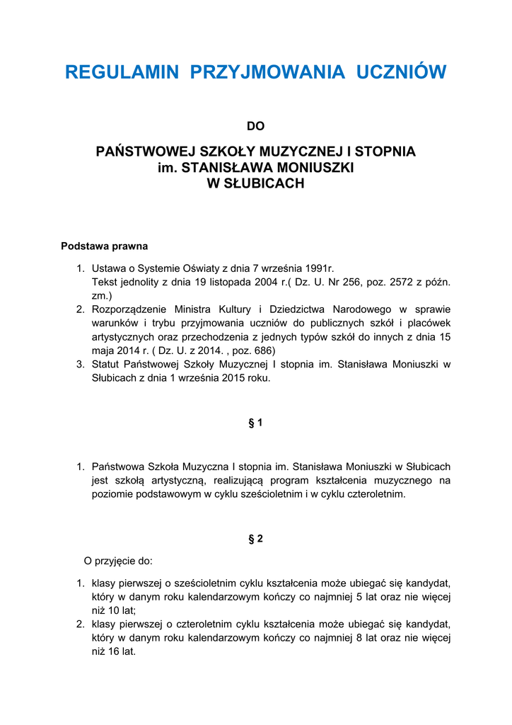 REGULAMIN PRZYJMOWANIA UCZNIÓW DO PAŃSTWOWEJ SZKOŁY MUZYCZNEJ I STOPNIA im. STANISŁAWA MONIUSZKI W SŁUBICACH Podstawa prawna 1. Ustawa o Systemie Oświaty z dnia 7 września 1991r. Tekst jednolity z dnia 19 listopada 2004 r.( Dz. U. Nr 256, poz. 2572 z późn. zm.) 2. Rozporządzenie Ministra Kultury i Dziedzictwa Narodowego w sprawie warunków i trybu przyjmowania uczniów do publicznych szkół i placówek artystycznych oraz przechodzenia z jednych typów szkół do innych z dnia 15 maja 2014 r. ( Dz. U. z 2014. , poz. 686) 3. Statut Państwowej Szkoły Muzycznej I stopnia im. Stanisława Moniuszki w Słubicach z dnia 1 września 2015 roku. §1 1. Państwowa Szkoła Muzyczna I stopnia im. Stanisława Moniuszki w Słubicach jest szkołą artystyczną, realizującą program kształcenia muzycznego na poziomie podstawowym w cyklu sześcioletnim i w cyklu czteroletnim. §2 O przyjęcie do: 1. klasy pierwszej o sześcioletnim cyklu kształcenia może ubiegać się kandydat, który w danym roku kalendarzowym kończy co najmniej 5 lat oraz nie więcej niż 10 lat; 2. klasy pierwszej o czteroletnim cyklu kształcenia może ubiegać się kandydat, który w danym roku kalendarzowym kończy co najmniej 8 lat oraz nie więcej niż 16 lat. §3 Szkoła prowadzi dla kandydatów nieodpłatnie : a) poradnictwo obejmujące w szczególności informowanie o warunkach rekrutacji, programie kształcenia i warunkach nauki w szkole; b) wstępne badania uzdolnień kandydatów i określa celowość wyboru przez kandydata zakresu kształcenia, c) w zależności od potrzeb działalność konsultacyjną, w szczególności w formie zajęć praktycznych i kursów przygotowawczych. §4 1. Rodzice lub prawni opiekunowie kandydata ubiegający się przyjęcie do szkoły składają w sekretariacie szkoły, w terminie od kwietnia do dnia ogłoszenia terminu przesłuchań w danym roku szkolnym, wniosek o przyjęcie do szkoły. 2. Do wniosku należy dołączyć: a)w przypadku dziecka, które w danym roku kalendarzowym nie ukończyło 6 lat – opinię poradni psychologiczno – pedagogicznej o psychofizycznej dojrzałości dziecka do podjęcia nauki szkolnej; 3. Szkoła, w zależności od kierunku kształcenia , może zażądać dołączenia do wniosku zaświadczenia o braku przeciwskazań zdrowotnych do podjęcia kształcenia, wydanego przez lekarz specjalistę właściwego ze względu na zakres kształcenia w danej specjalności. §5 1. Dla kandydatów do szkoły przeprowadza się badanie przydatności. 2. Dokładną datę badania przydatności ustala dyrektor szkoły. §6 1. Badanie przydatności kandydatów polega na sprawdzeniu uzdolnień muzycznych i predyspozycji do nauki gry na określonym instrumencie, ze szczególnym uwzględnieniem słuchu wysokościowego, harmonicznego, pamięci muzycznej, poczucia rytmu oraz warunków psychofizycznych kandydata. 2. Sposób i zakres badania przydatności kandydatów ustala komisja. 3. Badanie przydatności kandydatów obejmuje: - zaprezentowanie własnej piosenki lub piosenki z zajęć przygotowawczych, jeżeli takie są organizowane w danym roku szkolnym, - badanie słuchu wysokościowego ( powtarzanie głosem pojedynczych dźwięków oraz krótkich wzorów melodyczno-rytmicznych, rozróżnianie dźwięków wysokich, średnich i niskich, rozpoznanie rejestrów brzmieniowych, określenie kierunków przebiegu melodii), - badanie słuchu harmonicznego ( śpiewanie dźwięków składowych akordów, rozpoznawanie ilości usłyszanych dźwięków), - badanie pamięci muzycznej ( porównanie dwóch usłyszanych melodii ), - badanie poczucia tonalnego ( kończenie melodii, rozróżnianie melodii wesołej i smutnej ), - powtarzanie schematów rytmicznych, - badanie warunków psychofizycznych, zdolności ruchowych i manualnych, - prezentacja przygotowanego programu ( dotyczy uczniów z przygotowaniem muzycznym lub ubiegających się o przyjęcie do klasy programowo wyższej). 4. Wszyscy kandydaci ubiegający się o przyjęcie na dany cykl kształcenia wykonują te same zadania. §7 1. W celu przeprowadzenia rekrutacji do klasy pierwszej ( na semestr pierwszy, pierwszy rok kształcenia ) dyrektor szkoły powołuje spośród nauczycieli komisję rekrutacyjną, wyznacza jej skład i przewodniczącego oraz określa zadania członków komisji. 2. Do zadań komisji należy w szczególności: a) Podanie do wiadomości kandydatom informacji o warunkach rekrutacji, z uwzględnieniem kryteriów przyjęć, b) Przeprowadzenie badania przydatności. 3. Z przebiegu badania przydatności komisja rekrutacyjna sporządza protokół badania przydatności, obejmujący w szczególności listę kandydatów , którzy przystąpili do badania przydatności oraz uzyskane przez nich oceny ( punktację) . 4. Na podstawie ocen ( punktacji ), o których mowa w ust. 3, komisja rekrutacyjna sporządza listę kandydatów, którzy uzyskali wynik kwalifikujący do przyjęcia do szkoły oraz przekazuje listę dyrektorowi szkoły. 5. Protokół, o którym mowa w ust. 3, jest przechowywany w szkole przez okres kształcenia ucznia w szkole. §8 1. Dyrektor szkoły na podstawie wyniku kwalifikującego, o którym mowa w § 7 ust. 4, podejmuje decyzję o przyjęciu kandydata do szkoły. 2. W przypadku, gdy liczba kandydatów, którzy uzyskali wynik kwalifikujący, o którym mowa w § 7 ust. 4, jest większa niż liczba miejsc, dyrektor szkoły podejmuje decyzję o przyjęciu kandydata do szkoły z uwzględnieniem dodatkowych kryteriów: a) posiadanie przez kandydata własnego instrumentu, b) wyższa punktacja uzyskana z części badania przydatności w zakresie słuchu wysokościowego, c) stwierdzone predyspozycje kandydata do nauki gry na innym, wybranym przez szkołę instrumencie . 3. Ilość przyjęć na poszczególne instrumenty jest limitowana. 4. Dyrektor szkoły ogłasza listę kandydatów przyjętych do szkoły w terminie do dnia zakończenia zajęć dydaktyczno – wychowawczych w szkole. §9 1. Dopuszcza się mo