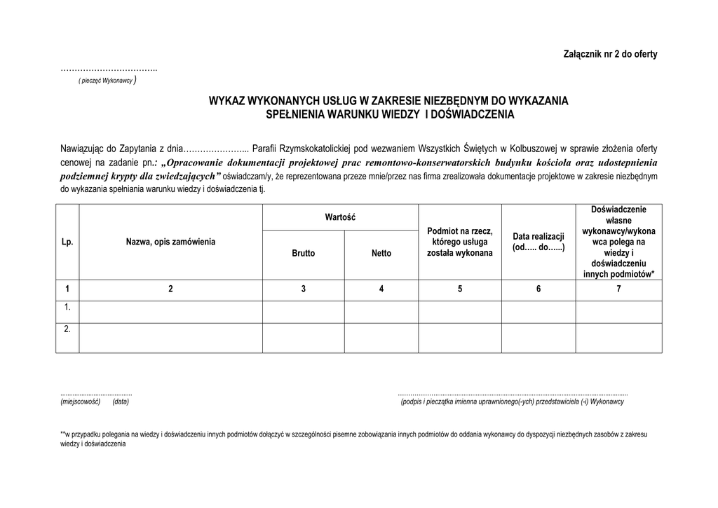 Załącznik nr 2 do oferty …………………………….. ( pieczęć Wykonawcy ) WYKAZ WYKONANYCH USŁUG W ZAKRESIE NIEZBĘDNYM DO WYKAZANIA SPEŁNIENIA WARUNKU WIEDZY I DOŚWIADCZENIA Nawiązując do Zapytania z dnia…………………... Parafii Rzymskokatolickiej pod wezwaniem Wszystkich Świętych w Kolbuszowej w sprawie złożenia oferty cenowej na zadanie pn.: „Opracowanie dokumentacji projektowej prac remontowo-konserwatorskich budynku kościoła oraz udostepnienia podziemnej krypty dla zwiedzających” oświadczam/y, że reprezentowana przeze mnie/przez nas firma zrealizowała dokumentacje projektowe w zakresie niezbędnym do wykazania spełniania warunku wiedzy i doświadczenia tj. Data realizacji (od….. do…...) Doświadczenie własne wykonawcy/wykona wca polega na wiedzy i doświadczeniu innych podmiotów* 6 7 Wartość Lp. Brutto Netto Podmiot na rzecz, którego usługa została wykonana 3 4 5 Nazwa, opis zamówienia 1 2 1. 2. ......................................... (miejscowość) (data) ……………….............................................................................................................. (podpis i pieczątka imienna uprawnionego(-ych) przedstawiciela (-i) Wykonawcy **w przypadku polegania na wiedzy i doświadczeniu innych podmiotów dołączyć w szczególności pisemne zobowiązania innych podmiotów do oddania wykonawcy do dyspozycji niezbędnych zasobów z zakresu wiedzy i doświadczenia