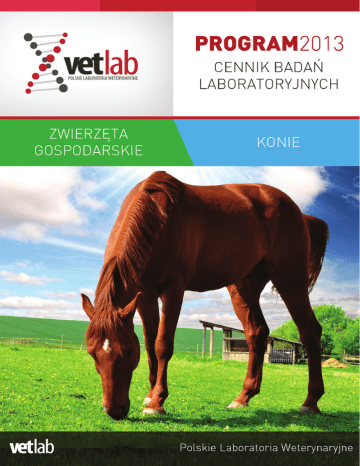 2 PROGRAM2013 Spis Treści | Zwierzęta Gospodarskie Preanalityka4 Czynniki fałszujące wynik badania laboratoryjnego 7 Materiał do badań biochemicznych 8 Sposób przeliczania jednostek 9 Możliwości dostarczania próbek do laboratorium 10 Kontrola jakości 10 Rozliczenia10 PROFILE12 HEMATOLOGIA14 BIOCHEMIA14 ELEKTROLITY I PIERWIASTKI 16 IMMUNOLOGIA17 MIKROBIOLOGIA17 MIKROBIOLOGIA OGÓLNA 17 MIKROBIOLOGIA KIERUNKOWA 18 MOCZ19 ELEKTROLITY I PIERWIASTKI W MOCZU 19 PARAZYTOLOGIA20 HISTOPATOLOGIA20 SEROLOGIA21 BYDŁO21 OWCE / KOZY 23 TRZODA CHLEWNA 24 DIAGNOSTYKA MOLEKULARNA (PCR) 27 PRZEŻUWACZE27 OWCE28 TRZODA CHLEWNA 28 METALE CIĘŻKIE 30 WITAMINY30 INDEKS53 CENNIK BADAŃ LABORATORYJNYCH WAŻNY OD 01.06.2013 CENNIK BADAŃ LABORATORYJNYCH Spis Treści | Konie Preanalityka4 Czynniki fałszujące wynik badania laboratoryjnego 7 Materiał do badań biochemicznych 8 Sposób przeliczania jednostek 9 Możliwości dostarczania próbek do laboratorium 10 Kontrola jakości 10 Rozliczenia10 PROFILE32 HEMATOLOGIA33 KOAGULOLOGIA33 BIOCHEMIA 33 ELEKTROLITY I PIERWIASTKI 35 HORMONY36 IMMUNOLOGIA38 MIKROBIOLOGIA38 MIKROBIOLOGIA OGÓLNA 39 MIKROBIOLOGIA KIERUNKOWA 40 MOCZ40 PARAZYTOLOGIA41 PŁYNY USTROJOWE 42 HISTOPATOLOGIA42 SEROLOGIA43 DIAGNOSTYKA MOLEKULARNA CZYNNIKÓW ZAKAŹNYCH (PCR) 44 DIAGNOSTYKA CHORÓB GENETYCZNYCH (PCR) 45 INNE OZNACZENIA Z UŻYCIEM PCR 46 UMASZCZENIE46 INNE BADANIA 47 WITAMINY48 METALE CIĘŻKIE, TOKSYKOLOGIA 49 POZOSTAŁOŚCI LEKÓW 49 DIAGNOSTYKA ALERGII 51 ODCZULANIE52 INDEKS53 CENNIK BADAŃ LABORATORYJNYCH WAŻNY OD 01.06.2013 3 4 PROGRAM2013 Preanalityka Podstawą miarodajnego i wiarygodnego wyniku badania laboratoryjnego jest prawidłowa preanalityka, na którą składa się odpowiednie przygotowanie pacjenta, pobranie materiału i jego dostarczenie do laboratorium. Ilość materiału Należy mieć na uwadze, że zazwyczaj istnieje minimalna ilość materiału, która ze względów technicznych jest niezbędna do wykonania badania. Pobieranie materiału Aby uzyskać miarodajne wyniki badań, krew do oznaczeń biochemiczno-hematologicznych należy pobierać od pacjenta na czczo. W innym wypadku wyniki takich parametrów jak leukocyty, cholesterol, glukoza, amylaza, AST, ALT, białko całkowite, bilirubina czy trójglicerydy mogą zostać zafałszowane. Podobnie jak spożycie pokarmu, tak intensywny wysiłek może wpłynąć na wynik następujących oznaczeń: CK, LDH, AST, glukoza. Najważniejsze elementy, na które należy zwrócić uwagę podczas pobierania krwi: 1. Stosowanie stazy - zaciśnięcie naczynia powinno trwać krótko i być w miarę możliwości delikatne. Niewłaściwe stosowanie stazy może doprowadzić do hemolizy oraz wpłynąć na parametry dotyczące układu krzepnięcia. 2. Miejsce wkłucia – należy je oczyścić i odkazić, mając jednocześnie na uwadze, że użycie zbyt dużej ilości środka odkażającego może doprowadzić do zanieczyszczenia próbki i np. hemolizy. 3. Objętość krwi pobranej do probówek z antykoagulantem - przekroczenie górnej wskazanej na probówkach granicy może doprowadzić do powstania skrzepów. Z kolei pobór zbyt małej objętości prowadzi do niewystarczającego wymieszania próbki z antykoagulantem i powstawania skrzepów lub do zbytniego rozcieńczenia próbki. 4. Strumień krwi należy kierować do probówki tak, aby krew się nie pieniła, czyli po ściance. Spienienie może powodować hemolizę. 5. Po pobraniu materiału, trzeba: • natychmiast delikatnie wymieszać krew z antykoagulantem przez obracanie probówki, dla uniknięcia powstania skrzepów i mikroskrzepów oraz spienienia • pozostawić krew pobraną na surowicę na 30 – 60 minut w temperaturze pokojowej aż do powstania skrzepu i po tym czasie, jeśli to możliwe próbkę odwirować, a surowicę przenieść do nowej probówki. Do próbki należy dołączyć wypełnione pismo przewodnie, które można znaleźć na naszej stronie internetowej. CENNIK BADAŃ LABORATORYJNYCH Rodzaje materiału do badania Surowica Jest to najbardziej uniwersalny materiał do większości badań biochemicznych, elektrolitów, serologicznych oraz hormonów. Najczęściej stosuje się probówki z „perełkami” lub z aktywatorami krzepnięcia. Osocze W nielicznych wypadkach, do oznaczeń wymagane jest osocze. W przypadku ACTH jest to osocze krwi pobranej na EDTA. Do oznaczenia kwasu mlekowego używa się osocza krwi pobranej na NaF lub KF. Do parametrów krzepliwości niezbędne jest osocze krwi pobranej na cytrynian (w stosunku 10:1). Krew pobrana na EDTA Jest to materiał szczególnie korzystny do badania hematologicznego. Równie dobrze nadaje się do badań genetycznych. Do innych oznaczeń może być wykorzystywana jedynie w nielicznych przypadkach ze względu na wpływ EDTA na poszczególne parametry, a zwłaszcza elektrolity. Krew pełna Jako materiał również może być wysyłana do laboratorium. Należy jednak mieć na uwadze, że w trakcie jej transportu może dojść do hemolizy, która może spowodować zafałszowanie niektórych parametrów. Mocz Najkorzystniejszy do badania jest mocz pozyskany na drodze cystocentezy. Jest to szczególnie ważne w przypadku badania bakteriologicznego, gdyż w moczu pobieranym ze strumienia może dojść do kontaminacji. Jeśli jednak istnieje tylko taka możliwość pobrania materiału, mocz należy pobrać ze środkowego strumienia po uprzednim umyciu okolicy moczo-płciowej. Kał Jeśli to możliwe należy nadesłać kał niezanieczyszczony, a więc najlepiej pobrany z prostnicy (zwłaszcza badania mikrobiologiczne). Do badań parazytologicznych zaleca się pobranie kału z kilku miejsc lub zbieranie kału z 3 dni. Materiał do badań mikrobiologicznych Materiał do badania mikrobiologicznego należy pobrać we wczesnym etapie choroby, najlepiej przed rozpoczęciem antybiotykoterapii. Pobrany materiał powinien być jak najszybciej przetransportowany do laboratorium, możliwie skrócony czas od pobrania do po