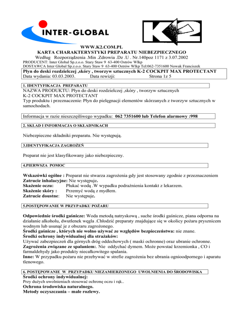 WWW.K2.COM.PL KARTA CHARAKTERYSTYKI PREPARATU NIEBEZPIECZNEGO Według Rozporządzenia .Min .Zdrowia .Dz .U . Nr.140poz 1171 z 3.07.2002 PRODUCENT: Inter Global Sp.z.o.o. Stary Staw 9 63-400 Ostrów Wlkp DOSTAWCA Inter Global Sp.z.o.o. Stary Staw 9 63-400 Ostrów Wlkp Tel:062-7351600 Nowak Franciszek Płyn do deski rozdzielczej ,skóry , tworzyw sztucznych K-2 COCKPIT MAX PROTECTANT Data wydania: 03.03.2003. Data rewizji: Strona 1z 5 1. IDENTYFIKACJA PREPARATU NAZWA PRODUKTU: Płyn do deski rozdzielczej ,skóry , tworzyw sztucznych K-2 COCKPIT MAX PROTECTANT Typ produktu i przeznaczenie: Płyn do pielęgnacji elementów skórzanych z tworzyw sztucznych w samochodach. Informacja w razie nieszczęśliwego wypadku: 062 7351600 lub Telefon alarmowy :998 2. SKŁAD I INFORMACJA O SKŁADNIKACH Niebezpieczne składniki preparatu. Nie występują. 3.IDENTYFIKACJA ZAGROŻEŃ Preparat nie jest klasyfikowany jako niebezpieczny. 4.PIERWSZA POMOC Wskazówki ogólne : Preparat nie stwarza zagrożenia gdy jest stosowany zgodnie z przeznaczeniem Zatrucie inhalacyjne: Nie występuje. Skażenie oczu: Płukać wodą .W wypadku podrażnienia kontakt z lekarzem. Skażenie skóry : Przemyć wodą z mydłem. Zatrucie doustne: Nie występuje. 5.POSTĘPOWANIE W PRZYPADKU POŻARU Odpowiednie środki gaśnicze: Woda metodą natryskową , suche środki gaśnicze, piana odporna na działanie alkoholu, dwutlenek węgla .Chłodzić preparaty znajdujące się w okolicy pożaru prysznicem wodnym lub usunąć je z obszaru zagrożonego. Środki gaśnicze , których nie wolno używać ze względów bezpieczeństwa: nie znane. Środki ochrony indywidualnej dla strażaków: Używać zabezpieczeń dla górnych dróg oddechowych ( maski ochronne) oraz ubranie ochronne. Zagrożenia związane ze spalaniem:. Nie oddychać dymem. Może powstać krzemionka , CO i farmaldehydy jako produkty niecałkowitego spalania. Inne: W przypadku pożaru nie przebywać w strefie zagrożenia bez ubrania ognioodpornego i aparatu tlenowego. 6. POSTĘPOWANIE W PRZYPADKU NIEZAMIERZONEGO UWOLNIENIA DO ŚRODOWISKA Środki ochrony indywidualnej: Przy dużych uwolnieniach stosować ochronę oczu i rąk.. Ochrona środowiska naturalnego. Metody oczyszczania – małe rozlewy. Płyn do deski rozdzielczej ,skóry , plastyków K-2 COCKPIT MAX PROTECTANT Strona 2z 5 Absorbować lub ograniczać ciecz piaskiem, ziemią, pakułami lub materiałem ograniczającym wyciek. Zebrać np.: łopatką i umieścić w oznakowanym , uszczelnionym pojemniku w celu odzyskania lub bezpiecznego usunięcia. Przeciekające kontenery umieścić w oznakowanych pojemnikach. Zmyć miejsca skażone wodą. Metody oczyszczania –duże rozlewy. Przenieść do oznakowanych , uszczelnionych pojemników w celu odzyskania lub bezpiecznego usunięcia. Pozostałość traktować jako mały rozlew. Inne informację: Nie dopuścić do przedostania się dużych ilości preparatu do ujęć wodnych i kanalizacji.. Duża ilość jednorazowa to 2000 litrów. . 7. POSTĘPOWANIE Z PREPARATEM I ICH MAGAZYNOWANIE Wskazówki odnośnie bezpiecznego obchodzenia się z produktem: Chronić przed kontaktem z oczami. Zapewnić wentylację ogólną. zabezpieczenie przed pożarem i wybuchem: Brak szczególnych zaleceń. Magazynowanie: -Wymogi odnośnie pomieszczeń magazynowych i warunków przechowywania: Chronić od silnych czynników utleniających. Inne uwagi odnośnie warunków przechowywania: Magazynować w suchym , krytym miejscu. Chronić przed bezpośrednim oddziaływaniem ciepła i promieniowania słonecznego . Chronić przed mrozem. Rodzaj opakowań: butelka o pojemności 700 ml, kanister 5L. 8. KONTROLA NARAŻENIA I ŚRODKI OCHRONY INDYWIDUALNEJ Kontrola narażenia: Wartości dopuszczalnych stężeńProdukt nie zawiera materiałów , których wartości graniczne musiałyby być kontrolowane pod kątem warunków miejsca pracy. Dodatkowe wskazówki odnośnie projektowania instalacji technicznych: Prawidłowe warunki pracy można zapewnić przez dobrą i skuteczną wentylację ogólną ( praca przy otwartych drzwiach samochodu przy dobrej wentylacji ogólnej). Osobiste wyposażenie ochronne: okulary i rękawicę ochronne. Ogólne środki ochrony i higieny: Należy przestrzegać typowych zasad ostrożności , wymaganych przy obchodzeniu się z substancjami chemicznymi. Podczas stosowania preparatu nie spożywać posiłków i napojów , nie palić tytoniu. Przestrzegać podstawowych zasad higieny. Po pracy , ręce umyć wodą z mydłem. Zaleca się stosowanie kremu ochronnego do skóry. Ochrona dróg oddechowych: Nie jest wymagana ochrona w przypadku dobrze wentylowanych pomieszczeń. Ochrona oczu i twarzy: Nie jest wymagana. 9.WŁAŚCIWOŚCI FIZYKOCHEMICZNE Stan fizyczny: Ciecz Barwa: Jasno niebieska Zapach: silikonu Temperatura zapłonu stop C: >250 (Metoda otwartego tygla) > 100 (Metoda zamkniętego tygla) Temperatura wrzenia stop C >35 Temperatura topnienia stop C < 0 Temperatura samozapłonu stop C: nie określa się Gęstość(woda=1)0,97 Rozpuszczalność: -Rozpuszczalność w wodzie ;Rozpuszczalny-Rozpuszczalny w innych mediach: brak danych. Wartość pH: 6-8 Płyn do deski rozdzielczej ,skóry , plastyków K-2 COCKPIT MAX PROTECTANT Strona 3z 5 10.STABILNOŚĆ I REAKTYWNOŚĆ Stabilność: Stabilny Warunki których należy unikać: Nie doprowadzać do przegrzewania wyżej niż 50 C Materiały których należy unikać: Przechowywać w suchych pomieszczeniach. Nie doprowadzać do kontaktu z sinymi utleniaczami. Niebezpieczne produkty rozkładu: patrz pkt 11 11.INFORMACJE TOKSYKOLOGICZNE Po narażeniu drogą oddechową :nie ma niekorzystnego wpływu przy normalnym stosowaniu. Po zanieczyszczeniu oczu: Może wywołać chwilowe zaburzenia.. Po zanieczyszczeniu skóry: nie ma niekorzystnego wpływu przy normalnym stosowaniu. Po spożyciu: nie ma niekorzystnego wpływu przy normalnym stosowaniu. Produkt przy podgrzaniu powyżej 150 stop C może wydzielać opary formaldehydów. Wdychanie skoncentrowanych opa