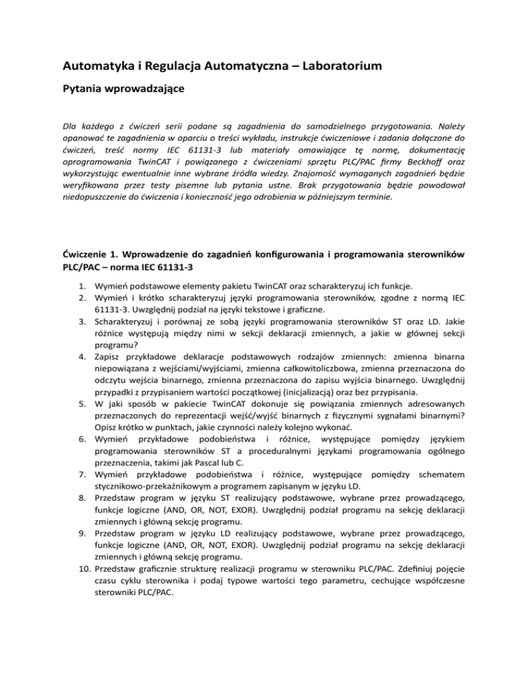 Automatyka i Regulacja Automatyczna – Laboratorium Pytania wprowadzające Dla każdego z ćwiczeń serii podane są zagadnienia do samodzielnego przygotowania. Należy opanować te zagadnienia w oparciu o treści wykładu, instrukcje ćwiczeniowe i zadania dołączone do ćwiczeń, treść normy IEC 61131-3 lub materiały omawiające tę normę, dokumentację oprogramowania TwinCAT i powiązanego z ćwiczeniami sprzętu PLC/PAC firmy Beckhoff oraz wykorzystując ewentualnie inne wybrane źródła wiedzy. Znajomość wymaganych zagadnień będzie weryfikowana przez testy pisemne lub pytania ustne. Brak przygotowania będzie powodował niedopuszczenie do ćwiczenia i konieczność jego odrobienia w późniejszym terminie. Ćwiczenie 1. Wprowadzenie do zagadnień konfigurowania i programowania sterowników PLC/PAC – norma IEC 61131-3 1. Wymień podstawowe elementy pakietu TwinCAT oraz scharakteryzuj ich funkcje. 2. Wymień i krótko scharakteryzuj języki programowania sterowników, zgodne z normą IEC 61131-3. Uwzględnij podział na języki tekstowe i graficzne. 3. Scharakteryzuj i porównaj ze sobą języki programowania sterowników ST oraz LD. Jakie różnice występują między nimi w sekcji deklaracji zmiennych, a jakie w głównej sekcji programu? 4. Zapisz przykładowe deklaracje podstawowych rodzajów zmiennych: zmienna binarna niepowiązana z wejściami/wyjściami, zmienna całkowitoliczbowa, zmienna przeznaczona do odczytu wejścia binarnego, zmienna przeznaczona do zapisu wyjścia binarnego. Uwzględnij przypadki z przypisaniem wartości początkowej (inicjalizacją) oraz bez przypisania. 5. W jaki sposób w pakiecie TwinCAT dokonuje się powiązania zmiennych adresowanych przeznaczonych do reprezentacji wejść/wyjść binarnych z fizycznymi sygnałami binarnymi? Opisz krótko w punktach, jakie czynności należy kolejno wykonać. 6. Wymień przykładowe podobieństwa i różnice, występujące pomiędzy językiem programowania sterowników ST a proceduralnymi językami programowania ogólnego przeznaczenia, takimi jak Pascal lub C. 7. Wymień przykładowe podobieństwa i różnice, występujące pomiędzy schematem stycznikowo-przekaźnikowym a programem zapisanym w języku LD. 8. Przedstaw program w języku ST realizujący podstawowe, wybrane przez prowadzącego, funkcje logiczne (AND, OR, NOT, EXOR). Uwzględnij podział programu na sekcję deklaracji zmiennych i główną sekcję programu. 9. Przedstaw program w języku LD realizujący podstawowe, wybrane przez prowadzącego, funkcje logiczne (AND, OR, NOT, EXOR). Uwzględnij podział programu na sekcję deklaracji zmiennych i główną sekcję programu. 10. Przedstaw graficznie strukturę realizacji programu w sterowniku PLC/PAC. Zdefiniuj pojęcie czasu cyklu sterownika i podaj typowe wartości tego parametru, cechujące współczesne sterowniki PLC/PAC. Ćwiczenie 2. Standardowe bloki funkcjonalne – norma IEC 61131-3 1. Wymień jednostki organizacyjne programu (POU) zdefiniowane w normie IEC 61131-3. Scharakteryzuj jednostkę bloku funkcjonalnego i wskaż, czym różni się ona od pozostałych jednostek. 2. Wymień podstawowe grupy standardowych bloków funkcjonalnych zdefiniowanych w normie IEC 61131-3. Wymień bloki należące do poszczególnych grup (oznaczenie bloku, nazwa angielska, nazwa polska). 3. Wymień (oznaczenie bloku, nazwa angielska, nazwa polska) i ogólnie scharakteryzuj dwustanowe standardowe bloki funkcjonalne. Omów dokładnie jeden z bloków, wskazany przez prowadzącego (sygnały we/wy, opis działania, tablica przejść, przebiegi czasowe). 4. Wymień przykłady zastosowań dwustanowych standardowych bloków funkcjonalnych w programach dla urządzeń PLC/PAC. Podaj prosty program przykładowy w języku ST lub LD, wykorzystujący te bloki. 5. Wymień (oznaczenie bloku, nazwa angielska, nazwa polska) i ogólnie scharakteryzuj standardowe bloki funkcjonalne detekcji zbocza. Omów dokładnie jeden z bloków, wskazany przez prowadzącego (sygnały we/wy, opis działania, przebiegi czasowe). 6. Wymień przykłady zastosowań standardowych bloków funkcjonalnych detekcji zbocza w programach dla urządzeń PLC/PAC. Podaj prosty program przykładowy w języku ST lub LD, wykorzystujący te bloki. 7. Wymień (oznaczenie bloku, nazwa angielska, nazwa polska) i ogólnie scharakteryzuj standardowe bloki funkcjonalne liczników. Omów dokładnie jeden z bloków, wskazany przez prowadzącego (sygnały we/wy, opis działania, przykładowe przebiegi czasowe). 8. Wymień przykłady zastosowań standardowych bloków funkcjonalnych liczników w programach dla urządzeń PLC/PAC. Podaj prosty program przykładowy w języku ST lub LD, wykorzystujący te bloki. 9. Wymień (oznaczenie bloku, nazwa angielska, nazwa polska) i ogólnie scharakteryzuj standardowe bloki funkcjonalne czasomierzy. Omów dokładnie jeden z bloków, wskazany przez prowadzącego (sygnały we/wy, opis działania, przebiegi czasowe). 10. Wymień przykłady zastosowań standardowych bloków funkcjonalnych czasomierzy w programach dla urządzeń PLC/PAC. Podaj prosty program przykładowy w języku ST lub LD, wykorzystujący te bloki. Ćwiczenie 3. Realizacja układów kombinacyjnych w językach ST i LD 1. Co to jest układ kombinacyjny? Podaj opis matematyczny układów kombinacyjnych. 2. Co to jest funkcja logiczna (podaj przykład)? Wymień przykładowe formy reprezentacji funkcji logicznych. Jaki jest związek pomiędzy układami kombinacyjnymi a funkcjami logicznymi? 3. Określ, w jakich przypadkach używa się w praktyce układów kombinacyjnych i wymień trzy przykłady zastosowań. 4. Określ, jak można odróżnić układ kombinacyjny od sekwencyjnego. 5. Czy można w prosty sposób odtworzyć model matematyczny układu kombinacyjnego (np. tablicę prawdy), dostępnego w postaci „czarnej skrzynki”, tzn. tylko poprzez sygnały wejściowe i wyjściowe? Czy da się w takim przypadku określić jednoznacznie ile pomiarów trzeba wykonać,
