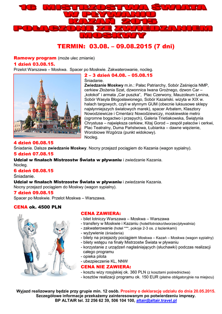 TERMIN: 03.08. – 09.08.2015 (7 dni) Ramowy program (może ulec zmianie) 1 dzień 03.08.15. Przelot Warszawa – Moskwa. Spacer po Moskwie. Zakwaterowanie, nocleg. 2 – 3 dzień 04.08. – 05.08.15 Śniadanie. Zwiedzanie Moskwy m.in.: Pałac Patriarchy, Sobór Zaśnięcia NMP, cerkiew Złożenia Szat, dzwonnica Iwana Groźnego, dzwon Car – „kołokoł” i armata „Car puszka”, Plac Czerwony, Mauzoleum Lenina, Sobór Wasyla Błogosławionego, Sobór Kazański. wizyta w XIX w. halach targowych, czyli w słynnym GUM (obecnie luksusowe sklepy najsłynniejszych światowych marek), spacer Arbatem, Klasztory Nowodziewicze i Cmentarz Nowodziewiczy, moskiewskie metro (ogromne bogactwo i przepych), Galeria Trietiakowska, Świątynia Chrystusa – największa cerkiew, Kitaj Gorod – zespół pałaców i cerkwi, Plac Teatralny, Duma Państwowa, Łubianka – dawne więzienie, Worobiowe Wzgórza (punkt widokowy). Nocleg. 4 dzień 06.08.15 Śniadanie. Dalsze zwiedzanie Moskwy. Nocny przejazd pociągiem do Kazania (wagon sypialny). 5 dzień 07.08.15 Udział w finałach Mistrzostw Świata w pływaniu i zwiedzanie Kazania. Nocleg. 6 dzień 08.08.15 Śniadanie. Udział w finałach Mistrzostw Świata w pływaniu i zwiedzanie Kazania. Nocny przejazd pociągiem do Moskwy (wagon sypialny). 7 dzień 09.08.15 Spacer po Moskwie. Przelot Moskwa – Warszawa. CENA ok. 4500 PLN CENA ZAWIERA: - bilet lotniczy Warszawa – Moskwa – Warszawa - transfery w Moskwie i Kazaniu (hotel/lotnisko/dworzec/pływalnia) - zakwaterowanie (hotel ***, pokoje 2-3 os. z łazienkami) - wyżywienie (śniadania) - bilety na przejazdy pociągiem Moskwa – Kazań – Moskwa (wagon sypialny) - bilety wstępu na finały Mistrzostw Świata w pływaniu - korzystanie z urządzeń nagłaśniających (słuchawki) podczas realizacji całego programu - opieka pilota - ubezpieczenie KL, NNW CENA NIE ZAWIERA: - kosztu wizy rosyjskiej ok. 360 PLN (z kosztami pośrednictwa) - kosztów realizacji programu ok. 150 EUR (płatne obligatoryjnie na miejscu) Wyjazd realizowany będzie przy grupie min. 12 osób. Prosimy o deklarację udziału do dnia 20.05.2015. Szczegółowe informacje przekażemy zainteresowanym po potwierdzeniu imprezy. BP ALTAIR tel. 32 256 62 39, 506 104 100, [email protected]
