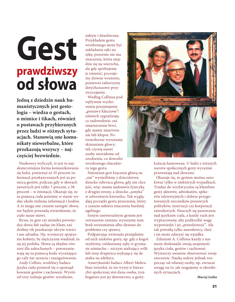 Gest prawdziwszy od słowa Jedną z dziedzin nauk humanistycznych jest gestologia – wiedza o gestach, o mimice i tikach, również o postawach przybieranych przez ludzi w różnych sytuacjach. Stanowią one komunikaty niewerbalne, które przekazują wszyscy – najczęściej bezwiednie. Naukowcy wyliczyli, iż jest to najskuteczniejsza forma komunikowania się ludzi, ponieważ aż 55 procent informacji przekazywanych jest za pomocą gestów, podczas gdy w słowach zawartych jest tylko 7 procent, a 38 procent – w intonacji. Okazuje się, że za pomocą ciała jesteśmy w stanie wysłać około miliona informacji i kodów. A że mogą one czasem zastąpić słowa, nie będzie przesadą stwierdzenie, że ciało nasze mówi. Bywa, że gest czy mimika potwierdza słowa lub zadaje im kłam, zaś drobny tik przekazuje ukryte wieści i nas zdradza. Np. wystarczy spojrzenie kobiety, by mężczyzna wiedział, że się jej podoba. Słowa są zbędne również dla zakochanych – porozumiewają się za pomocą kodu wyrażającego cały żar uczucia i zaangażowania. Andy Collins, wnikliwy badacz języka ciała postarał się o uporządkowanie gestów i zachowań. Wyróżnił trzy rodzaje gestów: wrodzone, nabyte i dziedziczne. Przykładem gestu wrodzonego może być zakładanie ręki na rękę; pozornie nie ma znaczenia, która znajdzie się na wierzchu, ale gdy spróbujemy je zmienić, poczujemy dziwne wrażenie, ponieważ zaburzymy dotychczasowe przyzwyczajenie. Według Collinsa pod wpływem wychowania przejmujemy „postawy kluczowe”: uśmiech sygnalizujący zadowolenie, zaś zmarszczenie brwi, gdy mamy zmartwienie lub kłopot. Potwierdzenie wyrażamy skinieniem głowy; tak czynią nawet osoby niewidome od urodzenia, co dowodzi wrodzonego charakteru tego gestu. Natomiast gest kręcenia głową na „nie” wynieśliśmy z dzieciństwa: dziecko odwraca głowa, gdy nie chce jeść, więc mama nadstawia łyżeczkę z drugiej strony, a dziecko „umyka” w odwrotnym kierunku. Tak wyglądają początki gestu przeczenia, który z czasem nabiera znaczenia bardziej ogólnego. Innym uniwersalnym gestem jest wzruszenie ramion; wyrażamy nim brak zrozumienia albo dystans do problemu czy sprawy. Podpatrując zwierzęta przejęliśmy od nich niektóre gesty, np. gdy z kogoś szydzimy, odsłaniamy zęby w grymasie uśmiechu – niczym atakujący wilk lub inny drapieżca szykujący się do ataku na zdobycz. Amerykański badacz Albert Mehrabian twierdzi, że im wyżej w hierarchii społecznej stoi dana osoba, tym bogatsze jest jej słownictwo, a gesty- kulacja hamowana. U ludzi z niższych warstw społecznych gesty wyraźnie przeważają nad słowami. Okazuje się, że gestem można oszukiwać tylko w niektórych wypadkach. Trudne do wychwycenia są kłamliwe gesty aktorów, adwokatów, spikerów telewizyjnych i dobrze przygotowanych rzeczników prasowych polityków, instytucji czy korporacji zawodowych. Nauczyli się panowania nad językiem ciała, a każdy ruch jest wypracowany, aby podkreślić wagę wypowiedzi i jej „prawdziwość”. Ale tak potrafią tylko zawodowcy, choć i im może zdarzyć się wpadka. Zdaniem A. Collinsa każdy z nas może doskonalić swoją znajomość języka ciała, gestów i zachowań. Wystarczy uważnie obserwować swoje otoczenie. Naukę należy jednak rozpocząć od własnej osoby, np. zwracać uwagę na to, jak reagujemy w określonych sytuacjach. Maciej Lutka 31