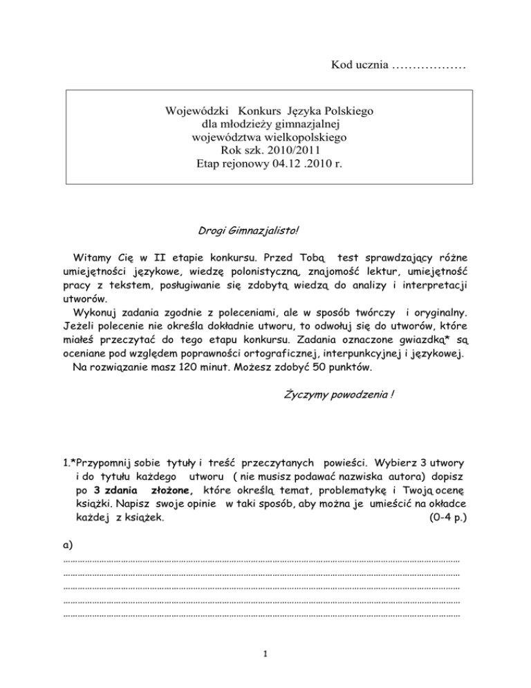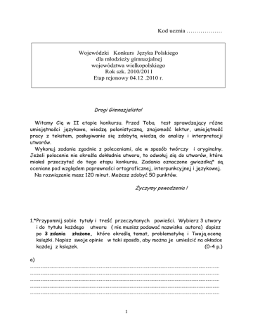 Kod ucznia ……………… Wojewódzki Konkurs Języka Polskiego dla młodzieży gimnazjalnej województwa wielkopolskiego Rok szk. 2010/2011 Etap rejonowy 04.12 .2010 r. Drogi Gimnazjalisto! Witamy Cię w II etapie konkursu. Przed Tobą test sprawdzający różne umiejętności językowe, wiedzę polonistyczną, znajomość lektur, umiejętność pracy z tekstem, posługiwanie się zdobytą wiedzą do analizy i interpretacji utworów. Wykonuj zadania zgodnie z poleceniami, ale w sposób twórczy i oryginalny. Jeżeli polecenie nie określa dokładnie utworu, to odwołuj się do utworów, które miałeś przeczytać do tego etapu konkursu. Zadania oznaczone gwiazdką* są oceniane pod względem poprawności ortograficznej, interpunkcyjnej i językowej. Na rozwiązanie masz 120 minut. Możesz zdobyć 50 punktów. Życzymy powodzenia ! 1.*Przypomnij sobie tytuły i treść przeczytanych powieści. Wybierz 3 utwory i do tytułu każdego utworu ( nie musisz podawać nazwiska autora) dopisz po 3 zdania złożone, które określą temat, problematykę i Twoją ocenę książki. Napisz swoje opinie w taki sposób, aby można je umieścić na okładce każdej z książek. (0-4 p.) a) ………………………………………………………………………………………………………………………………………………… ………………………………………………………………………………………………………………………………………………… ………………………………………………………………………………………………………………………………………………… ………………………………………………………………………………………………………………………………………………… ………………………………………………………………………………………………………………………………………………… 1 b) ………………………………………………………………………………………………………………………………………………… ………………………………………………………………………………………………………………………………………………… ………………………………………………………………………………………………………………………………………………… ………………………………………………………………………………………………………………………………………………… ……………………………………………………………………………………………………….……………………………………….. c) ………………………………………………………………………………………………………………………………………………… ………………………………………………………………………………………………………………………………………………… ………………………………………………………………………………………………………………………………………………… ………………………………………………………………………………………………………………………………………………… …………………………………………………………………………………………………………………………………………………. 2. Przeczytaj wiersz Agnieszki Osieckiej i wykonaj polecenia. Umrzeć z miłości Chociaż raz warto umrzeć z miłości. Chociaż raz. A to choćby po to, żeby się później chwalić znajomym, że to bywa. Że to jest. ...Umrzeć. Leżeć w cmentarzu czyjejś szuflady obok innych nieboszczyków listów i nieboszczek pamiątek i cierpieć... Cierpieć tak bosko i z takim patosem, jakby się było Toscą lub Witosem. ...I nie mieć już żadnych spraw i do nikogo złości. I tylko błagać Boga, by choć raz, choć jeszcze jeden raz umrzeć z miłości. 2 (0-6 p.) a) określ sytuację liryczną w wierszu: (0-1) ………………………………………………………………………………………………………………………………………………… ………………………………………………………………………………………………………………………………………………… ………………………………………………………………………………………………………………………………………………… ………………………………………………………………………………………………………………………………………………… ………………………………………………………………………………………………………………………………………………… ………………………………………………………………………………………………………………………………………………… b) nazwij typ liryki, ze względu na temat: (0-1) ………………………………………………………………………………………………………………………………………………… ………………………………………………………………………………………………………………………………………………… c) określ nastroje i uczucia osoby mówiącej: (0-1) ………………………………………………………………………………………………………………………………………………… …………………………………………………………………………