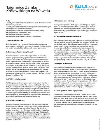 Tajemnice Zamku Królewskiego na Wawelu Cele: • Zdobycie wiedzy na temat podstawowych elementów architektonicznych zamku. • Zdobycie wiedzy na temat funkcji pomieszczeń zamkowych (na przykładzie Zamku na Wawelu). • Rozwijanie wyobraźni poprzez wcielanie się w rolę. • Rozwijanie ekspresji plastycznej. • Rozwijanie płynności myślenia. • Rozwijanie koordynacji ruchowej i równowagi. 5. Skarb niejedno ma imię 1. Pamiętnik giermka Giermek prosi dzieci o pomoc. Okazuje się, że błazen królewski wyczerpał już wszystkie sposoby, aby poprawić władcy humor. Jednak zanim dzieci będą mogły przyjść mu z pomocą, muszą wpaść na pomysł, gdzie w przedszkolu znajduje się komnata króla. Przed rozpoczęciem zajęć nauczyciel aranżuje komnatę (np. w gabinecie Dyrektora). Znajduje się tam krzesło imitujące tron i korona oraz zdjęcie Stańczyka – najsłynniejszego królewskiego błazna. W komnacie można przeprowadzić twórczą rundkę – każde dziecko podaje pomysł, w jaki sposób można rozbawić króla. Nauczyciel spisuje pomysły i w ten sposób powstaje KSIĘGA ŻARTÓW. 2. Znam zamek jak własną kieszeń Giermek Gniewko (autor listu) zaprasza do poznawania zamku i jego najważniejszych elementów architektonicznych „z lotu ptaka”. Nauczyciel prosi dzieci o zamknięcie oczu, zapraszając do przeniesienia się na zamkowe mury, a następnie rozkłada schematyczny zarys zamku, wyklejony na dużym ciemnym materiale za pomocą taśmy malarskiej. Zamek powinien mieć: basztę, wieżę, most zwodzony, fosę, blanki, bramę, okna wykuszowe. Dzieci zwiedzają kolejne miejsca. Po poznaniu topografii zamku nauczyciel inicjuje zabawę ruchową, wydając okrzyki: „Wszyscy do fosy!”, „Bronić bramy!”, „Na blanki!” itp. 3. W labiryncie korytarzy W liście pozostawionym przez giermka znajduje się informacja, że Zamek na Wawelu – dawna siedziba królów polskich, ma wiele ciemnych zakamarków. Kandydat na giermka musi umieć poruszać po ciemnych korytarzach, i to bezszelestnie. Nauczyciel proponuje dzieciom pokonanie labiryntu z zamkniętymi oczami. Dla tej grupy wiekowej labirynt powinien być prosty, np. mieć postać wąskiej ścieżki zrobionej z pachołków gimnastycznych, krzeseł, materacy. 4. W drodze do skarbca Giermek zaprasza do odwiedzenia skarbca, tłumacząc, że jest to miejsce, w którym król przechowuje klejnoty i złoto. Jak w każdym zamku również na Wawelu skarbiec jest dobrze chroniony - aby do niego wejść, trzeba wykazać się spostrzegawczością i odnaleźć zagubione po drodze złote talary. Dzieci udają się do przygotowanego przed zajęciami miejsca (jadalnia, szatnia, ew. sala innej grupy) oznaczonego zdjęciem autentycznych kosztowności (lub wnętrza skarbca) z zamku na Wawelu. 6. Z wizytą w królewskiej komnacie 7. Porządki w zbrojowni Giermek zleca dzieciom kolejne zadanie, którym jest odnalezienie zbrojowni. Tłumaczy, że jest to miejsce, w którym przechowywana jest broń rycerzy. Dzieci próbują odgadnąć, gdzie może znajdować się zbrojownia. Nauczyciel towarzyszy dzieciom w poszukiwaniach, pozwalając eksplorować kolejne pomieszczenia. Przed zajęciami umieszcza w kuchni tekturowe tarcze. Po odkryciu zbrojowni, dzieci zabierają znalezione tarcze do sali. Nauczyciel proponuje, żeby dzieci umieściły na tarczach swoje znaki rozpoznawcze (coś, co lubią, coś, co je wyróżnia), wykorzystując przygotowane różnokolorowe i różnej wielkości figury geometryczne. 8. Zanim giermek stanie się rycerzem Ćwiczenia na zamkowym dziedzińcu – dzieci wraz z nauczycielem wychodzą do przedszkolnego ogrodu. Nauczyciel ogłasza rozpoczęcie treningu rycerskiego. Dzieci siadają na koniach (można do tego wykorzystać miotły lub mopy) i mają za zadanie uderzyć tarczą w piłkę zawieszoną na odpowiedniej wysokości na jednej z ogrodowych zabawek (np. na drabince). www.kula.gov.pl Dzieci znajdują stary pergamin (opalona kartka papieru) przewiązany wstążką. Po otwarciu dowiadują się, że znajdują się w nim wskazówki, w jaki sposób zostać giermkiem. Nauczyciel rozpoczyna dyskusję na temat tego, co to jest skarb i co można nazwać skarbem. Zwraca się do dzieci z pytaniem: Co dla Ciebie jest skarbem? Dzieci lepią swoje osobiste skarby z plasteliny, po czym zamykają je w specjalnej szkatułce. Materiały: - list od giermka, wstążka - płachta materiału z zarysem zamku wykonanym z taśmy malarskiej - pachołki gimnastyczne, materace - wycięte z kartonu pieniążki zawinięte w folię aluminiową - plastelina - duża szkatułka lub pudełko - kartki A5 przedziurkowane i spięte wstążką (księga żartów) - tkanina aksamitna na tron - korona z papieru - wycięte z tektury tarcze - różnokolorowe figury geometryczne - kleje - piłka, sznurek - kije od mioteł, mopy itp. Potrzebne książki: www.kula.gov.pl - album ze zdjęciami z Wawelu (komnata królewska, skarbiec, zbrojownia), np. Wawel – Katedra i Zamek, A.Bujak, J.K. Ostrowski, Wydawnictwo Anchor Books - reprodukcja obrazu Jana Matejki „Stańczyk” [w:] np. „Wielka Kolekcja Sławnych Malarzy”, nr 42, Jan Matejko – album.