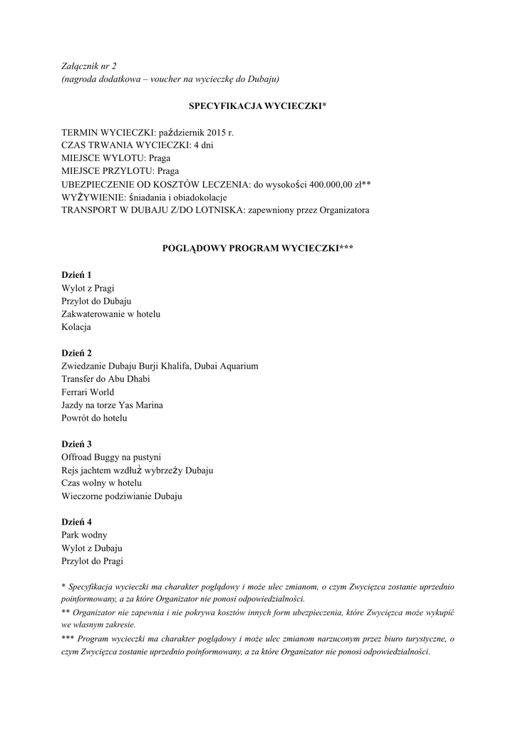 Załącznik nr 2 (nagroda dodatkowa – voucher na wycieczkę do Dubaju) SPECYFIKACJA WYCIECZKI* TERMIN WYCIECZKI: październik 2015 r. CZAS TRWANIA WYCIECZKI: 4 dni MIEJSCE WYLOTU: Praga MIEJSCE PRZYLOTU: Praga UBEZPIECZENIE OD KOSZTÓW LECZENIA: do wysokości 400.000,00 zł** WYŻYWIENIE: śniadania i obiadokolacje TRANSPORT W DUBAJU Z/DO LOTNISKA: zapewniony przez Organizatora POGLĄDOWY PROGRAM WYCIECZKI*** Dzień 1 Wylot z Pragi Przylot do Dubaju Zakwaterowanie w hotelu Kolacja Dzień 2 Zwiedzanie Dubaju Burji Khalifa, Dubai Aquarium Transfer do Abu Dhabi Ferrari World Jazdy na torze Yas Marina Powrót do hotelu Dzień 3 Offroad Buggy na pustyni Rejs jachtem wzdłuż̇ wybrzeży Dubaju Czas wolny w hotelu Wieczorne podziwianie Dubaju Dzień 4 Park wodny Wylot z Dubaju Przylot do Pragi * Specyfikacja wycieczki ma charakter poglądowy i może ulec zmianom, o czym Zwycięzca zostanie uprzednio poinformowany, a za które Organizator nie ponosi odpowiedzialności. ** Organizator nie zapewnia i nie pokrywa kosztów innych form ubezpieczenia, które Zwycięzca może wykupić we własnym zakresie. *** Program wycieczki ma charakter poglądowy i może ulec zmianom narzuconym przez biuro turystyczne, o czym Zwycięzca zostanie uprzednio poinformowany, a za które Organizator nie ponosi odpowiedzialności.
