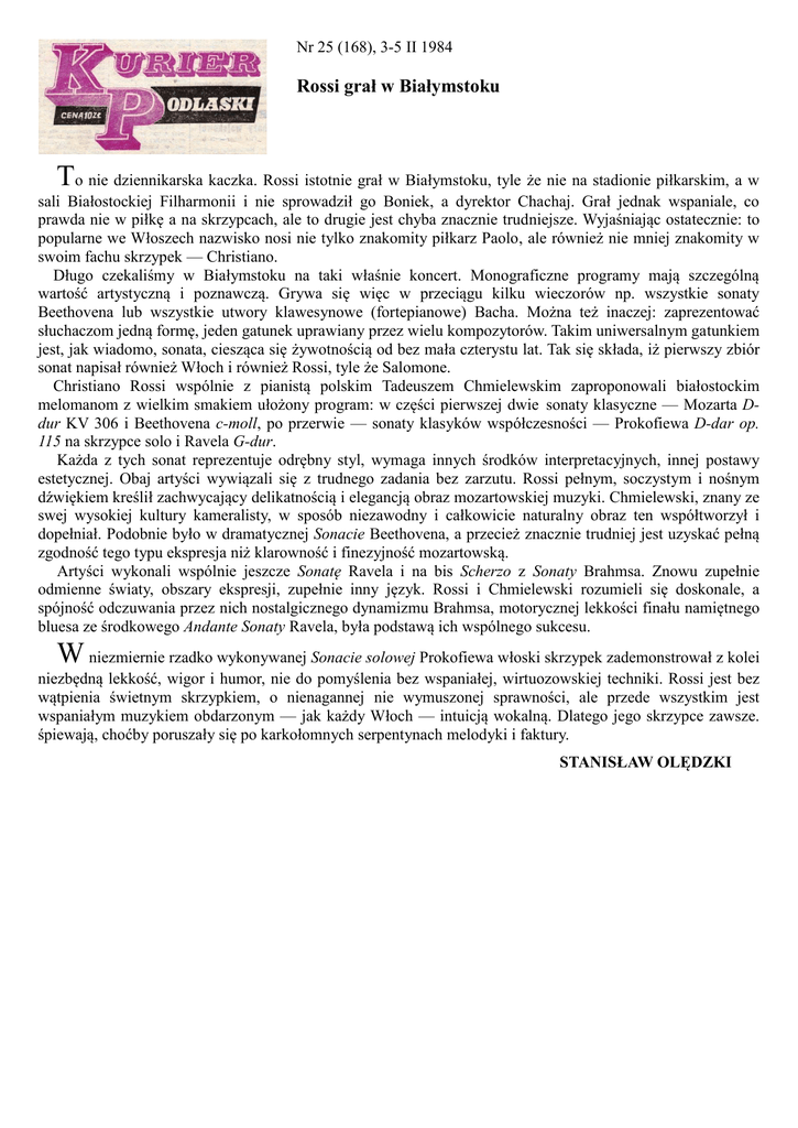 Nr 25 (168), 3-5 II 1984 Rossi grał w Białymstoku To nie dziennikarska kaczka. Rossi istotnie grał w Białymstoku, tyle że nie na stadionie piłkarskim, a w sali Białostockiej Filharmonii i nie sprowadził go Boniek, a dyrektor Chachaj. Grał jednak wspaniale, co prawda nie w piłkę a na skrzypcach, ale to drugie jest chyba znacznie trudniejsze. Wyjaśniając ostatecznie: to popularne we Włoszech nazwisko nosi nie tylko znakomity piłkarz Paolo, ale również nie mniej znakomity w swoim fachu skrzypek — Christiano. Długo czekaliśmy w Białymstoku na taki właśnie koncert. Monograficzne programy mają szczególną wartość artystyczną i poznawczą. Grywa się więc w przeciągu kilku wieczorów np. wszystkie sonaty Beethovena lub wszystkie utwory klawesynowe (fortepianowe) Bacha. Można też inaczej: zaprezentować słuchaczom jedną formę, jeden gatunek uprawiany przez wielu kompozytorów. Takim uniwersalnym gatunkiem jest, jak wiadomo, sonata, ciesząca się żywotnością od bez mała czterystu lat. Tak się składa, iż pierwszy zbiór sonat napisał również Włoch i również Rossi, tyle że Salomone. Christiano Rossi wspólnie z pianistą polskim Tadeuszem Chmielewskim zaproponowali białostockim melomanom z wielkim smakiem ułożony program: w części pierwszej dwie sonaty klasyczne — Mozarta Ddur KV 306 i Beethovena c-moll, po przerwie — sonaty klasyków współczesności — Prokofiewa D-dar op. 115 na skrzypce solo i Ravela G-dur. Każda z tych sonat reprezentuje odrębny styl, wymaga innych środków interpretacyjnych, innej postawy estetycznej. Obaj artyści wywiązali się z trudnego zadania bez zarzutu. Rossi pełnym, soczystym i nośnym dźwiękiem kreślił zachwycający delikatnością i elegancją obraz mozartowskiej muzyki. Chmielewski, znany ze swej wysokiej kultury kameralisty, w sposób niezawodny i całkowicie naturalny obraz ten współtworzył i dopełniał. Podobnie było w dramatycznej Sonacie Beethovena, a przecież znacznie trudniej jest uzyskać pełną zgodność tego typu ekspresja niż klarowność i finezyjność mozartowską. Artyści wykonali wspólnie jeszcze Sonatę Ravela i na bis Scherzo z Sonaty Brahmsa. Znowu zupełnie odmienne światy, obszary ekspresji, zupełnie inny język. Rossi i Chmielewski rozumieli się doskonale, a spójność odczuwania przez nich nostalgicznego dynamizmu Brahmsa, motorycznej lekkości finału namiętnego bluesa ze środkowego Andante Sonaty Ravela, była podstawą ich wspólnego sukcesu. W niezmiernie rzadko wykonywanej Sonacie solowej Prokofiewa włoski skrzypek zademonstrował z kolei niezbędną lekkość, wigor i humor, nie do pomyślenia bez wspaniałej, wirtuozowskiej techniki. Rossi jest bez wątpienia świetnym skrzypkiem, o nienagannej nie wymuszonej sprawności, ale przede wszystkim jest wspaniałym muzykiem obdarzonym — jak każdy Włoch — intuicją wokalną. Dlatego jego skrzypce zawsze. śpiewają, choćby poruszały się po karkołomnych serpentynach melodyki i faktury. STANISŁAW OLĘDZKI