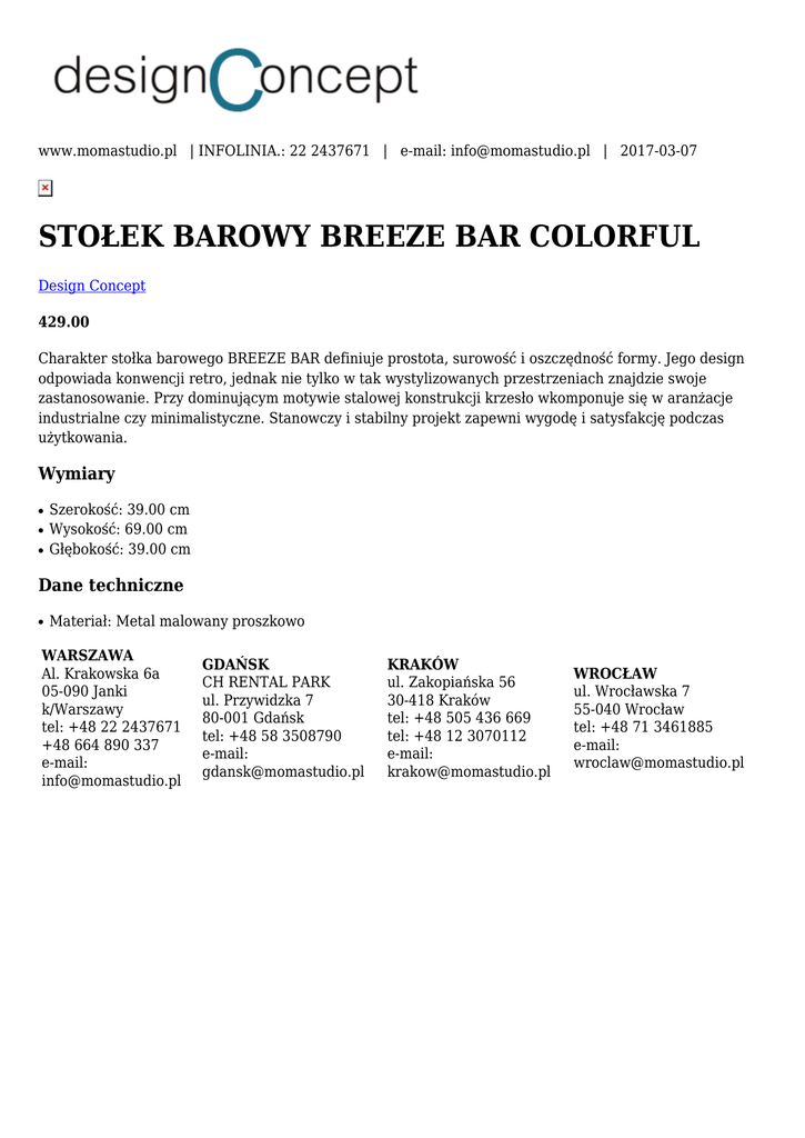 www.momastudio.pl | INFOLINIA.: 22 2437671 | e-mail: [email protected] | 2017-03-07 STOŁEK BAROWY BREEZE BAR COLORFUL Design Concept 429.00 Charakter stołka barowego BREEZE BAR definiuje prostota, surowość i oszczędność formy. Jego design odpowiada konwencji retro, jednak nie tylko w tak wystylizowanych przestrzeniach znajdzie swoje zastanosowanie. Przy dominującym motywie stalowej konstrukcji krzesło wkomponuje się w aranżacje industrialne czy minimalistyczne. Stanowczy i stabilny projekt zapewni wygodę i satysfakcję podczas użytkowania. Wymiary ● ● ● Szerokość: 39.00 cm Wysokość: 69.00 cm Głębokość: 39.00 cm Dane techniczne ● Materiał: Metal malowany proszkowo WARSZAWA Al. Krakowska 6a 05-090 Janki k/Warszawy tel: +48 22 2437671 +48 664 890 337 e-mail: [email protected] GDAŃSK CH RENTAL PARK ul. Przywidzka 7 80-001 Gdańsk tel: +48 58 3508790 e-mail: [email protected] KRAKÓW ul. Zakopiańska 56 30-418 Kraków tel: +48 505 436 669 tel: +48 12 3070112 e-mail: [email protected] WROCŁAW ul. Wrocławska 7 55-040 Wrocław tel: +48 71 3461885 e-mail: [email protected]