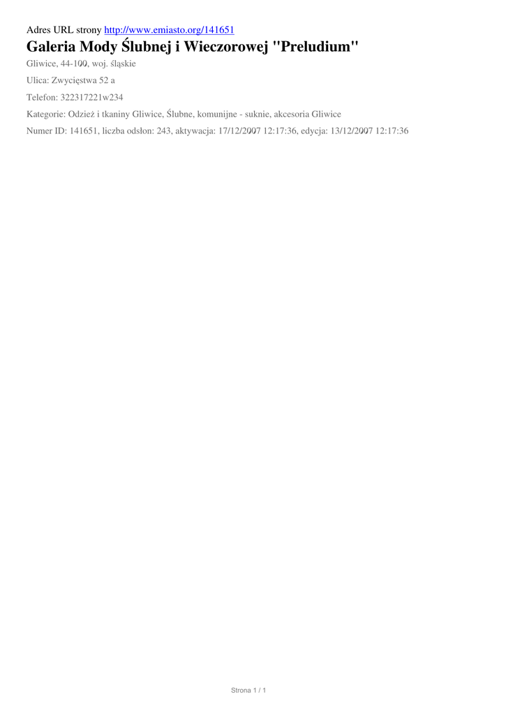 Adres URL strony http://www.emiasto.org/141651 Galeria Mody Ślubnej i Wieczorowej "Preludium" Gliwice, 44-100, woj. śląskie Ulica: Zwycięstwa 52 a Telefon: 322317221w234 Kategorie: Odzież i tkaniny Gliwice, Ślubne, komunijne - suknie, akcesoria Gliwice Numer ID: 141651, liczba odsłon: 243, aktywacja: 17/12/2007 12:17:36, edycja: 13/12/2007 12:17:36 Strona 1 / 1