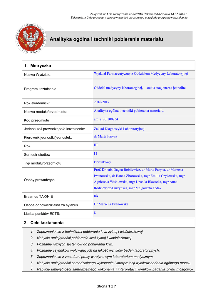 Załącznik nr 1 do zarządzenia nr 54/2015 Rektora WUM z dnia 14.07.2015 r. Załącznik nr 2 do procedury opracowywania i okresowego przeglądu programów kształcenia Analityka ogólna i techniki pobierania materiału 1. Metryczka Nazwa Wydziału: Wydział Farmaceutyczny z Oddziałem Medycyny Laboratoryjnej Program kształcenia Oddział medycyny laboratoryjnej, Rok akademicki: 2016/2017 Nazwa modułu/przedmiotu: Analityka ogólna i techniki pobierania materiału. Kod przedmiotu am_s_s0 100234 Jednostka/i prowadząca/e kształcenie: Zakład Diagnostyki Laboratoryjnej Kierownik jednostki/jednostek: dr Marta Faryna Rok III Semestr studiów II Typ modułu/przedmiotu kierunkowy studia stacjonarne jednolite Prof. Dr hab. Dagna Bobilewicz, dr Marta Faryna, dr Marzena Iwanowska, dr Hanna Zborowska, mgr Emilia Czyżewska, mgr Osoby prowadzące Agnieszka Wiśniewska, mgr Urszula Błazucka, mgr Anna Rodziewicz-Lurzyńska, mgr Małgorzata Fedak Erasmus TAK/NIE nie Osoba odpowiedzialna za sylabus Dr Marzena Iwanowska Liczba punktów ECTS: 8 2. Cele kształcenia 1. Zapoznanie się z technikami pobierania krwi żylnej i włośniczkowej. 2. Nabycie umiejętności pobierania krwi żylnej i włośniczkowej. 3. Poznanie różnych systemów do pobierania krwi. 4. Poznanie czynników wpływających na jakość wyników badań laboratoryjnych. 5. Zapoznanie się z zasadami pracy w rutynowym laboratorium medycznym. 6. Nabycie umiejętności samodzielnego wykonania i interpretacji wyników badania ogólnego moczu. 7. Nabycie umiejętności samodzielnego wykonania i interpretacji wyników badania płynu mózgowo- Strona 1 z 7 Załącznik nr 1 do zarządzenia nr 54/2015 Rektora WUM z dnia 14.07.2015 r. Załącznik nr 2 do procedury opracowywania i okresowego przeglądu programów kształcenia rdzeniowego. 8. Nabycie umiejętności samodzielnego wykonania i interpretacji wyników badania ogólnego płynów z jam ciała człowieka. 9. Zapoznanie się z możliwościami badania innych materiałów biologicznych człowieka. 10. Zapoznanie się diagnostycznym. z zastosowaniem technik analitycznych w medycznym laboratorium 11. Nabycie umiejętności bezpiecznej pracy w laboratorium. 3. Wymagania wstępne 1. Student posiada umiejętność komunikacji interpersonalnej niezbędnej w procesie pobierania materiału i pracy w zespole. 2. Student posiada wiedzę z zakresu anatomii, fizjologii i patofizjologii układu moczowego. 3. Student posiada wiedzę z zakresu wytwarzania płynu mózgowo-rdzeniowego. 4. Student ma podstawy z zakresu metod stosowanych w rutynowym laboratorium medycznym. 5. Student zna pojęcia wydalin i wydzielin. 6. Student umie sporządzać rozcieńczenia płynów, zna jednostki SI i konwencjonalne i umie je przeliczać. 7. Student umie posługiwać się mikroskopem optycznym i pipetami. 4. Przedmiotowe efekty kształcenia Lista efektów kształcenia Symbol przedmiotowego efektu kształcenia W1 Treść przedmiotowego efektu kształcenia Student - rozumie funkcjonowanie układu krążenia, oddechowego, pokarmowego, krwionośnego, moczowego, odpornościowego i nerwowego oraz powstawanie i znaczenie płynów ustrojowych, wydzielin i wydalin Odniesienie do efektu kierunkowego (numer) K_W03 W2 - zna podstawy metodyczne metod analitycznych (w tym: rozdzielczych, fotometrycznych, spektrometrycznych, elektrochemicznych, immunochemicznych, analizy enzymów i substratów, kwasów nukleinowych) i ich zastosowanie w medycynie laboratoryjnej K_W11 W3 - zna zasady udzielania pierwszej pomocy przedmedycznej w sytuacjach zagrożenia zdrowia lub życia K_W15 W4 - zna podstawowe problemy przedlaboratoryjnej i polaboratoryjnej fazy wykonywania badań (w tym: czynniki pozaanalityczne wpływające na wiarygodność wyników badań laboratoryjnych, współpraca z personelem medycznym, potrzeby zleceniodawcy) K_W19 W5 - zna rolę badań laboratoryjnych w rozpoznawaniu, monitorowaniu, rokowaniu i profilaktyce zaburzeń narządowych i układowych oraz kryteria doboru tych badań i Strona 2 z 7 K_W20 Załącznik nr 1 do zarządzenia nr 54/2015 Rektora WUM z dnia 14.07.2015 r. Załącznik nr 2 do procedury opracowywania i okresowego przeglądu programów kształcenia zasady wykonywania W6 W7 - zna rodzaje i charakterystykę materiału biologicznego, zasady i metodykę pobierania, transportu, przechowywania i przygotowania go do analizy (w tym: miejsce i czas pobrania, wpływ czynników interferujących, dobór antykoagulantów, utrwalaczy i podłoża transportowego, temperatury) - zna teoretyczne i praktyczne aspekty metod oznaczeń biochemicznych oraz ich znaczenie dla rozpoznawania, diagnostyki różnicowej, monitorowania przebiegu choroby i oceny efektów leczenia w różnych stanach klinicznych K_W22 K_W24 W8 - zna teoretyczne i praktyczne aspekty metodyki oraz znaczenie diagnostyczne ilościowego i jakościowego badania płynów ustrojowych, wydalin i wydzielin K_W29 U1 Student potrafi: - potrafi wyjaśnić pacjentowi lub zleceniodawcy wpływ czynników przedlaboratoryjnych na jakość wyniku badania laboratoryjnego (w tym konieczność powtórzenia badania) K_U01 K_U02 U2 - potrafi przekazywać informacje o wyniku badania laboratoryjnego bez ingerencji w kompetencje lekarza K_U03 U3 - potrafi pouczyć pacjenta przed pobraniem materiału do badań U4 - potrafi skutecznie komunikować się ze współpracownikami, innymi pracownikami ochrony zdrowia i odbiorcami wyników U5 - potrafi pobierać materiał do badań, ocenić jego przydatność, przechowywać i przygotowywać do analizy K_U05 U6 - umie dobrać optymalne metody analityczne i ocenić wiarygodność wyników tych analiz K_U06 U7 - potrafi stosować instrumentalne metody analityczne w medycznej diagnostyce laboratoryjnej K_U07 U8 - umie określić przydatność diagnostyczną badania laboratoryjnego K_U09 U9 - potrafi posługiwać się zautomatyzowaną aparaturą pomiarową stosowaną we współczesnej laboratoryjnej diagnostyce medycznej i pomocniczym sprzętem labor