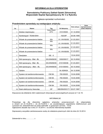 INFORMACJA DLA OFERENTÓW Samodzielny Publiczny Zakład Opieki Zdrowotnej Wojewódzki Szpital Specjalistyczny Nr 3 w Rybniku ogłasza sprzedaż ruchomości. Przedmiotem sprzedaży są następujące artykuły: Data zakupu Lp. Nazwa 1 Zestaw respiracyjny 2 Kardiotograf TEAM-ENH 3 Wózek do przewożenia blatów 4 Wózek do przewożenia blatów 5 Wózek do przewożenia blatów Typ Nr fabryczny Care Went ATV 01CV5000 31.12.2002 15233P 20.06.1995 01.1/N160/00 01.03.2001 01.1/N160/00 01.03.2001 01.1/N160/00 01.03.2001 01.1/N160/00 01.03.2001 Wb Wb Cena zaproponowana przez nabywcę Wb Wb 6 Wózek do przewożenia blatów 7 Destylator 8 Stół operacyjny - Blat - BL 05.0/N456/00 1000/00017 30.10.2002 9 Stół operacyjny - Blat - BL 05.0/N456/00 0101/00038 01.03.2001 05.0/N456/00 0101/00043 30.10.2002 Nr A2942A 04.12.2006 10 Stół operacyjny – Blat – BL 15.04.2002 DE - 5 11 Optyka 12 System do kardiomonitorowania CM 8A 700.00225 10.04.2006 13 System do kardiomonitorowania CM 8A 700.00225 10.04.2006 14 System do kardiomonitorowania CM 8A 700.00225 10.04.2006 15 System do kardiomonitorowania CM 8A 700.00225 10.04.2006 16 Ssak elektryczny Aesculap GF 080/SN/003171 25.07.1997 Dopuszcza się składanie ofert częściowych dotyczących poszczególnych pozycji od 1 do 16. INFORMACJE Przewiduje się dla oferentów oględziny artykułów przeznaczonych do odsprzedaży w dniach od 21.10.2014 r. do 24.10.2014 r. po wcześniejszym uzgodnieniu telefonicznym pod numerem tel. (032)4291253 lub (032) 4291265 w godzinach od 8.00 – 14.00 Ogłoszenie ukazało się w dniu 21.10.2014 r. na stronie internetowej Szpitala. Zapraszamy wszystkie zainteresowane osoby do składania pisemnych ofert do dnia 24.10.2014 Zatwierdził w dniu……………r. …………………………………….. -1-