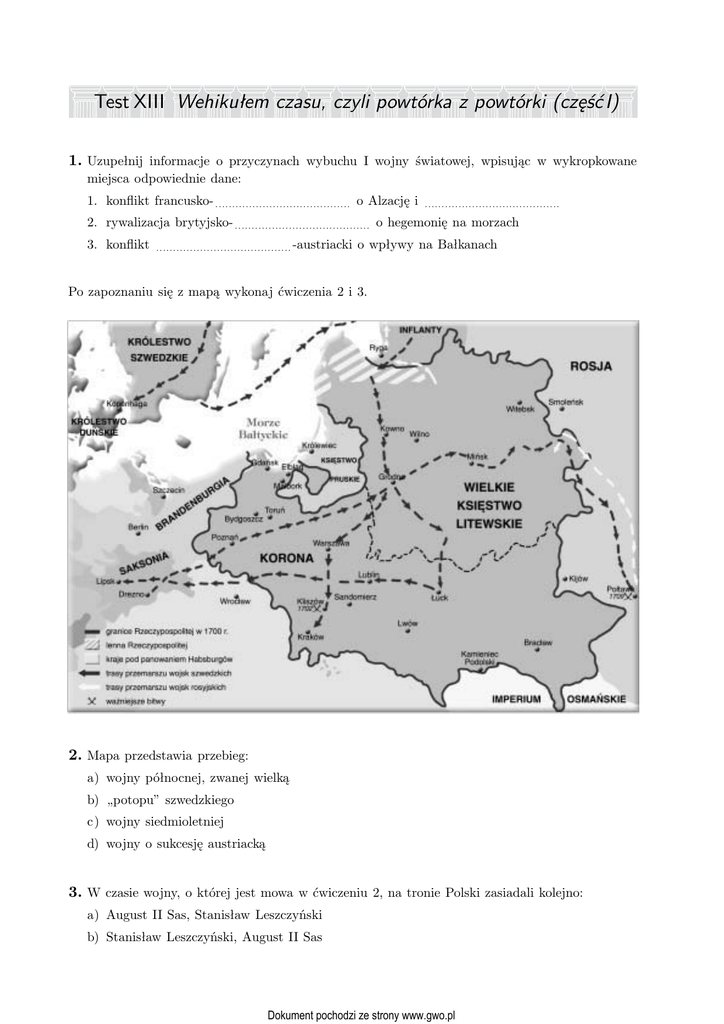 Test XIII Wehikułem czasu, czyli powtórka z powtórki (część I) 1. Uzupełnij informacje o przyczynach wybuchu I wojny światowej, wpisując w wykropkowane miejsca odpowiednie dane: 1. konflikt francusko- . ....................................... o Alzację i ........................................ 2. rywalizacja brytyjsko- ........................................ o hegemonię na morzach 3. konflikt ........................................ -austriacki o wpływy na Bałkanach Po zapoznaniu się z mapą wykonaj ćwiczenia 2 i 3. 2. Mapa przedstawia przebieg: a) wojny północnej, zwanej wielką b) „potopu” szwedzkiego c) wojny siedmioletniej d) wojny o sukcesję austriacką 3. W czasie wojny, o której jest mowa w ćwiczeniu 2, na tronie Polski zasiadali kolejno: a) August II Sas, Stanisław Leszczyński b) Stanisław Leszczyński, August II Sas Dokument pochodzi ze strony www.gwo.pl Test XIII Wehikułem czasu, czyli powtórka z powtórki (część I) 87 c) August II Sas, Stanisław Leszczyński, August II Sas d) Stanisław Leszczyński, August II Sas, Stanisław Leszczyński Po przeczytaniu tekstu źródłowego wykonaj ćwiczenia 4, 5 i 6. Khodia Efendi, Historia Turcji ottomańskiej Przy końcu wiosny sułtan Mehmet ruszył na wyprawę, każąc jednocześnie załadować na wozy wielkie działa, które polecił przygotować dla burzenia murów i baszt. Przed wyruszeniem oznajmił, że celem jego jest zdobycie miasta Stambułu i uczynienie z niego stolicy wiary muzułmańskiej. Zanim sułtan Mehmet rozpoczął oblężenie, cesarz przesłał mu propozycje, aby wziął wszystkie miejscowości poza Stambułem, a samo tylko miasto Stambuł mu zostawił, za co cesarz będzie płacił sułtanowi trybut. Sułtan odpowiedział, aby cesarz zdał mu miasto. Cesarz, otrzymawszy odpowiedź, ustawił na swych wieżach i murach artylerię, żołnierzy uzbrojonych w muszkiety i zaopatrzonych w wielkie zapasy smoły. Oblężeni ze swojej strony posyłali bez przerwy salwy z muszkietów i dział. Opór ze strony oblężonych był tak silny, że Turcy, dopiero gdy noc zapadła, byli w stanie wedrzeć się do miasta przez wyłom w murze. Nie zwracając uwagi na strzały muszkietów i dział, rzucili się jak lwy na wyłom przez nich dokonany i zatknęli na nim swoją chorągiew; w tym samym czasie miasto zostało opanowane. W końcu, gdy nie zostało ani jednego człowieka z bronią w ręku, otworzono bramy i sułtan wjechał w nie. Od Hammurabiego..., t. 1, s. 93. 4. W cytowanym tekście opisane jest zdobycie: a) Rzymu b) Konstantynopola c) Moskwy d) Wenecji 5. Zdobycie miasta, o którym jest mowa w ćwiczeniu 4, nastąpiło w roku: a) 1492 b) 476 c) 410 d) 1453 6. Część historyków uważa, że rok poprawnie podkreślony w ćwiczeniu 5 jest umowną datą oznaczającą: a) koniec starożytności i początek dziejów nowożytnych b) koniec średniowiecza i początek dziejów nowożytnych c) koniec starożytności i początek średniowiecza d) koniec dziejów nowożytnych i początek średniowiecza Dokument pochodzi ze strony www.gwo.pl