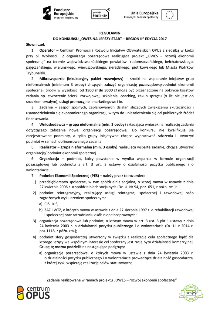 REGULAMIN DO KONKURSU „OWES NA LEPSZY START – REGION II” EDYCJA 2017 Słowniczek 1. Operator – Centrum Promocji i Rozwoju Inicjatyw Obywatelskich OPUS z siedzibą w Łodzi przy pl. Wolności 2 organizacja pozarządowa realizująca projekt „OWES – rozwój ekonomii społecznej” na terenie województwa łódzkiego: powiatów radomszczańskiego, bełchatowskiego, pajęczańskiego, wieluńskiego, wieruszowskiego, sieradzkiego, piotrkowskiego lub Miasta Piotrków Trybunalski. 2. Mikrowsparcie (inkubacyjny pakiet rozwojowy) – środki na wspieranie inicjatyw grup nieformalnych (minimum 3 osoby) chcących założyć organizację pozarządową/podmiot ekonomii społecznej. Środki w wysokości od 1500 zł do 5000 zł mogą być przeznaczone na pokrycie kosztów zadania np. stworzenie ścieżki rozwojowej, szkolenia, coaching, zakup sprzętu (o ile nie jest on środkiem trwałym), usługi promocyjne i marketingowe i in. 3. Zadanie – zespół spójnych, zaplanowanych działań służących zwiększeniu skuteczności i usamodzielnienia się ekonomicznego organizacji, w tym do uniezależnienia się od publicznych źródeł finansowania. 4. Wnioskodawca – grupa nieformalna (min. 3 osoby) składająca wniosek na realizację zadania dotyczącego założenia nowej organizacji pozarządowej. Do konkursu nie kwalifikują się zarejestrowane podmioty, a tylko grupy inicjatywne chcące wypracować założenia i utworzyć podmiot w ramach dofinansowanego zadania. 5. Realizator – grupa nieformalna (min. 3 osoby) realizująca wsparte zadanie, chcąca utworzyć organizację/ podmiot ekonomii społecznej. 6. Organizacja – podmiot, który powstanie w wyniku wsparcia w formule organizacji pozarządowej lub podmiotu z art. 3 ust. 3 ustawy o działalności pożytku publicznego i o wolontariacie. 7. Podmiot Ekonomii Społecznej (PES) – należy przez to rozumieć: 1) przedsiębiorstwo społeczne, w tym spółdzielnia socjalna, o której mowa w ustawie z dnia 27 kwietnia 2006 r. o spółdzielniach socjalnych (Dz. U. Nr 94, poz. 651, z późn. zm.); 2) podmiot reintegracyjny, realizujący usługi reintegracji społecznej i zawodowej osób zagrożonych wykluczeniem społecznym: a) CIS i KIS; b) ZAZ i WTZ, o których mowa w ustawie z dnia 27 sierpnia 1997 r. o rehabilitacji zawodowej i społecznej oraz zatrudnianiu osób niepełnosprawnych; 3) organizacja pozarządowa lub podmiot, o którym mowa w art. 3 ust. 3 pkt 1 ustawy z dnia 24 kwietnia 2003 r. o działalności pożytku publicznego i o wolontariacie (Dz. U. z 2014 r. poz.1118, z późn. zm.); 4) podmiot sfery gospodarczej utworzony w związku z realizacją celu społecznego bądź dla którego leżący we wspólnym interesie cel społeczny jest racją bytu działalności komercyjnej. Grupę tę można podzielić na następujące podgrupy: a) organizacje pozarządowe, o których mowa w ustawie z dnia 24 kwietnia 2003 r. o działalności pożytku publicznego i o wolontariacie prowadzące działalność gospodarczą, z której zyski wspierają realizację celów statutowych; Zadanie realizowane w ramach projektu „OWES – rozwój ekonomii społecznej” 5) spółdzielnie, których celem jest zatrudnienie tj. spółdzielnie pracy, inwalidów i niewidomych, działające w oparciu o ustawę z dnia 16 września 1982 r. - Prawo spółdzielcze (Dz. U. z 2013 r. poz. 1443, z późn. zm.); 6) spółki non-profit, o których mowa w ustawie z dnia 24 kwietnia 2003 r. o działalności pożytku publicznego i o wolontariacie, o ile udział sektora publicznego w spółce wynosi nie więcej niż 50%. 8. Działalność ekonomiczna – jest rozumiana jako prowadzenie działalności gospodarczej (zgodnie z Ustawą z 2 lipca 2004 r. o swobodzie działalności gospodarczej: art.2 Działalnością gospodarczą w rozumieniu ustawy jest zarobkowa działalność, która ma przynieść w zamierzeniu zysk, bez znaczenia jest sposób przeznaczenia uzyskanego w ten sposób majątku; ma charakter stały, powtarzalny) lub działalności odpłatnej (działalność powadzona przez stowarzyszenie/fundację w ramach jej działań statutowych mieszczących się w sferze pożytku publicznego określonej w art. 4 ustawy o działalności pożytku publicznego i o wolontariacie za które pobiera opłaty (wynagrodzenie) od beneficjentów, sprzedaż wytworzonych towarów lub świadczenie usług. 9. Kapitał żelazny organizacji - to środki finansowe, które organizacja zdobywa i gromadzi po to, by czerpać z nich zyski przeznaczane na realizację jej celów statutowych. I. CEL KONKURSU I ZAKRES ZADAŃ MOŻLIWYCH DO REALIZACJI 1. Celem konkursu jest zwiększenie skuteczności działania, samodzielności i potencjału organizacji pozarządowych /podmiotów ekonomii społecznej utworzonych przez grupy nieformalne z województwa łódzkiego z powiatów radomszczańskiego, bełchatowskiego, pajęczańskiego, wieluńskiego, wieruszowskiego, sieradzkiego, piotrkowskiego lub Miasta Piotrków Trybunalski. 2. W ramach Projektu „OWES – rozwój ekonomii społecznej organizowany jest konkurs na mikrowsparcie od 1500 do 5000 zł (inkubacyjny pakiet rozwojowy) dla grup nieformalnych tworzących nową organizację/podmiot ekonomii społecznej. Proces ten ma prowadzić do zwiększenia skuteczności i usamodzielnienia się ekonomicznego organizacji/podmiotu ekonomii społecznej, w tym do uniezależnienia się od publicznych źródeł finansowania. Oprócz wsparcia pakietem rozwojowym Operator przewidział dla realizatorów wsparcie doradcze o różnym zakresie, wspierające realizatorów przez 8 miesięcy od dnia zawarcia umowy. 3. Działania w ramach konkursu obejmują m.in. możliwość: a. opracowania planu działania i ścieżki rozwoju organizacji/podmiotu ekonomii społecznej (m.in. wypracowanie planu marketingowego, fundraisingowego, finansowego); b. zakupu sprzętu – pod warunkiem, że nie jest on środkiem trwałym (koszt jednostkowy pow. 3499,99 zł brutto – słownie trzech tysięcy 