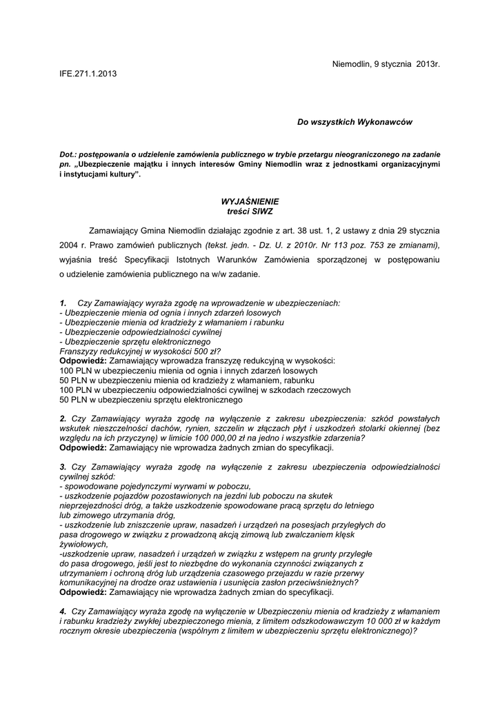 Niemodlin, 9 stycznia 2013r. IFE.271.1.2013 Do wszystkich Wykonawców Dot.: postępowania o udzielenie zamówienia publicznego w trybie przetargu nieograniczonego na zadanie pn. „Ubezpieczenie majątku i innych interesów Gminy Niemodlin wraz z jednostkami organizacyjnymi i instytucjami kultury”. WYJAŚNIENIE treści SIWZ Zamawiający Gmina Niemodlin działając zgodnie z art. 38 ust. 1, 2 ustawy z dnia 29 stycznia 2004 r. Prawo zamówień publicznych (tekst. jedn. - Dz. U. z 2010r. Nr 113 poz. 753 ze zmianami), wyjaśnia treść Specyfikacji Istotnych Warunków Zamówienia sporządzonej w postępowaniu o udzielenie zamówienia publicznego na w/w zadanie. 1. Czy Zamawiający wyraża zgodę na wprowadzenie w ubezpieczeniach: - Ubezpieczenie mienia od ognia i innych zdarzeń losowych - Ubezpieczenie mienia od kradzieży z włamaniem i rabunku - Ubezpieczenie odpowiedzialności cywilnej - Ubezpieczenie sprzętu elektronicznego Franszyzy redukcyjnej w wysokości 500 zł? Odpowiedź: Zamawiający wprowadza franszyzę redukcyjną w wysokości: 100 PLN w ubezpieczeniu mienia od ognia i innych zdarzeń losowych 50 PLN w ubezpieczeniu mienia od kradzieży z włamaniem, rabunku 100 PLN w ubezpieczeniu odpowiedzialności cywilnej w szkodach rzeczowych 50 PLN w ubezpieczeniu sprzętu elektronicznego 2. Czy Zamawiający wyraża zgodę na wyłączenie z zakresu ubezpieczenia: szkód powstałych wskutek nieszczelności dachów, rynien, szczelin w złączach płyt i uszkodzeń stolarki okiennej (bez względu na ich przyczynę) w limicie 100 000,00 zł na jedno i wszystkie zdarzenia? Odpowiedź: Zamawiający nie wprowadza żadnych zmian do specyfikacji. 3. Czy Zamawiający wyraża zgodę na wyłączenie z zakresu ubezpieczenia odpowiedzialności cywilnej szkód: - spowodowane pojedynczymi wyrwami w poboczu, - uszkodzenie pojazdów pozostawionych na jezdni lub poboczu na skutek nieprzejezdności dróg, a także uszkodzenie spowodowane pracą sprzętu do letniego lub zimowego utrzymania dróg, - uszkodzenie lub zniszczenie upraw, nasadzeń i urządzeń na posesjach przyległych do pasa drogowego w związku z prowadzoną akcją zimową lub zwalczaniem klęsk żywiołowych, -uszkodzenie upraw, nasadzeń i urządzeń w związku z wstępem na grunty przyległe do pasa drogowego, jeśli jest to niezbędne do wykonania czynności związanych z utrzymaniem i ochroną dróg lub urządzenia czasowego przejazdu w razie przerwy komunikacyjnej na drodze oraz ustawienia i usunięcia zasłon przeciwśnieżnych? Odpowiedź: Zamawiający nie wprowadza żadnych zmian do specyfikacji. 4. Czy Zamawiający wyraża zgodę na wyłączenie w Ubezpieczeniu mienia od kradzieży z włamaniem i rabunku kradzieży zwykłej ubezpieczonego mienia, z limitem odszkodowawczym 10 000 zł w każdym rocznym okresie ubezpieczenia (wspólnym z limitem w ubezpieczeniu sprzętu elektronicznego)? Odpowiedź: Zamawiający nie wprowadza żadnych zmian do specyfikacji. Ubezpieczenie to należy do zakresu fakultatywnego. 5. Proszę o usunięcie z definicji zalania zapisu „m.in.” a także szkód spowodowanych przez wodę powstałą w wyniku topnienia mas śniegu lub lodu i powstałe w wyniku rozszczelnienia dachu wskutek zamarzania wody lub wprowadzenie limitu na tego rodzaju szkody w wysokości 30.000zł. Odpowiedź: Zamawiający nie wprowadza żadnych zmian do specyfikacji. 6. Proszę o możliwość zmiany definicji przepięcia na: „nagły wzrost napięcia w sieci elektrycznej spowodowany wyładowaniami atmosferycznymi”. Odpowiedź: Zamawiający nie wprowadza żadnych zmian do specyfikacji. 7. Proszę o informację czy od 1996 r. w zgłaszanych lokalizacjach wystąpiła powódź. Odpowiedź: W gminie Niemodlin występuje zagrożenie powodziowe dla poniższych lokalizacji: Budynek Dyrekcji ZGKIM w Niemodlinie, ul. Wojska Polskiego 3 Budynek Przedszkola w Graczach Oczyszczalnia ścieków w Gościejowicach i dla tych lokalizacji Zamawiający wprowadza limit w ryzyku powodzi w wysokości 1 600 000,00 zł (wartość najdroższej lokalizacji). Jednocześnie Zamawiający podnosi, że w jego opinii za zaniedbanie w zakresie konserwacji koryta rzeki i urządzeń hydrotechnicznych odpowiedzialność ponosi Wojewódzki Zarząd Melioracji i Urządzeń Wodnych w Opolu i to do niego ubezpieczyciel w ramach regresu może wnosić roszczenia za wypłacone z tytułu powodzi odszkodowanie. Burmistrz Niemodlina oraz Rada Miasta podjęły w zakresie poprawy bezpieczeństwa powodziowego odpowiednie działania, występując m.in. dnia 27 maja 2010 r. do samorządu województwa opolskiego z apelem o przyspieszenie działań na rzecz budowy zbiornika retencyjnego na Ścinawie Niemodlińskiej. 8. Proszę o możliwość zmiany definicji dewastacji na: Ustala się z zachowaniem pozostałych niezmienionych niniejszą klauzulą postanowień ogólnych warunków ubezpieczenia i innych postanowień umowy ubezpieczenia, że: 1) ochroną ubezpieczeniową w zakresie określonym w niniejszej klauzuli objęte jest: - budynek lub lokal wskazany w dokumencie ubezpieczenia i znajdujące się w nim mienie (z wyłączeniem wartości pieniężnych oraz szyb) - mienie znajdujące się na zewnątrz w tym obiekty małej architektury od zniszczenia lub uszkodzenia wskutek dewastacji (20% wartości ustalonego limitu dla klauzuli dewastacji) 2) Przez dewastację rozumie się umyślne zniszczenie lub uszkodzenie ubezpieczonego mienia przez osoby trzecie. 3) Szkody polegające na pomalowaniu/graffiti ograniczone są do limitu 5000zł na jedno Odpowiedzialność wszystkie zdarzenia. 4) Odpowiedzialność Ubezpieczyciela za szkody powstałe w wyniku dewastacji ograniczona jest do limitu na jedno i wszystkie zdarzenia, podanego w dokumencie ubezpieczenia. 5) Ubezpieczeniem nie są objęte szkody w ubezpieczonych budynkach lub lokalach opuszczonych i niewykorzystanych przez okres dłuższy niż 30 dni. 6) Limit na ryzyko dewastacji 50000zł na jedno i wszystkie zdarzenia. Odpowiedź: Zamawiaj