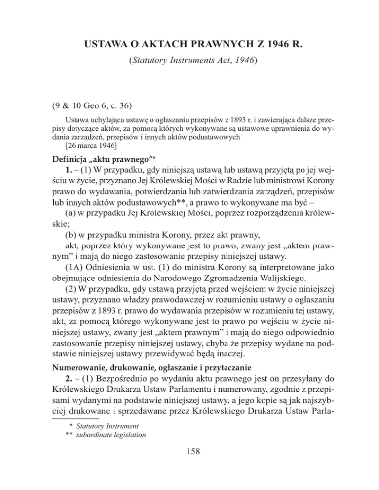 USTAWA O AKTACH PRAWNYCH Z 1946 R. (Statutory Instruments Act, 1946) (9 & 10 Geo 6, c. 36) Ustawa uchylająca ustawę o ogłaszaniu przepisów z 1893 r. i zawierająca dalsze przepisy dotyczące aktów, za pomocą których wykonywane są ustawowe uprawnienia do wydania zarządzeń, przepisów i innych aktów podustawowych [26 marca 1946] Definicja „aktu prawnego”* 1. – (1) W przypadku, gdy niniejszą ustawą lub ustawą przyjętą po jej wejściu w życie, przyznano Jej Królewskiej Mości w Radzie lub ministrowi Korony prawo do wydawania, potwierdzania lub zatwierdzania zarządzeń, przepisów lub innych aktów podustawowych**, a prawo to wykonywane ma być – (a) w przypadku Jej Królewskiej Mości, poprzez rozporządzenia królewskie; (b) w przypadku ministra Korony, przez akt prawny, akt, poprzez który wykonywane jest to prawo, zwany jest „aktem prawnym” i mają do niego zastosowanie przepisy niniejszej ustawy. (1A) Odniesienia w ust. (1) do ministra Korony są interpretowane jako obejmujące odniesienia do Narodowego Zgromadzenia Walijskiego. (2) W przypadku, gdy ustawą przyjętą przed wejściem w życie niniejszej ustawy, przyznano władzy prawodawczej w rozumieniu ustawy o ogłaszaniu przepisów z 1893 r. prawo do wydawania przepisów w rozumieniu tej ustawy, akt, za pomocą którego wykonywane jest to prawo po wejściu w życie niniejszej ustawy, zwany jest „aktem prawnym” i mają do niego odpowiednio zastosowanie przepisy niniejszej ustawy, chyba że przepisy wydane na podstawie niniejszej ustawy przewidywać będą inaczej. Numerowanie, drukowanie, ogłaszanie i przytaczanie 2. – (1) Bezpośrednio po wydaniu aktu prawnego jest on przesyłany do Królewskiego Drukarza Ustaw Parlamentu i numerowany, zgodnie z przepisami wydanymi na podstawie niniejszej ustawy, a jego kopie są jak najszybciej drukowane i sprzedawane przez Królewskiego Drukarza Ustaw Parla* Statutory Instrument ** subordinate legislation 158 mentu lub z jego upoważnienia, z wyjątkiem przypadków przewidzianych przez ustawę przyjętą po wejściu w życie niniejszej ustawy lub określonych przez przepisy wydane na podstawie niniejszej ustawy. (2) Akt prawny może być przytaczany przez podanie numeru nadanego mu zgodnie z postanowieniami niniejszego artykułu i rok kalendarzowy, nie wyłączając innego sposobu przytaczania. Dodatkowe postanowienia dotyczące ogłaszania 3. – (1) Przepisy wydane na potrzeby niniejszej ustawy uregulują ogłaszanie przez Drukarnię Państwową Jego Królewskiej Mości wykazów zawierających datę, z którą po raz pierwszy wydano przez tę drukarnię lub z jej upoważnienia każdy akt prawny wydrukowany i sprzedawany przez Królewskiego Drukarza Ustaw Parlamentu lub z jego upoważnienia; zaś w postępowaniach prawnych kopia ogłoszonego tak wykazu przyjmowana jest za dowód jako wierna kopia, a pozycja zawarta w nim jest rozstrzygającym dowodem co do daty, z którą po raz pierwszy wydano akt prawny przez Drukarnię Państwową Jego Królewskiej Mości lub z jej upoważnienia. (2) W postępowaniu prawnym przeciwko komukolwiek w sprawie o przestępstwo polegające na naruszeniu aktu prawnego, na osobie oskarżonej spoczywa ciężar udowodnienia, że akt nie był wydany przez Drukarnię Państwową Jej Królewskiej Mości lub z jej upoważnienia w dniu zarzuconego naruszenia, o ile nie zostanie udowodnione, że w tym dniu podjęte zostały uzasadnione środki w celu podania treści aktu do wiadomości społeczeństwa lub osób, których przypuszczalnie może dotyczyć, lub osoby oskarżonej. (3) Artykuł niniejszy nie wpływa na przepisy lub zasady prawa dotyczące czasu wejścia w życie aktu prawnego, z wyjątkiem wyraźnego odmiennego postanowienia. Akty prawne wymagające przedłożenia w Parlamencie 4. – (1) W przypadku, gdy na mocy niniejszej ustawy lub ustawy przyjętej po wejściu w życie niniejszej ustawy, wymagane jest przedłożenie w Parlamencie aktu prawnego po jego wydaniu, kopia aktu składana jest każdej z izb Parlamentu przed wejściem aktu w życie, z uwzględnieniem poniższego postanowienia: Jeżeli niezbędne jest wejście w życie takiego aktu zanim jego kopie zostaną w powyższy sposób przedłożone, akt może wejść w życie przed powyższym przedłożeniem; zaś w przypadku, gdy akt prawny wchodzi w życie przed przedłożeniem Parlamentowi, niezwłocznie przesyłane jest Lordowi Kanclerzowi i spikerowi Izby Gmin powiadomienie zwracające uwagę na 159 okoliczność, iż kopie aktu prawnego jeszcze nie zostały przedłożone w Parlamencie i wyjaśniające, dlaczego nie przedłożono tych kopii przed wejściem aktu w życie. (2) Każda kopia takiego aktu prawnego sprzedawana przez królewskiego drukarza ustaw Parlamentu lub z jego upoważnienia zawiera na jej tytułowej stronie – (a) stwierdzenie wskazujące datę, z którą akt prawny wszedł lub wejdzie w życie; oraz (b) stwierdzenie wskazujące datę, z którą kopie aktu przedłożono w Parlamencie albo stwierdzenie, że takie kopie mają zostać przedłożone w Parlamencie. Akty prawne podlegające uchyleniu poprzez uchwałę izby Parlamentu 5. – (1) W przypadku, gdy niniejsza ustawa lub ustawa przyjęta po wejściu w życie niniejszej ustawy przewiduje, że akt prawny podlega uchyleniu poprzez uchwałę izby Parlamentu, akt przedkładany jest w Parlamencie po wydaniu, a postanowienia poprzedzającego artykułu mają odpowiednie zastosowanie, zaś jeżeli izba w okresie czterdziestu dni rozpoczynającym się w dniu, w którym złożono kopię aktu, postanowi o przedstawieniu Jego Królewskiej Mości adresu upraszającego o uchylenie aktu, po dniu przyjęcia takiej uchwały nie będą zgodnie z powyższym podejmowane żadne prace, a Jego Królewska Mość może rozporządzeniem królewskim uchylić akt, w taki jednakże sposób, aby taka uchwała ani uchylenie nie wyłączało ważności działań uprzednio podjętych na podstawie aktu ani wydania nowego aktu prawneg