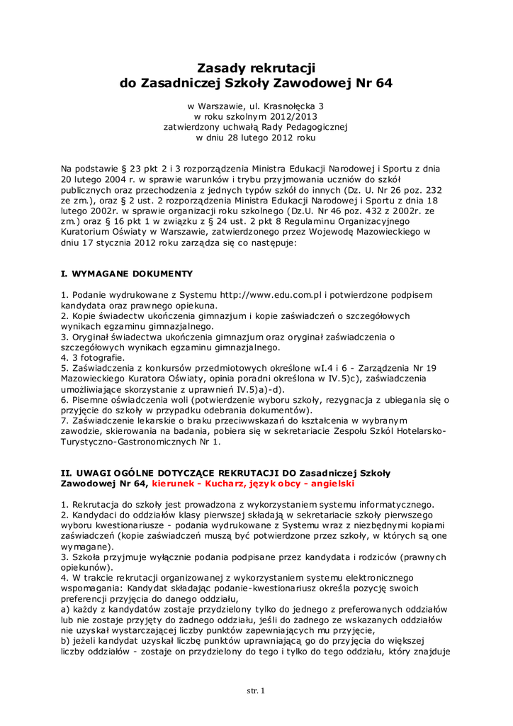 Zasady rekrutacji do Zasadniczej Szkoły Zawodowej Nr 64 w Warszawie, ul. Krasnołęcka 3 w roku szkolnym 2012/2013 zatwierdzony uchwałą Rady Pedagogicznej w dniu 28 lutego 2012 roku Na podstawie § 23 pkt 2 i 3 rozporządzenia Ministra Edukacji Narodowej i Sportu z dnia 20 lutego 2004 r. w spraw ie warunków i trybu przyjmowania uczniów do szkół publicznych oraz przechodzenia z jednych typów szkół do innych (Dz. U. Nr 26 poz. 232 ze zm.), oraz § 2 ust. 2 rozporządzenia Ministra Edukacji Narodowej i Sportu z dnia 18 lutego 2002r. w spraw ie organizacji roku szkolnego (Dz.U. Nr 46 poz. 432 z 2002r. ze zm.) oraz § 16 pkt 1 w związku z § 24 ust. 2 pkt 8 Regulaminu Organizacyjnego Kuratorium Oświaty w Warszawie, zatwierdzonego przez Wojewodę Mazowieckiego w dniu 17 stycznia 2012 roku zarządza się co następuje: I. WYMAGANE DOKUMENTY 1. Podanie wydrukowane z Systemu http://www.edu.com.pl i potwierdzone podpisem kandydata oraz praw nego opiekuna. 2. Kopie świadectw ukończenia gimnazjum i kopie zaświadczeń o szczegółowych wynikach egzaminu gimnazjalnego. 3. Oryginał św iadectwa ukończenia gimnazjum oraz oryginał zaświadczenia o szczegółowych wynikach egzaminu gimnazjalnego. 4. 3 fotografie. 5. Zaświadczenia z konkursów przedmiotowych określone wI.4 i 6 - Zarządzenia Nr 19 Mazowieckiego Kuratora Ośw iaty, opinia poradni określona w IV.5)c), zaświadczenia umożliwiające skorzystanie z upraw nień IV.5)a)-d). 6. Pisemne oświadczenia woli (potwierdzenie wyboru szkoły, rezygnacja z ubiegania się o przyjęcie do szkoły w przypadku odebrania dokumentów). 7. Zaświadczenie lekarskie o braku przeciwwskazań do kształcenia w wybranym zawodzie, skierowania na badania, pobiera się w sekretariacie Zespołu Szkól HotelarskoTurystyczno-Gastronomicznych Nr 1. II. UWAGI OGÓLNE DOTYCZĄCE REKRUTACJI DO Zasadnicze j Szkoły Zawodowej Nr 64, kie runek - Kucha rz, języ k obcy - angie lski 1. Rekrutacja do szkoły jest prowadzona z wykorzystaniem systemu informatycznego. 2. Kandydaci do oddziałów klasy pierwszej składają w sekretariacie szkoły pierwszego wyboru kwestionariusze - podania wydrukowane z Systemu w raz z niezbędnymi kopiami zaświadczeń (kopie zaświadczeń muszą być potwierdzone przez szkoły, w których są one wymagane). 3. Szkoła przyjmuje wyłącznie podania podpisane przez kandydata i rodziców (prawny ch opiekunów). 4. W trakcie rekrutacji organizowanej z wykorzystaniem systemu elektronicznego wspomagania: Kandydat składając podanie-kwestionariusz określa pozycję swoich preferencji przyjęcia do danego oddziału, a) każdy z kandydatów zostaje przydzielony tylko do jednego z preferowanych oddziałów lub nie zostaje przyjęty do żadnego oddziału, jeśli do żadnego ze wskazanych oddziałów nie uzyskał wystarczającej liczby punktów zapewniających mu przyjęcie, b) jeżeli kandydat uzyskał liczbę punktów uprawniającą go do przyjęcia do większej liczby oddziałów - zostaje on przydzielony do tego i tylko do tego oddziału, który znajduje str. 1 się najwyżej na liście jego preferencji, c) kandydat, który zostanie zakwalifikowany do przyjęcia do oddziału, nie będzie umieszczony na listach do przyjęcia do oddziałów o niższych preferencjach, choćby spełniał kryteria przyjęć do tych oddziałów, d) kandydat ubiegający się o przyjęcie do szkoły składając dokumenty, posługuje się kopiami św iadectwa ukończenia gimnazjum i zaśw iadczenia o szczegółowych wynikach egzaminu, poświadczonymi przez dyrektora gimnazjum, do którego uczęszczał. Kandydat składa tyle kopii tych dokumentów ile szkół wybrał. 5. Kandydat umieszczony na liście przyjętych do danej szkoły składa oświadczenie potwierdzające wolę przyjęcia nauki w danej szkole oraz oryginały świadectwa i zaświadczenia o wynikach egzaminu. 6. Ogłoszenie wyników rekrutacji nastąpi w terminie ustalonym przez Mazow ieckiego Kuratora Oświaty. 7. Warunkiem przyjęcia do szkoły jest złożenie pisemnego oświadczenia potwierdzającego wybór i dostarczenie oryginałów dokumentów w terminie określonym w terminarzu. 8. W celu przeprowadzenia rekrutacji do klasy pierwszej dyrektor szkoły powołuje Szkolną Komisję Rekrutacyjno - Kwalif ikacyjną (w skrócie SKRK), wyznacza jej przewodniczącego i określa zadania członków. 9. Szkolna Komisja Rekrutacyjno - Kwalifikacyjna: a) podaje informację o warunkach rekrutacji, b) przeprowadza postępowanie rekrutacyjno-kwalifikacyjne zgodnie z kryteriami i warunkami określonymi w regulaminie, c) ogłasza listę kandydatów zakwalifikowanych do przyjęcia, d) ogłasza listę kandydatów przyjętych do szkoły, e) podaje informację o wolnych miejscach w szkole, f) rozstrzyga w sprawach nieuregulowanych w niniejszym regulaminie i nierozstrzygniętych w szczegółowych przepisach, w tym określa warunki i kryteria rekrutacji uzupełniającej i rekrutacji dodatkowej, sporządza protokoły postępowania kwalifikacyjnego. III. KRY TERIA REKRUTACJI do Zasadnicze j Szkoły Za wodowe j Nr 64 1. O przyjęcie do oddziału klasy pierwszej może ubiegać się absolwent gimnazjum, który ukończył gimnazjum w roku 2012 i nie ukończył 18 roku życia. Absolwenci gimnazjum z ubiegłych lat, którzy nie ukończyli 18 roku życia mogą ubiegać się o przyjęcie do klasy pierwszej w rekrutacji dodatkowej (27-31 sierpnia 2012 r). 2. O przyjęciu kandydata do oddziału klasy pierwszej decyduje uzyskana przez niego lokata na listach kandydatów do szkoły w wyniku postępowania rekrutacyjno kwalifikacyjnego. 3. Laureaci i finaliśc i ogólnopolskich olimpiad przedmiotowych oraz laureaci konkursów o zasięgu wojewódzkim i ponadwojewódzkim, których program obejmuje w całości lub poszerza treści podstawy programowej co najmniej jednego przedmiotu, przyjmowani są do szkoły niezależnie od osiągniętych wyników uzyskanych w postępowaniu rekrutacyjno - kwalifikacyjnym. 4. Pierwszeństwo w przyjęciu do 