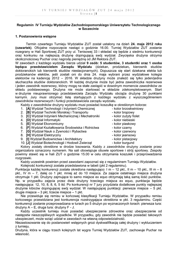 IV TURNIEJ WYDZIAŁÓW ZUT 24 maja 2012 Strona |1 Regulamin IV Turnieju Wydziałów Zachodniopomorskiego Uniwersytetu Technologicznego w Szczecinie 1. Postanowienia wstępne Termin czwartego Turnieju Wydziałów ZUT został ustalony na dzień 24. maja 2012 roku (czwartek). Oficjalne rozpoczęcie nastąpi o godzinie 16.00. Turniej Wydziałów ZUT zostanie rozegrany w Hali Sportowej ZUT przy ul. Tenisowej 33 i składać się będzie z siedmiu konkurencji oraz konkursu na najlepszą drużynę dopingującą swój wydział. Zwycięska drużyna otrzyma okolicznościowy Puchar oraz nagrodę pieniężną od JM Rektora ZUT. W zawodach z każdego wydziału bierze udział 9 osób: 5 studentów, 3 studentki oraz 1 osoba będąca przedstawicielem Zarządu Wydziału (dziekan, prodziekan, kierownik studiów doktoranckich lub kierownik studiów niestacjonarnych). Dopuszcza się start dziekana elekta lub prodziekanów elektów, jeśli zostali oni do dnia 24. maja wybrani przez wydziałowe kolegia elektorów na kadencję 2012 – 2016. W składzie drużyny może znaleźć się tylko jeden/jedna słuchacz/ka studiów doktoranckich. W każdej drużynie może być jedna zawodniczka rezerwowa i jeden zawodnik rezerwowy, którzy mogą na stałe zastąpić w dowolnym momencie zawodników ze składu podstawowego. Drużyna nie może startować w składzie zdekompletowanym. Start w drużynie nieuprawnionego przedstawiciela Zarządu Wydziału obciąża drużynę 30 punktami karnymi. Jury musi otrzymać listę startujących z każdego wydziału z wyszczególnieniem zawodników rezerwowych i funkcji przedstawiciela zarządu wydziału. Każdy z zawodników drużyny wydziału musi posiadać koszulkę w określonym kolorze: 1. [A] Wydział Technologii i Inżynierii Chemicznej - kolor brzoskwiniowy 2. [B] Wydział Techniki Morskiej i Transportu - kolor brązowy 3. [C] Wydział Inżynierii Mechanicznej i Mechatroniki - kolor zużyty fiolet 4. [D] Wydział Informatyki - kolor niebieski 5. [E] Wydział Ekonomiczny - kolor piaskowy 6. [F] Wydział Kształtowania Środowiska i Rolnictwa - kolor czarny 7. [G] Wydział Nauk o Żywności i Rybactwa - kolor czerwony 8. [H] Wydział Elektryczny - kolor jeansowy 9. [I] Wydział Budownictwa i Architektury - kolor pistacjowy 10. [J] Wydział Biotechnologii i Hodowli Zwierząt - kolor burgund Kolory zostały określone w drodze losowania. Każdy z zawodników drużyny zostanie przez organizatora oznaczony numerem. Na sali obowiązuje obuwie sportowe i strój sportowy. Zespoły powinny stawić się w hali ZUT o godzinie 15.00 w celu otrzymania koszulek i przeprowadzenia rozgrzewki. Każdy uczestnik powinien przed zawodami zapoznać się z regulaminem Turnieju Wydziałów. Kolejność konkurencji została przedstawiona w tabeli (pkt 2 regulaminu). Punktacja każdej konkurencji została określona następująco: I m – 12 pkt., II m – 10 pkt., III m – 8 pkt., IV m – 7, dalej co 1 pkt. mniej aż do 10 miejsca. Za zajęcie ostatniego miejsca drużyna otrzymuje 1 pkt. Drużyny zajmujące to samo miejsce ex equo otrzymają taką samą ilość punktów. Np. w przypadku zajęcia przez dwie drużyny trzeciego miejsca ex equo, punktacja będzie następująca: 12, 10, 8, 8, 6, 5 itd. Po konkurencji nr 7 jury przydziela dodatkowe punkty najlepszej drużynie kibiców dopingującej swój wydział. W następującej punktacji: pierwsze miejsce – 5 pkt. drugie miejsce – 3 pkt, trzecie miejsce – 1 pkt. Nie przewiduje się remisu w końcowej klasyfikacji Turnieju Wydziałów. W przypadku remisu końcowego przewidziana jest konkurencja rozstrzygająca określona w pkt. 3 regulaminu. Część konkurencji zostanie przeprowadzana w turach po 5 drużyn po wyznaczonych torach: pierwsza tura: drużyny A – E, druga tura: drużyny F - J. Każdy uczestnik turnieju musi posiadać ubezpieczenie zdrowotne oraz ubezpieczenie od następstw nieszczęśliwych wypadków. W przypadku, gdy zawodnik nie będzie posiadać takowych ubezpieczeń, może wziąć udział w zawodach na własną odpowiedzialność. Niezastosowanie się do postanowień wstępnych grozi dyskwalifikacją całej drużyny i wykluczeniem z turnieju. Drużyna, która w ciągu trzech kolejnych lat wygra Turniej Wydziałów ZUT, zachowuje Puchar na własność. IV TURNIEJ WYDZIAŁÓW ZUT 24 maja 2012 Strona |2 2. Konkurencje Nazwa 1.konkurencji 1. 2. 3. 2. 4. Opis Dziekan stoi w kole do hula hoop w określonej odległości od zawodników trzymając w rękach wiadro. Zawodnicy rzucają dziekanowi do wiadra piłeczki, każdy po trzy rzuty. Dziekan nie może opuścić koła. Decyduje ilość piłeczek złapanych przez dziekana Mistrz 2. 2i student i umieszczonych w wiadrze (piłeczka, która wypadnie z wiadra nie może być podniesiona). W przypadku równej ilości piłeczek, decyduje czas konkurencji. Konkurencja rozgrywana jest w 2 seriach. W pierwszej serii biorą udział drużyny A – E, w drugiej F - J. Dwie drużyny stają naprzeciwko siebie i na gwizdek sędziego ciągną linę. Wygrywa ta drużyna, która przeciągnie linę poza określone Przeciąganie 3. 4 liny pole. (eliminacje) Konkurencja przeciągania liny rozegrana zostanie według schematu podanego w p. 4 regulaminu. Spotkania nr 1 i nr 2 oraz nr 3 i nr 4. Pierwszy zawodnik z 3 kółkami ringo biegnie do wyznaczonej linii A, z której rzuca kolejno kółka do dziekana stojącego na linii B. Dziekan chwyta kółka, jeśli któreś kółko upadnie, podnosi je z podłogi. Po oddaniu rzutów pierwszy zawodnik biegnie w stronę linii B odbiera od dziekana wszystkie kółka, Podaj ringo obiega dziekana i wraca do rzędu podając kółka kolejnemu zawodnikowi. Wyścig się kończy, kiedy wszyscy zawodnicy wykonają zadanie. O kolejności decydują czasy uzyskane w sumie przez całą drużynę. Konkurencja rozgrywana jest w 2 seriach. W pierwszej serii biorą udział drużyny A – E, w drugiej F - J. Przeciąganie liny 4. 4 (eliminacje) J. w. spotkania nr 5 i nr 6. Pierwszy zawodnik trz