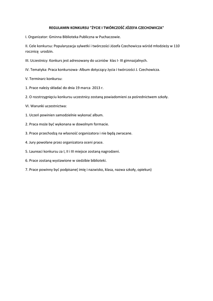 REGULAMIN KONKURSU "ŻYCIE I TWÓRCZOŚĆ JÓZEFA CZECHOWICZA" I. Organizator: Gminna Biblioteka Publiczna w Puchaczowie. II. Cele konkursu: Popularyzacja sylwetki i twórczości Józefa Czechowicza wśród młodzieży w 110 rocznicę urodzin. III. Uczestnicy: Konkurs jest adresowany do uczniów klas I- III gimnazjalnych. IV. Tematyka: Praca konkursowa- Album dotyczący życia i twórczości J. Czechowicza. V. Terminarz konkursu: 1. Prace należy składać do dnia 19 marca 2013 r. 2. O rozstrzygnięciu konkursu uczestnicy zostaną powiadomieni za pośrednictwem szkoły. VI. Warunki uczestnictwa: 1. Uczeń powinien samodzielnie wykonać album. 2. Praca może być wykonana w dowolnym formacie. 3. Prace przechodzą na własność organizatora i nie będą zwracane. 4. Jury powołane przez organizatora oceni prace. 5. Laureaci konkursu za I, II i III miejsce zostaną nagrodzeni. 6. Prace zostaną wystawione w siedzibie biblioteki. 7. Prace powinny być podpisane( imię i nazwisko, klasa, nazwa szkoły, opiekun)