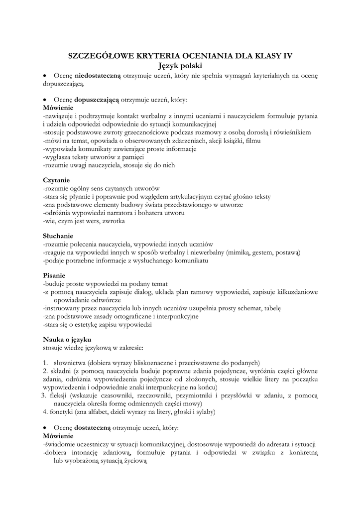 SZCZEGÓŁOWE KRYTERIA OCENIANIA DLA KLASY IV Język polski Ocenę niedostateczną otrzymuje uczeń, który nie spełnia wymagań kryterialnych na ocenę dopuszczającą. Ocenę dopuszczającą otrzymuje uczeń, który: Mówienie -nawiązuje i podtrzymuje kontakt werbalny z innymi uczniami i nauczycielem formułuje pytania i udziela odpowiedzi odpowiednie do sytuacji komunikacyjnej -stosuje podstawowe zwroty grzecznościowe podczas rozmowy z osobą dorosłą i rówieśnikiem -mówi na temat, opowiada o obserwowanych zdarzeniach, akcji książki, filmu -wypowiada komunikaty zawierające proste informacje -wygłasza teksty utworów z pamięci -rozumie uwagi nauczyciela, stosuje się do nich Czytanie -rozumie ogólny sens czytanych utworów -stara się płynnie i poprawnie pod względem artykulacyjnym czytać głośno teksty -zna podstawowe elementy budowy świata przedstawionego w utworze -odróżnia wypowiedzi narratora i bohatera utworu -wie, czym jest wers, zwrotka Słuchanie -rozumie polecenia nauczyciela, wypowiedzi innych uczniów -reaguje na wypowiedzi innych w sposób werbalny i niewerbalny (mimiką, gestem, postawą) -podaje potrzebne informacje z wysłuchanego komunikatu Pisanie -buduje proste wypowiedzi na podany temat -z pomocą nauczyciela zapisuje dialog, układa plan ramowy wypowiedzi, zapisuje kilkuzdaniowe opowiadanie odtwórcze -instruowany przez nauczyciela lub innych uczniów uzupełnia prosty schemat, tabelę -zna podstawowe zasady ortograficzne i interpunkcyjne -stara się o estetykę zapisu wypowiedzi Nauka o języku stosuje wiedzę językową w zakresie: 1. słownictwa (dobiera wyrazy bliskoznaczne i przeciwstawne do podanych) 2. składni (z pomocą nauczyciela buduje poprawne zdania pojedyncze, wyróżnia części główne zdania, odróżnia wypowiedzenia pojedyncze od złożonych, stosuje wielkie litery na początku wypowiedzenia i odpowiednie znaki interpunkcyjne na końcu) 3. fleksji (wskazuje czasowniki, rzeczowniki, przymiotniki i przysłówki w zdaniu, z pomocą nauczyciela określa formę odmiennych części mowy) 4. fonetyki (zna alfabet, dzieli wyrazy na litery, głoski i sylaby) Ocenę dostateczną otrzymuje uczeń, który: Mówienie -świadomie uczestniczy w sytuacji komunikacyjnej, dostosowuje wypowiedź do adresata i sytuacji -dobiera intonację zdaniową, formułuje pytania i odpowiedzi w związku z konkretną lub wyobrażoną sytuacją życiową -wypowiada się w sposób logiczny i uporządkowany: opowiada zdarzenia w porządku chronologicznym, streszcza utwory fabularne -składa życzenia, gratulacje -recytuje utwór poetycki, oddając jego ogólny nastrój i sens -stosuje zasady poprawnej wymowy i akcentowania wyrazów rodzimych -stosuje się do uwag nauczyciela i podejmuje próby doskonalenia wypowiedzi Czytanie -podejmuje rozmowę na temat sensu opowiadania, powieści, wiersza, artykułu -wybiera potrzebne informacje z instrukcji, przypisu, tabeli, notatki, schematu -poprawnie artykułuje i akcentuje wyrazy, stosuje intonację zdaniową podczas głośnego czytania utworów -dostrzega cechy wyróżniające teksty artystyczne (poetyckie i prozatorskie) oraz użytkowe -nazywa w tekście prozatorskim elementy świata przedstawionego -posługuje się pojęciem wersu i zwrotki, wskazuje zawarte w nich treści Słuchanie -tworzy notatkę na podstawie wysłuchanego komunikatu: uzupełnia tabelę, schematy, z pomocą nauczyciela formułuje kilkuzdaniową wypowiedź -słucha innych i uczestniczy w rozmowie, zadaje pytania, odpowiada -powtarza swoimi słowami ogólny sens usłyszanej wypowiedzi, opowiada fabułę usłyszanej historii -rozpoznaje nastrój słuchanych komunikatów Pisanie -konstruuje wypowiedzi poprawne pod względem logiczno-składniowym -używa wypowiedzeń pojedynczych i złożonych -samodzielnie zapisuje dialog -buduje ramowy plan wypowiedzi w formie równoważników zdań, zdań pytających i oznajmujących -układa opowiadanie odtwórcze -redaguje notatkę w formie prostego schematu, tabeli, planu -stosuje podstawowe zasady ortografii i interpunkcji -stosuje zasady estetycznego zapisu tekstu -dzieli wypowiedzi na części kompozycyjne Nauka o języku stosuje wiedzę językową w zakresie: 1. słownictwa (wykorzystuje wyrazy bliskoznaczne i przeciwstawne w tworzonym tekście) 2. składni (dostrzega funkcję głównych części zdania, konstruuje zdania pojedyncze proste i rozwinięte oraz wypowiedzenia złożone, odróżnia zdanie od równoważnika zdania, używa różnych typów wypowiedzeń: oznajmujących, rozkazujących, pytających, wykrzyknikowych) 3. fleksji (określa formę gramatyczną czasowników, rzeczowników, przymiotników, łączy wypowiedzenia składowe za pomocą spójnika w wypowiedzenia złożone, poprawnie zapisuje formy bezokoliczników oraz formy rodzaju męskoosobowego i niemęskoosobowego czasowników w czasie przyszłym i przeszłym) 4. fonetyki (wykorzystuje umiejętność dzielenia wyrazów na sylaby przy przenoszeniu wyrazów do następnej linijki) Ocenę dobrą otrzymuje uczeń, który: Mówienie -przedstawia własne zdanie w rozmowie -uczestniczy w rozmowie związanej z lekturą, filmem czy sytuacjami dnia codziennego -formułuje logiczne pytania i odpowiedzi -wypowiada się w roli świadka i uczestnika zdarzeń -opisuje i zachęca w wypowiedziach związanych z różnymi tekstami kultury -wygłasza tekst poetycki z pamięci, posługując się pauzą, barwą głosu; stosuje się do zasad właściwego akcentowania wyrazów i intonowania wypowiedzeń -posługuje się pozawerbalnymi środkami wypowiedzi (mimika, gest) Czytanie -odczytuje sens utworów na poziomie semantycznym, wskazuje treści przenośne, próbuje je wyjaśnić -głośno czyta utwory, uwzględniając zasady poprawnej artykulacji i intonacji -odróżnia teksty poetyckie od prozatorskich, wskazuje charakterystyczne cechy rodzajowe -wskazuje środki stylistyczne (przenośnia, porównanie, epitet) -wyróżnia elementy świata przedstawionego w opow