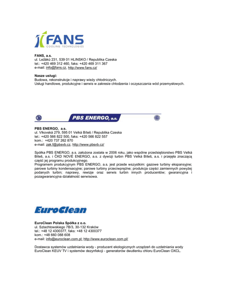 FANS, a.s. ul. Ležáků 231, 539 01 HLINSKO / Republika Czeska tel.: +420 469 312 460, faks: +420 469 311 367 e-mail: [email protected], http://www.fans.cz/ Nasze usługi: Budowa, rekonstrukcje i naprawy wieży chłodniczych. Usługi handlowe, produkcyjne i serwis w zakresie chłodzenia i oczyszczania wód przemysłowych. PBS ENERGO, a.s. ul. Vlkovská 279, 595 01 Velká Bíteš / Republika Czeska tel.: +420 566 822 500, faks: +420 566 822 557 kom.: +420 737 262 870 e-mail: [email protected], http://www.pbsvb.cz/ Spółka PBS ENERGO, a.s. założona została w 2006 roku, jako wspólne przedsiębiorstwo PBS Velká Bíteš, a.s. i ČKD NOVÉ ENERGO, a.s. z dywizji turbin PBS Velká Bíteš, a.s. i przejęła znaczącą część jej programu produkcyjnego. Programem produkcyjnym PBS ENERGO, a.s. jest przede wszystkim: gazowe turbiny ekspansyjne; parowe turbiny kondensacyjne; parowe turbiny przeciwprężne; produkcja części zamiennych powyżej podanych turbin; naprawy, rewizje oraz serwis turbin innych producentów; gwarancyjna i pozagwarancyjna działalność serwisowa. EuroClean Polska Spółka z o.o. ul. Szlachtowskiego 7B/3, 30-132 Kraków tel.: +48 12 4300377, faks: +48 12 4300377 kom.: +48 660 088 608 e-mail: [email protected]; http://www.euroclean.com.pl/ Dostawca systemów uzdatniania wody - producent ekologicznych urządzeń do uzdatniania wody EuroClean KEUV TV i systemów dezynfekcji - generatorów dwutlenku chloru EuroClean OXCL. ZVVZ-Enven Engineering, a.s. ul. Sažinova 1339, 399 01 Milevsko / Republika Czeska tel.: + 420 382 551 111, faks: + 420 382 522 158 e-mail: [email protected], http://www.zvvz-enven.cz/ ZVVZ-Enven Engineering, a.s. jest spółką handlowo-inżynieryjną, która zajmuje się projektowaniem, dostawami i realizacją urządzeń do oczyszczania gazów odpadowych od zanieczyszczeń w formie stałej i gazowej, urządzeń do pneumatycznego transportu materiałów sypkich, urządzeń klimatyzacyjnych i wentylacyjnych dla elektrowni jądrowych, klimatyzacji do budynków i wentylacji dla obiektów przemysłowych, kopalń, tunelów i metra. ISH & MSA ČERPADLA a.s. ul. Barákova 199/15, 772 43 Olomouc / Republika Czeska tel.: +420 585 111 825, 828, fax: +420 585 312 567 e-mail: [email protected], http://www.cerpadla.cz/ Spółka zajmuje się produkcją i sprzedażą wyrobów maszynowych w następujących grupach asortymentowych: pompy przemysłowe; pompy procesowe; pompy bagrowe i zatapialne szlamowe; pompy chemiczne z tworzyw sztucznych; agregaty pompowe; pompy zębate; technologie nawadniające; sprzęgła elastyczne do maszyn obrotowych; specjalna produkcja kooperacyjna. ZPA Pečky, a.s. Tř. 5. května 166 , 289 11 Pečky / Republika Czeska tel.: +420 321 785 141; faks: +420 321 785 165, 167 e-mail: [email protected]; http://www.zpa-pecky.cz/ ZPA Pečky jest firmą z ponad 40-letnią tradycją w branży inżynierii mechanicznej i elektrotechniki. Jesteśmy producentem serwomechanizmów, kompletów serwomechanizmów i armatur, a także skrzyni rozdzielczych. Oferujemy także obróbkę blachy z zastosowaniem maszyn CNC i cięcie blach laserem. Wypracowaliśmy własną konstrukcję i bazę wytwórczą dla produkowanych serwomechanizmów. Od roku 1995 posiadamy certyfikat jakości zgodnie z normą EN ISO 9001. Ventos - Ing. Petr Hanek ul. Tovární 205, Dolní Křečany 408 01 Rumburk / Republika Czeska tel.: +420 412 354 610-3, faks: +420 412 332 219 kom.: +420 737 202 278 e-mail: [email protected], http://www.ventos.cz/ Firma VENTOS istnieje od 1993 roku, jako stowarzyszenie osób fizycznych – państwa Hankovych. Firma oferuje kompleksowe usługi w dziedzinie dostarczania energii cieplnej, odzyskiwania ciepła, wentylacji i klimatyzacji. Wachlarz naszych usług jest szeroki, począwszy od sporządzania projektów na ich realizacji skończywszy. Zapewniamy także serwis gwarancyjny i pogwarancyjny na najwyższym poziomie z wykorzystaniem najnowocześniejszych osiągnięć techniki, w cenie adekwatnej do jakości usługi. Nasza firma może poszczycić się własnym projektem wymienników ciepła używanych w procesie odzyskiwania wysokopotencjalnego ciepła. Ich wyjątkowość polega na tym, że mogą być stosowane w przypadku gazowych lub olejowych źródeł ciepła. Wymienniki ciepła posiadają funkcje regulacji i są łatwe w utrzymaniu. Dodávky automatizace, spol. s r.o. ul.1.máje 34/120; 706 02 Ostrava – Vítkovice / Republika Czeska Tel.: +420 596 600 111 Fax: +420 596 600 116 e-mail: [email protected]; http://www.daas.cz Nasza spółka działa jako firma projektowo – inżynierska, dostawczo – montażowa i serwisowa w zakresie pomiarów i regulacji, zautomatyzowanych systemów sterowania procesami technologicznymi, urządzeń elektrycznych do 1000V i dostaw do 22kV. Pracami specjalnymi są pomiary rozliczeniowe legalizowanymi przyrządami pomiarowymi, sfera budowy rozdzielni, sfera produkcji urządzeń mikroelektronicznych i sfera techniki obliczeniowej łącznie z realizacją projektów sieci i usług internetowych.