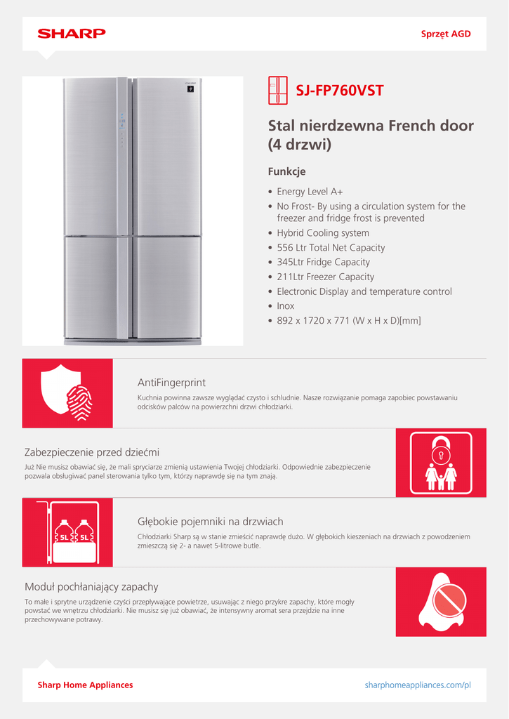 Sprzęt AGD SJ-FP760VST Stal nierdzewna French door (4 drzwi) Funkcje Energy Level A+ No Frost- By using a circulation system for the freezer and fridge frost is prevented Hybrid Cooling system 556 Ltr Total Net Capacity 345Ltr Fridge Capacity 211Ltr Freezer Capacity Electronic Display and temperature control Inox 892 x 1720 x 771 (W x H x D)[mm] AntiFingerprint Kuchnia powinna zawsze wyglądać czysto i schludnie. Nasze rozwiązanie pomaga zapobiec powstawaniu odcisków palców na powierzchni drzwi chłodziarki. Zabezpieczenie przed dziećmi Już Nie musisz obawiać się, że mali spryciarze zmienią ustawienia Twojej chłodziarki. Odpowiednie zabezpieczenie pozwala obsługiwać panel sterowania tylko tym, którzy naprawdę się na tym znają. Głębokie pojemniki na drzwiach Chłodziarki Sharp są w stanie zmieścić naprawdę dużo. W głębokich kieszeniach na drzwiach z powodzeniem zmieszczą się 2- a nawet 5-litrowe butle. Moduł pochłaniający zapachy To małe i sprytne urządzenie czyści przepływające powietrze, usuwając z niego przykre zapachy, które mogły powstać we wnętrzu chłodziarki. Nie musisz się już obawiać, że intensywny aromat sera przejdzie na inne przechowywane potrawy. Sharp Home Appliances sharphomeappliances.com/pl Sprzęt AGD Kluczowe cechy Kolor Inox Sprawność energetyczna A+ Typ produktu French door (4 drzwi) Czas wzrostu temperatury (godz.) 17 Liczba drzwi 4 Szklane wykończenie drzwi Nie Wydajność mrożenia (kg/ 24 godziny) 9.5 Frost free (No frost) Tak Poziom emisji hałasu w powietrzu (dB(A) re1 pW) 37 Roczne zużycie energii (kWh/rok) 440 Klasa klimatyczna SN-T Regulowane szklane półki Tak Przedział na warzywa i owoce (ok. 3°C) Tak Przedział o obniżonej temperaturze (-2°C ~ +3°C) Tak Szuflada na warzywa i owoce Nie Pojemniki na drzwiach Tak Pojemnik na lód Tak (x2) Regulacja temperatury (elektroniczna/mechaniczna) Tak/Nie Oświetlenie wnętrza (Zamrażarka) Nie Typ systemu odszraniania w chłodziarce/zamrażarce Auto/Auto Alarm otwartych drzwi Tak Tryb wakacyjny Tak Czynnik chłodniczy R600a Funkcje Lodówka Regulacja temperatury (elektroniczna/mechaniczna) Tak/Nie Oświetlenie wnętrza (Lodówki) Tak System chłodzenia System Hybrid Cooling System Plasmacluster Ion Tak Pochłaniacz zapachów (Honeycomb / Nano) Pochłaniacz zapachów Nano + AG Funkcje zamrażarka No Frost /chłodzenie wentylatorowe Tak/Tak Liczba gwiazdek - zamrażarka 4 Ekspresowe zamrażanie Tak Automatyczna kostkarka do lodu (typ zbiornikowy) Nie Kostkarka do lodu/obrotowa/z tacką 2 dwurzędowe/Tak/- Inne funkcje Dozownik wody Nie Zabezpieczenie przed dziećmi Tak Uchwyt na drzwiach Hook handle Elektroniczny wyświetlacz i sterowanie Sharp Home Appliances Tak sharphomeappliances.com/pl Sprzęt AGD Inne funkcje nieprzerwany Przekładane drzwi Nie Do zabudowy Nie Pojemność (całkowita netto) (L) 556 Pojemność chłodziarki (całkowita netto) (L) 345 Pojemność zamrażarki (całkowita netto) (L) 211 Masa, kg (netto) 104 Masa, kg (brutto) 118 Szerokość Ponad 80cm Pojemność Pojemność (całkowita brutto) (L) Pojemność chłodziarki (całkowita brutto) (L) Pojemność zamrażarki (całkowita brutto) (L) 626 372 254 Wymiary i waga Wymiary z uchwytem (sz. x w. x g.) mm 892 x 1720 x 771 Wymiary bez uchwytu (sz. x w. x g.) mm – Wymiary opakowania (sz. x w. x g.) mm 962 x 1860 x 853 European article number Kod EAN Sharp Home Appliances Powered by TCPDF (www.tcpdf.org) 4974019750156 sharphomeappliances.com/pl