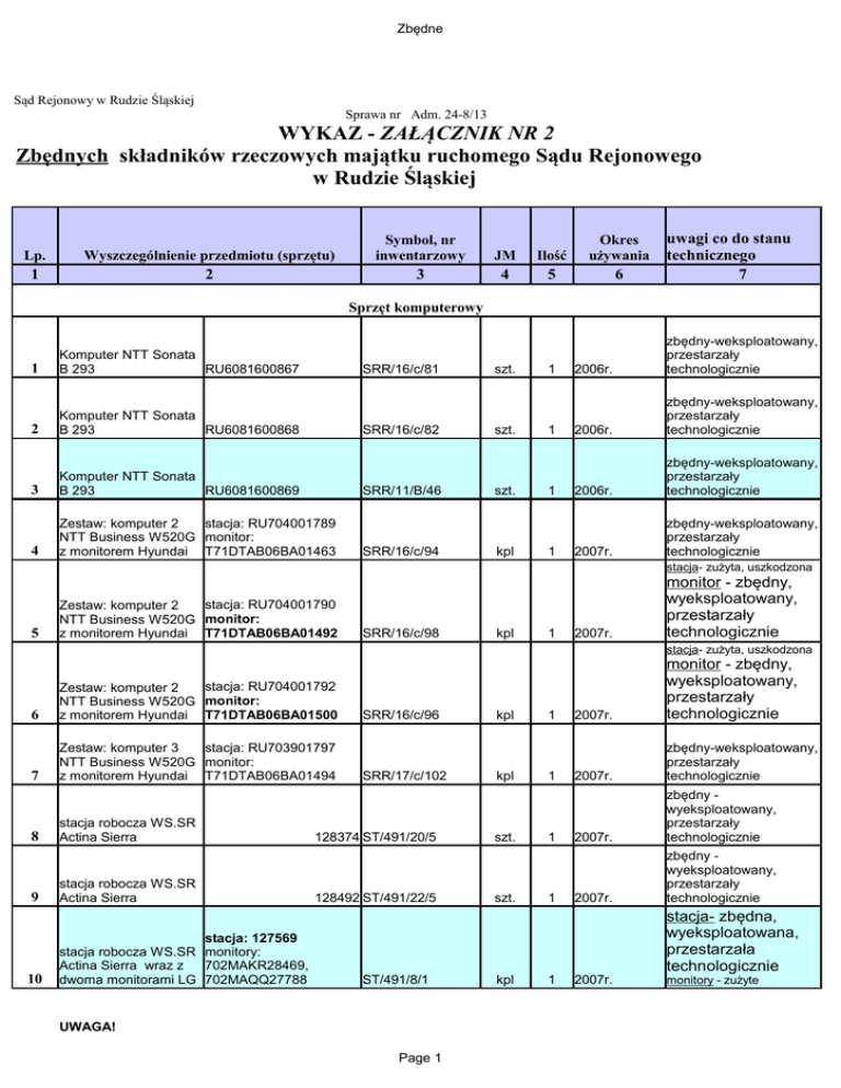 Zbędne Sąd Rejonowy w Rudzie Śląskiej Sprawa nr Adm. 24-8/13 WYKAZ - ZAŁĄCZNIK NR 2 Zbędnych składników rzeczowych majątku ruchomego Sądu Rejonowego w Rudzie Śląskiej Lp. Wyszczególnienie przedmiotu (sprzętu) Symbol, nr inwentarzowy JM Ilość Okres używania 1 2 3 4 5 6 uwagi co do stanu technicznego 7 Sprzęt komputerowy 1 Komputer NTT Sonata B 293 RU6081600867 2 Komputer NTT Sonata B 293 RU6081600868 3 Komputer NTT Sonata B 293 RU6081600869 4 Zestaw: komputer 2 stacja: RU704001789 NTT Business W520G monitor: z monitorem Hyundai T71DTAB06BA01463 SRR/16/c/81 SRR/16/c/82 SRR/11/B/46 SRR/16/c/94 szt. szt. szt. kpl 1 1 1 1 2006r. zbędny-weksploatowany, przestarzały technologicznie 2006r. zbędny-weksploatowany, przestarzały technologicznie 2006r. zbędny-weksploatowany, przestarzały technologicznie 2007r. zbędny-weksploatowany, przestarzały technologicznie stacja- zużyta, uszkodzona 5 stacja: RU704001790 Zestaw: komputer 2 NTT Business W520G monitor: z monitorem Hyundai T71DTAB06BA01492 SRR/16/c/98 kpl 1 2007r. monitor - zbędny, wyeksploatowany, przestarzały technologicznie stacja- zużyta, uszkodzona 6 stacja: RU704001792 Zestaw: komputer 2 NTT Business W520G monitor: z monitorem Hyundai T71DTAB06BA01500 7 Zestaw: komputer 3 stacja: RU703901797 NTT Business W520G monitor: z monitorem Hyundai T71DTAB06BA01494 8 9 10 stacja robocza WS.SR Actina Sierra stacja robocza WS.SR Actina Sierra stacja: 127569 stacja robocza WS.SR monitory: Actina Sierra wraz z 702MAKR28469, dwoma monitorami LG 702MAQQ27788 SRR/16/c/96 SRR/17/c/102 128374 ST/491/20/5 128492 ST/491/22/5 ST/491/8/1 UWAGA! Page 1 kpl kpl szt. szt. kpl 1 1 1 1 1 2007r. monitor - zbędny, wyeksploatowany, przestarzały technologicznie 2007r. zbędny-weksploatowany, przestarzały technologicznie 2007r. zbędny wyeksploatowany, przestarzały technologicznie 2007r. zbędny wyeksploatowany, przestarzały technologicznie 2007r. stacja- zbędna, wyeksploatowana, przestarzała technologicznie monitory - zużyte Zbędne Stacje robocze nie posiadają dysku twardego. Page 2