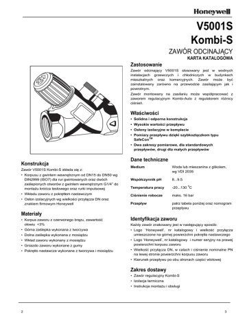 V5001S KOMBI-S V5001S Kombi-S ZAWÓR ODCINAJĄCY KARTA KATALOGOWA Zastosowanie Zawór odcinający V5001S stosowany jest w wodnych instalacjach grzewczych i chłodniczych w budynkach mieszkalnych oraz komercyjnych. Zawór może być zainstalowany zarówno na przewodzie zasilającym jak i powrotnym. Zawór montowany na zasilaniu może współpracować z zaworem regulacyjnym Kombi-Auto z regulatorem różnicy ciśnień. Właściwości • Solidna i odporna konstrukcja • Wysokie wartości przepływu • Osłony izolacyjne w komplecie • Pomiary przepływu dzięki szybkozłączkom typu SafeConTM • Dwa zakresy pomiarowe, dla standardowych przepływów, drugi dla małych przepływów Konstrukcja Dane techniczne Medium Woda lub mieszanina z glikolem, wg VDI 2035 Współczynnik pH 8...9.5 Temperatura pracy 0 -20...130 C • Wkładu zaworu z pokrętłem nastawczym Ciśnienie robocze • Osłon izolacyjnych wg wielkości przyłącza DN oraz znakiem firmowym Honeywell maks. 16 bar Przepływ patrz tabela poniżej oraz nomogram przepływu Zawór V5001S Kombi-S składa się z: • Korpusu z gwintem wewnętrznym od DN15 do DN50 wg DIN2999 (ISO7) dla rur gwintowanych oraz dwóch zaślepionych otworów z gwintem wewnętrznym G1/4” do montażu króćca testowego oraz rurki impulsowej Materiały • Korpus zaworu z czerwonego brązu, zawartość ołowiu <3% • Górna zaślepka wykonana z tworzywa • Dolna zaślepka wykonana z mosiądzu • Wkład zaworu wykonany z mosiądzu • Gniazdo zaworu wykonane z gumy • Pokrętło nastawcze wykonane z tworzywa i mosiądzu Identyfikacja zaworu Każdy zawór znakowany jest w następujący sposób: • Logo ‘Honeywell’, nr katalogowy i wielkość przyłącza umieszczone na górnej powierzchni pokrętła nastawczego • Logo ‘Honeywell’, nr katalogowy i numer seryjny na prawej powierzchni korpusu zaworu • Wielkość przyłącza DN, w calach i ciśnienie nominalne PN na lewej stronie powierzchni korpusu zaworu • Kierunek przepływu po obu stronach części wlotowej Zakres dostawy • Zawór regulacyjny Kombi-S • Izolacja termiczna • Instrukcja montażu i obsługi 2 3 V5001S KOMBI-S Funkcja przepływ Zawór V5001S Kombi-S może być instalowany na przewodzie zasilającym lub powrotnym jako zawór odcinający. • Wysokie ciśnienie: połączenie z Kombi-Auto • Niskie ciśnienie: połączenie z Kombi-S p obiegu Montaż Wymagany szybkozłączny króciec pomiarowy na korpusie zaworu Kombi-Auto (górny otwór) • Wysokie ciśnienie: połączenie z Kombi-S Zawór Kombi-S zastał zaprojektowany jako zawór współpracujący z zaworem regulacyjnym z regulacją różnicy ciśnień. Korpus zaworu posiada możliwość podłączenia rurki impulsowej w celu pomiaru ciśnienia na przewodzie zasilającym oraz pomiaru ciśnienia różnicowego przy pomocy komputera pomiarowego. Rurka impulsowa oraz potrzebne złączki są dostarczane z zaworem Kombi-Auto, który jest zamawiany oddzielnie. • Niskie ciśnienie: połączenie z Kombi-Auto Króciec szybkozłączny SafeCon™ jest dostępny jako akcesoria – patrz “Akcesoria”. Króćce testowe SafeCon™ w zależności od rodzaju wymaganego pomiaru muszą być zainstalowane na zaworze Kombi-Auto lub/i na Kombi-S (jeśli zainstalowany). Jeśli zastosowano inny zawór na zasilaniu, należy zastosować takie metody pomiaru, aby zapewnić możliwość przyłącza rurki impulsowej. Wszystkie zawory muszą być montowane z godnie z kierunkiem przepływu, który jest określony strzałką na korpusie zaworu z obu stron wlotu zaworu. Komputer pomiarowy BasicMes-2 bezpośrednio podłączony do zaworów typu SafeCon zapewnia szybkie i szczelne pomiary. Pomiar przepływu i ciśnienia W korpus zaworu Kombi-S opcjonalnie można zamontować szybkozłączny zawór testowy typu SafeConTM pozwalający na podłączenie komputera pomiarowego, np. VM242 BasicMes-2 oferowany przez firmę Honeywell. Możliwe są następujące rodzaje pomiarów: Punkty pomiarowe Zawór Kombi-S posiada dwa punkty pomiarowe. Punkt pomiarowy A przy pełnym otwarciu zaworu, oraz punkt pomiarowy B przy 25% skoku zaworu. Punkt pomiarowy B jest pomocny w warunkach małych przepływów kiedy w punkcie pomiarowym A występują niestabilne sygnały pomiaru. H Wymiary W W L Rys. 1. Widok z przodu Rys. 2. Widok z boku Rys. 3. Widok z tyłu Tabela 1. Wymiary Bez izolacji termicznej Z izolacją termiczną DN Przyłącze Długość Szerokość Wysokość Długość Szerokość Wysokość Waga 15 Rp1/2” 102 35 89 133 84 122 0.5kg 20 Rp3/4” 101 40 95 130 93 125 0.7kg 25 Rp1” 105 41 101 140 104 136 0.8kg 32 Rp1 1/4“ 140 56 135 171 113 167 1.6kg 40 Rp1 1/2“ 146 66 140 176 126 174 1.9kg 50 Rp2” 158 78 154 200 147 190 2.8kg UWAGA: Jeśli nie podano inaczej wszystkie wymiary w mm. 2 3 V5001S KOMBI-S Oznaczenia katalogowe Tabela 3. Dostępne wersje i numery katalogowe Opis DN Przyłącze Wartość kvs Nr katalogowy Zawór V5001S z gwintem wewnętrznym zgodnym z DIN2999 (ISO7) DN15 Rp1/2” 4.7 V5001SY2015 DN20 Rp3/4” 8.1 V5001SY2020 DN25 Rp1” 10.7 V5001SY2025 DN32 Rp1 1/4” 23.3 V5001SY2032 DN40 Rp1 1/2” 35.3 V5001SY2040 DN50 Rp2” 48.8 V5001SY2050 DN32 DN40 6 DN20 DN25 5.0 4 6.0 7 5 DN15 8 8.7 Nomogram przepływu 10 2 l/h Flow Przepływ l/godz. 0.0028 l/sec 2 3 4 0.01 5 6 7 8 9 100 0.025 2 0.05 3 4 0.1 5 6 7 8 9 1000 0.25 2 P.S.I. 0.145 10 mbar 1 kPa Pressure drop Spadek ciśnienia 2 0.3 3 0.5 4 5 6 7 1.0 8 9 100 10 2.0 2 3.0 4.0 3 DN50 3 0.5 3 V5001S KOMBI-S Akcesoria Części zamienne VM242A BasicMes-2 Komputer pomiarowy przenośny Wymienne wkłady zaworu Dla wszystkich przyłączy. Komputer dostarczany jest w futerale i z akcesoriami VM242A0101 Komplet 2 króćców pomiarowych z gwintem G1/4" Dla wszystkich przyłączy VS2600C001 Zawór odcinający do rurki impulsowej Dla wszystkich przyłączy VS5501A008 For DN15 V5001SZ2015 For DN20 V5001SZ2020 For DN25 V5001SZ2025 For DN32 V5001SZ2032 For DN40 V5001SZ2040 For DN50 V5001SZ2050 Izolacja termiczn