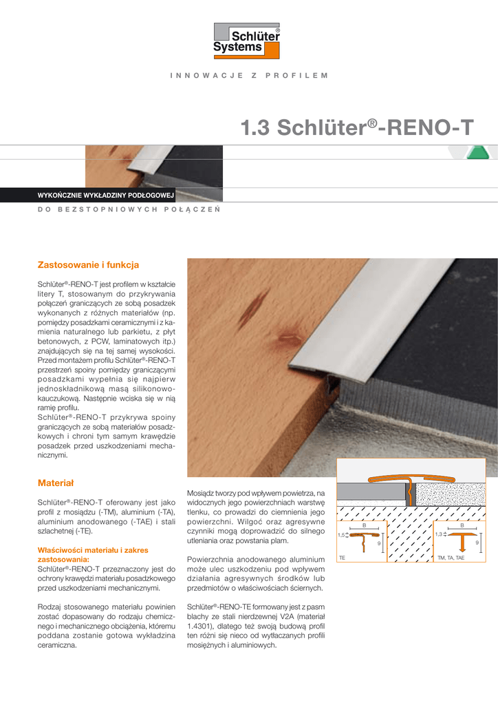 I N N O W A C J E Z P R O F I L E M 1.3 Schlüter®-RENO-T WYKOŃCZNIE WYKŁADZINY PODŁOGOWEJ D O B E Z S TO P NIO W YC H PO ŁĄ C Z E Ń Zastosowanie i funkcja Schlüter®-RENO-T jest profilem w kształcie litery T, stosowanym do przykrywania połączeń graniczących ze sobą posadzek wykonanych z różnych materiałów (np. pomiędzy posadzkami ceramicznymi i z kamienia naturalnego lub parkietu, z płyt betonowych, z PCW, laminatowych itp.) znajdujących się na tej samej wysokości. Przed montażem profilu Schlüter®-RENO-T przestrzeń spoiny pomiędzy graniczącymi posadzkami wypełnia się najpierw jednoskładnikową masą silikonowokauczukową. Następnie wciska się w nią ramię profilu. Schlüter ® -RENO-T przykrywa spoiny graniczących ze sobą materiałów posadzkowych i chroni tym samym kra wędzie posadzek przed uszkodzeniami mechanicznymi. Materiał Schlüter ® -RENO-T oferowany jest jako profil z mosiądzu (-TM), aluminium (-TA), aluminium anodowanego (-TAE) i stali szlachetnej (-TE). Mosiądz tworzy pod wpływem powietrza, na widocznych jego powierzchniach warstwę tlenku, co prowadzi do ciemnienia jego powierzchni. Wilgoć oraz agresywne czynniki mogą doprowadzić do silnego utleniania oraz powstania plam. Właściwości materiału i zakres zastosowania: Schlüter®-RENO-T przeznaczony jest do ochrony krawędzi materiału posadzkowego przed uszkodzeniami mechanicznymi. Powierzchnia anodowanego aluminium może ulec uszkodzeniu pod wpływem działania agresywnych środków lub przedmiotów o właściwościach ściernych. Rodzaj stosowanego materiału powinien zostać dopasowany do rodzaju chemicznego i mechanicznego obciążenia, któremu poddana zostanie gotowa wykładzina ceramiczna. Schlüter®-RENO-TE formowany jest z pasm blachy ze stali nierdzewnej V2A (materiał 1.4301), dlatego też swoją budową profil ten różni się nieco od wytłaczanych profili mosiężnych i aluminiowych. B B 1,3 1,5 9 9 TE TM, TA, TAE 1 .3 Sc hlüte r ® - RE N O -T Obróbka 1. Spoina, w której montowany zostaje profil Schlüter®-RENO-T musi mieć co najmniej 9 mm głębokości i być pozbawiona zanieczyszczeń. Boczne krawędzie spoiny należy oczyścić z wszelkich substancji mogących ograniczać przyczepność silikonu. 2. Przestrzeń spoiny wypełnia się najpierw jednoskładnikową masą silikonowokauczukową. Następnie w tak przygotowaną spoinę wciska się pionowe ramię mocujące profilu Schlüter®-RENO-T, tak aby profil całkowicie oparł się o krawędzie graniczących posadzek. 3. Wydostającą się spod ramion profilu masę silikonowo-kauczukową należy usunąć odpowiednimi środkami czyszczącymi. Wskazówki Schlüter®-RENO-T nie wymaga żadnych specjalnych zabiegów konserwacyjnych lub pielęgnacyjnych. Utlenioną warstwę materiału na profilach mosiężnych i aluminiowych można usunąć przy użyciu dostępnych w handlu środków do polerowania, ale po jakimś czasie pojawia się ona ponownie. Uszkodzenia powierzchni anodowanej naprawić można jedynie przez ich polakierowanie. Powierzchnie ze stali nierdzewnej poddawane działaniu czynników atmosferycznych lub środków agresywnych chemicznie należy od czasu do czasu przeczyścić, stosując w tym celu łagodne środki czyszczące. Regularne czyszczenie zachowuje nie tylko estetyczny wygląd powierzchni stali stopowej, ale zmniejsza także niebezpieczeństwo korozji. Wszelkie stosowane do czyszczenia środki nie mogą zawierać kwasu siarkowego lub fluorowodorowego. Należy unikać kontaktu z innymi metalami, jak np. zwykłą stalą, gdyż doprowadzić może to do odkładania się powstającej na nich rdzy. Dotyczy to także narzędzi takich jak szpachle lub wełna stalowa do usuwania resztek zaprawy. Przegląd produktów: Formularz kosztorysowy: Schlüter®-RENO-T _____ m bieżące profilu Schlüter®-RENO-T jako profil łączący w kształcie litery T szerokość: ■ 14 mm ■ 25 mm z ■ M = mosiądzu ■ A = aluminium ■ AE = aluminium matowo anodowanego ze sfazowanymi końcówkami... TM = mosiądz / TA = aluminium / TAE = aluminium matowo anodowane / TE = stal nierdzewna długość: 2,50 m Materiał TM B = 14 mm • B = 25 mm • TA • • TAE • • TE • • długość: 1,00 m Materiał TM B = 14 mm • B = 25 mm • TA • • TAE • • TE • • _____ m bieżące profilu Schlüter®-RENO-T jako profil łączący w kształcie litery T szerokość: ■ 14 mm ■ 25 mm ■ E = ze stali nierdzewnej z podwójnie sfazowanymi końcówkami, zaokrągloną powierzchnią licową i 9-milimetrowym mostkiem do przykrycia połączeń licujących wysokością posadzek wykonanych z różnych materiałów - dostarczyć i prawidłowo zamontować, przestrzegając wskazówek producenta. Nr artykułu: ____________________________ Materiał: __________________________ €/m Robocizna: ________________________ €/m Cena końcowa: ____________________ €/m Schlüter-Systems KG · Schmölestraße 7 · D-58640 Iserlohn · Tel. 00 49 / 23 71 / 971-0 · Fax 00 49 / 23 71 / 971-111 · Internet www.schlueter-systems.com Art.-Nr. 551 249 – wydanie 06.05 – przy nowym nakładzie wydanie to traci ważność. Stal nierdzewna nadaje się szczególnie do stosowania w miejscach, w których wymagana jest odporność na chemikalia, np. na kwasy lub zasady oraz środki do czyszczenia.