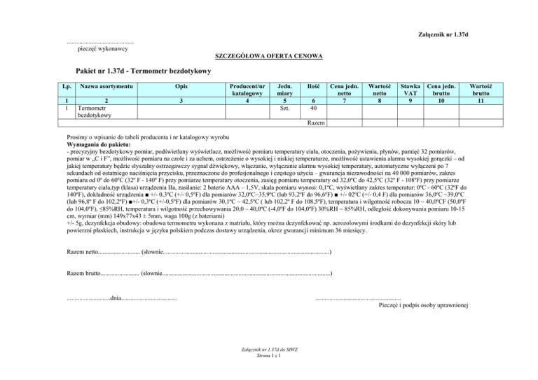 Załącznik nr 1.37d ........................................... pieczęć wykonawcy SZCZEGÓŁOWA OFERTA CENOWA Pakiet nr 1.37d - Termometr bezdotykowy Lp. 1 1 Nazwa asortymentu Opis 2 Termometr bezdotykowy 3 Producent/nr katalogowy 4 Jedn. miary 5 Szt. Ilość 6 40 Cena jedn. netto 7 Wartość netto 8 Stawka VAT 9 Cena jedn. brutto 10 Razem Prosimy o wpisanie do tabeli producenta i nr katalogowy wyrobu Wymagania do pakietu: - precyzyjny bezdotykowy pomiar, podświetlany wyświetlacz, moŜliwość pomiaru temperatury ciała, otoczenia, poŜywienia, płynów, pamięć 32 pomiarów, pomiar w „C i F”, moŜliwość pomiaru na czole i za uchem, ostrzeŜenie o wysokiej i niskiej temperaturze, moŜliwość ustawienia alarmu wysokiej gorączki – od jakiej temperatury będzie słyszalny ostrzegawczy sygnał dźwiękowy, włączanie, wyłączanie alarmu wysokiej temperatury, automatyczne wyłączeni po 7 sekundach od ostatniego naciśnięcia przycisku, przeznaczone do profesjonalnego i częstego uŜycia – gwarancja niezawodności na 40 000 pomiarów, zakres pomiaru od 0º do 60ºC (32º F - 140º F) przy pomiarze temperatury otoczenia, zasięg pomiaru temperatury od 32,0ºC do 42,5ºC (32º F - 108ºF) przy pomiarze temperatury ciała,typ (klasa) urządzenia IIa, zasilanie: 2 baterie AAA – 1,5V, skala pomiaru wynosi: 0,1ºC, wyświetlany zakres temperatur: 0ºC - 60ºC (32ºF do 140ºF), dokładność urządzenia ■ +/- 0,3ºC (+/- 0,5ºF) dla pomiarów 32,0ºC~35,9ºC (lub 93,2ºF do 96,6ºF) ■ +/- 02ºC (+/- 0,4 F) dla pomiarów 36,0ºC ~39,0ºC (lub 96,8º F do 102,2ºF) ■+/- 0,3ºC (+/-0,5ºF) dla pomiarów 30,1ºC ~ 42,5ºC ( lub 102,2º F do 108,5ºF), temperatura i wilgotność robocza 10 ~ 40,0ºCF (50,0ºF do 104,0ºF), ≤85%RH, temperatura i wilgotność przechowywania 20,0 – 40,0ºC (-4,0ºF do 104,0ºF) 30%RH ~ 85%RH, odległość dokonywania pomiaru 10-15 cm, wymiar (mm) 149x77x43 ± 5mm, waga 100g (z bateriami) +/- 5g, dezynfekcja obudowy: obudowa termometru wykonana z matriału, który moŜna dezynfekować np. aerozolowymi środkami do dezynfekcji skóry lub powierzni płaskiech, instrukcja w języku polskiem podczas dostawy urządzenia, okrez gwarancji minimum 36 miesięcy. Razem netto........................... (słownie...........................................................................................................) Razem brutto......................... (słownie............................................................................................................) ............................dnia.................................... ....................................................... Pieczęć i podpis osoby uprawnionej Załącznik nr 1.37d do SIWZ Strona 1 z 1 Wartość brutto 11