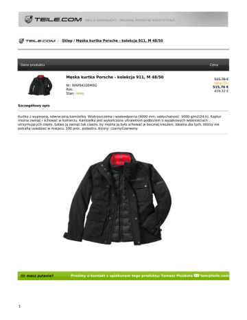 Sklep / Męska kurtka Porsche - kolekcja 911, M 48/50 Dane produktu Cena Męska kurtka Porsche - kolekcja 911, M 48/50 Nr: WAP94100M0G Rok: Stan: nowy 515,76 € rabat 0% 515,76 € 419,32 € Szczegółowy opis Kurtka z wypinaną, odwracalną kamizelką. Wiatroszczelna i wodoodporna (5000 mm, oddychalność: 5000 g/m2/24 h). Kaptur można zwinąć i schować w kołnierzu. Kamizelka jest wykończona ultralekkim podbiciem o wyjątkowych własnościach utrzymujących ciepło. Łatwo ją zwinąć tak ciasno, by można ją było schować w bocznej kieszeni. Idealna dla tych, którzy nie potrafią usiedzieć w miejscu. 100 proc. poliestru. Kolory: czarny/czerwony masz pytanie? 1 Prosimy o kontakt z opiekunem tego produktu: Tomasz Pluskota [email protected] 2 3 4