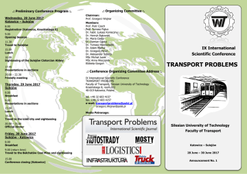 .: Preliminary Conference Program :. Wednesday, 28 June 2017 Katowice – Sulejów 8.00 Registration (Katowice, Krasińskiego 8) 9.00 Opening Session 11.30 Travel to Sulejów 15.00 Lunch 16.00 Sightseeing of the Sulejów Cistercian Abbey 17.45 Presentations in sections 20.00 – 22.30 Friendly meeting Thursday, 29 June 2017 Sulejów 8.00 Breakfast 9.00 Presentations in sections 13.00 Lunch 14.00 Travel to the Łódź city and sightseeing 20.00 – 23.00 Official Dinner Friday, 30 June 2017 Sulejów - Katowice 8.00 Breakfast 9.00 (return time) Travel to the Bełchatów Coal Mine and sightseeing 15.00 Conference closing (Katowice) .: Organizing Committee :. Chairman: Prof. Grzegorz Wojnar Members: Prof. Piotr Czech Prof. Tomasz Figlus Dr. habil. Łukasz Konieczny Dr. Henryk Bąkowski Dr. Maria Cieśla Dr. Damian Gąska Dr. Tomasz Haniszewski Dr. Adam Mańka Dr. Grzegorz Peruń Dr. Aleksander Sobota MSc Michał Juzek MSc Anna Wieczorek Elżbieta Gorgoń IX International Scientific Conference TRANSPORT PROBLEMS .: Conference Organizing Committee Address :. IX International Scientific Conference TRANSPORT PROBLEMS Faculty of Transport, Silesian University of Technology Krasińskiego 8, room 022 40-019 Katowice, Poland tel. +48 32 603 4157 fax. +48 32 603 4157 e-mail: [email protected] [email protected] Media Patronage: Silesian University of Technology Faculty of Transport Katowice – Sulejów 28 June – 30 June 2017 Announcement No. 1 .: International Scientific Committee :. Chairman: Prof. Aleksander Sładkowski (Poland) Co-chairmans: Prof. Bogusław Łazarz Dr. habil. Piotr Folęga Dr. habil. Stanisław Krawiec Dr. habil. Andrzej Fellner Dr. habil. Zbigniew Stanik Prof. Janusz Ćwiek (Poland) (Poland) (Poland) (Poland) (Poland) (Poland) Members: Prof. Anvar Adylhodzaev Prof. Rasim Alguliyev Prof. Gerd-Axel Arens Prof. Vilius Bartulis Prof. Żilwinas Bazaras Prof. Klaus Becker Prof. Tatiana Čorejová Dr. Leopold Hrabovsky Prof. Aleksander Golubenko Prof. Rossen Ivanov Prof. Ajay Kapoor Prof. Mirosław Luft Prof. Gabriele Malavasi Dr. Marija Malenkovska Todorova Dr. Marin Marinov Prof. Mareks Mezitis Prof. Arkadiusz Mężyk Prof. Leszek Mindur Prof. Alfonso Orro Prof. Stanislav Pavlin Prof. Paweł Piec Prof. Dmitrij Pogorelov Prof. Mihaela Popa Prof. Hayrettin Kemal Sezen Prof. Abilio Manuel Pereira da Silva Prof. Nurgali Surashov Prof. George Tumanishvili Prof. Robert Tomanek Prof. Elen Twrdy Prof. Sergey Urushev Prof. Antal Veha Prof. Wojciech Wawrzyński Prof. Tomasz Węgrzyn (Uzbekistan) (Azerbaijan) (Germany) (Lithuania) (Lithuania) (Germany) (Slovakia) (Czech Republic) (Ukraine) (Bulgaria) (Australia) (Poland) (Italy) (Macedonia) (United Kingdom) (Latvia) (Poland) (Poland) (Spain) (Croatia) (Poland) (Russia) (Romania) (Turkey) (Portugal) (Kazakhstan) (Georgia) (Poland) (Slovenia) (Russia) (Hungary) (Poland) (Poland) .: Conference topics :. .: Important dates :. Registration and submission of paper titles 01 May 2017 Conference topics include the following areas: Notification of paper reception 15 May 2017 - road transport, rail transport, air transport, sea transport and inland, - municipal and bicycle transport, - industrial transport, - load preparation, organization and coordination of cargo handling, - logistics centres, integrated transport systems, - intermodal, multimodal and combined transport, - computer systems aided design of transport facilities, - means of transport production, - technical diagnostic of means of transport, - active and passive vehicles safety, - transport systems safety, - traffic forecasting and region requirements, statistical research, - influence of the law regulations on the transport security, - transport management in urban area, - modelling and simulation transport systems, road traffic controllers, - automation in transport, - transport economics, - ecological problems in transport, - influence of transport on health and ergonomic problems, - education in transport industry. Full paper submission 15 May 2017 Payment of the conference fee 30 May 2017 All papers will be published in the conference materials; the selected ones after positive revision will be published in the International Scientific Journal „Transport Problems” (ISSN 1896 – 0596, included in SCOPUS database) or in another journals, which patronizes the conference. Information for authors is located on the website: http://www.transportproblems.polsl.pl/en .: Conference fee :. Participation in the conference: Payment for: • BSc, MSc & PhD students; • accompanying person. 410 euro (1800 zł) 360 euro (1580 zł) Payment includes: participation in the conference, full board, accommodation at a hotel, integration meetings and official dinner, publication costs, conference materials, coach travel, excursions, organization costs. Conference Registration will be made according to the instructions available on the website: http://www.tp.konferencje.polsl.pl Please transfer money to the account at ING Bank Śląski S.A. O Gliwice IBAN PL 60 1050 1230 1000 0002 0211 3056, SWIFT: INGB PL PW with postscript „Conference TP’2017 – name and surname of participant” During the conference and in the conference materials the possibility of company products and activity presentations is provided. Interested persons are asked to contact with the organizing committee.