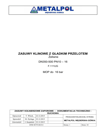 ZASUWY KLINOWE Z GŁADKIM PRZELOTEM Żeliwne DN350-500 PN10 – 16 F.111UG MOP do 16 bar ZASUWY KOŁNIERZOWE ZAPOROWE - DOKUMENTACJA TECHNICZNO RUCHOWA Opracował T. Włoch, 22.12.2015 Sprawdził M. Dyrlaga 22.12.2015 Zatwierdził J. Karpiński 22.12.2015 DTR 50/TT/2015/2 PRODUCENT/WŁAŚCICIEL WYROBU METALPOL WĘGIERSKA GÓRKA Strona 1 Stron: 10 Spis treści: 1. OPIS TECHNICZNY 1.1. Nazwa i cechy wyrobu. 1.2. Przeznaczenie 1.3. Budowa i działanie 1.4. Klasa szczelności 1.5. Materiały. 1.6. Aprobaty techniczne i atesty 1.7. Normalizacja 2. ODMIANY KONSTRUKCYJNE 3. ZNAKOWANIE ZASUW. 4. MONTAŻ I OBSŁUGA 4.1 Zabezpieczenie na czas transportu 4.2. Montaż w rurociągu 4.3. Obsługa i konserwacja 5. POSTĘPOWANIE PODCZAS LIKWIDACJI ZASUWY 6. GWARANCJA DTR 50/TT/2015/2 Strona: 2 Stron: 10 1. OPIS TECHNICZNY 1.1. Nazwa i cechy wyrobu. Przedmiotem niniejszej DTR jest: 1.2. Zasuwa klinowa z gładkim przelotem z żeliwa sferoidalnego z pełnym i równym przelotem z organem zamykającym pokrytym elastomerem z wrzecionem nie wznoszącym się z wewnętrznym gwintem wrzeciona Przeznaczenie Zasuwy opisane jak w punkcie 1.1. przeznaczone są do zamykania i otwierania przepływu cieczy czystych, w tym czystej wody pitnej, chemicznie nie agresywnych, wolnych od zanieczyszczeń ciałami stałymi, o temperaturze maksymalnej czynnika do 700 C i ciśnieniu nominalnym do 16 bar. Zasuwy opisane jak wyżej mogą być zabudowane w rurociągu podziemnym i nadziemnym ( poziomym lub pionowym). Tabela 1 – Zakresy ciśnienia, temperatury. DN 350-500 Maksymalne ciśnienie robocze MOP Ciśnienie szczelności zewnętrznej 10 16 bar 17 25 Ciśnienie szczelności zamknięcia Dopuszczalna temperatura czynnika 0 11 18 C 70 Na życzenie zasuwy mogą być dostosowane do wody o temperaturze do 1100 C i ciśnieniu 10 bar. 1.3. Budowa i działanie (Rys.1, Tab.2) Główne części zasuwy pokazane są na rys.1 . Część zewnętrzną zasuwy tzw. powłokę stanowią kadłub i pokrywa, które są połączone śrubami; połączenie uszczelnione jest pierścieniem uszczelniającym „O” lub specjalną uszczelką profilowaną . Kadłub zasuwy ma kształt trójnika kołnierzowego, w którym część rurowa posiada przelot główny o przekroju kołowym (pełnym i równym), natomiast odgałęzienie ma przekrój owalny. Część rurowa zakończona jest kołnierzami do połączenia z rurociągiem. Odgałęzienie owalne posiada kołnierz owalny do połączenia z pokrywą . Wewnętrzna średnica przelotu głównego, zwana wymiarem nominalnym zasuwy i oznaczona przez DN jest znormalizowana; również długość kadłuba FTF i przyłącza kołnierzowe są znormalizowane. Odgałęzienie owalne kadłuba stanowi komorę w której przemieszcza się organ zamykający (klin) pokryty gumą. Klin jest elementem zamykającym przelot i jest ściśle dopasowany do specjalnie ukształtowanego siedliska, które mieści się w części owalnej i rozdziela przelot główny. Ponadto w części owalnej, w płaszczyźnie prostopadłej do osi przelotu głównego znajdują się prowadnice, w których ślizgają się prowadniki klina. Prowadnice i prowadniki klina wymuszają ruch postępowy klina oraz zabezpieczają klin przed nadmiernymi drganiami pochodzącymi od przewodzonego czynnika. DTR 50/TT/2015/2 Strona: 3 Stron: 10 Pokrywa ma kształt czaszy, do której przykręcona jest wstawka łożyskowa z tuleją mosiężną. W wstawce włożona jest mosiężna tuleja, która ustala pozycję wrzeciona. Pary wstawka / tuleja, tuleja/ wrzeciono uszczelnione są pierścieniami uszczelniającymi o przekroju „O”. Wrzeciono monolityczne ze stali nierdzewnej posiada kołnierzyk oporowy, który działa jak oporowe łożysko ślizgowe i służy do ustalenia pozycji wzdłużnej wrzeciona. Część wrzeciona pod kołnierzykiem oporowym, która znajduje się we wnętrzu powłoki zasuwy, posiada walcowany gwint trapezowy współpracujący z nakrętką mosiężną osadzoną w uchu klina. Część wrzeciona wychodząca z powłoki zasuwy, posiada czworokątny czop, na którym mocuje się kółko ręczne (w zasuwach do rurociągów nadziemnych) lub czworokątny kaptur (w zasuwach do rurociągów podziemnych ). Rys. 1 – Budowa zasuwy zaporowej 1 – kadłub 2 – pokrywa 3 – klin ogumowany 4 – wstawka łożyskowa 5 – wrzeciono 6 – nakrętka wrzeciona DTR 50/TT/2015/2 7 – tuleja 8 – uszczelnienie pokrywy z kadłubem 9 –uszczelnienie tulei z pokrywą 10 – uszczelnienie wrzeciona 11– śruby z łbem walcowym 12 – śruba z uchem 13 - łożyska Strona: 4 Stron: 10 Tab. 2 – Wymiary zasuw klinowych. K 1,0 1,6 bar bar d L DN FTF Szer.14 D 350 290 520 460 470 430 430 400 310 580 515 525 480 480 500 350 715 620 650 582 609 1,0 bar C 1,6 bar i a Dk A B H Masa (kg) 23 28 16 27,4 500 252 564 1125 239 4 28 31 16 27,4 500 262 616 1161 302 31,5 4 28 34 20 32,4 640 304 758 1435 506 1,6 bar f 1,0 bar 26,5 4 28 - masa bez kółka ręcznego; odchyłki od masy nominalnej zasuw w granicach ± 5%. Tabela 3 – Średnice kółek ręcznych, ilości obrotów. DN DK 350 400 500 500 500 640 Tr – LH mm 32 x 6 32 x 6 44 x 8 a Czop wrzeciona 27 27 32 Il. obr. wrzeciona od pełnego otwarcia do pełnego zamknięcia 1/n 59 67 63 Tabela 4 – Momenty zamykania / otwierania zasuw. DN Momenty zamykania / otwierania (Nm) 350 400 500 250 250 350 Tabela 5 – Wymiary pierścieni uszczelniających. DN Pierśc. uszcz. „O” D x d (mm) Szt. 32,2 x 3 3 40,2 x 3 1 45,2 x3 58,0 x3 3 1 350-400 500 DTR 50/TT/2015/2 Strona: 5 Stron: 10 Pod i nad kołnierzykiem oporowym wrzeciona umieszczone są łożyska, które zmniejszają tarcie między kołnierzykiem oporowym, a wstawką z tuleją mosiężną. Obroty kółka ręcznego przekazywane są na wrzeciono i poprzez nakrętkę wrzeciona zostają zamienione na ruch postępowy klina. Obracanie kółkiem ręcznym w kierunku zgodnym z ruchem wskazówek zegara powoduje zamykanie zasuwy, obracanie w kierunku przeciwnym – otwieranie zasuwy. Kierunek zamyk