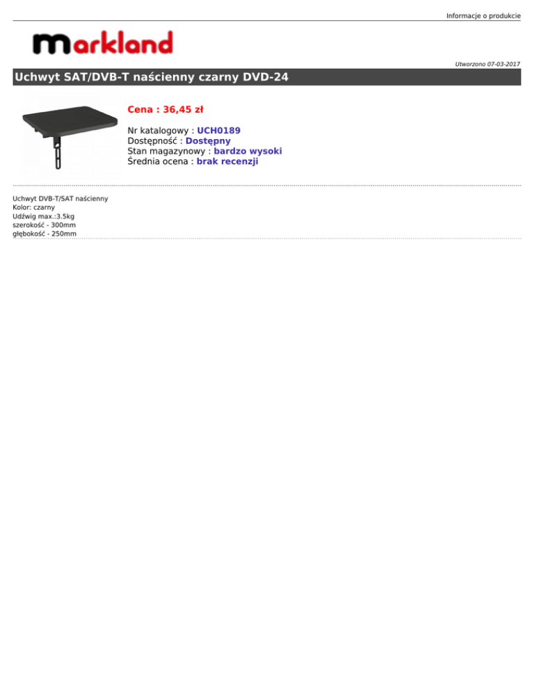 Informacje o produkcie Utworzono 07-03-2017 Uchwyt SAT/DVB-T naścienny czarny DVD-24 Cena : 36,45 zł Nr katalogowy : UCH0189 Dostępność : Dostępny Stan magazynowy : bardzo wysoki Średnia ocena : brak recenzji Uchwyt DVB-T/SAT naścienny Kolor: czarny Udźwig max.:3.5kg szerokość - 300mm głębokość - 250mm