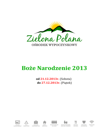 Boże Narodzenie 2013 od 21.12.2013r. (Sobota) do 27.12.2013r. (Piątek) SZCZEGÓŁOWY PROGRAM POBYTU: "Najbogatszy program w całych Bieszczadach"! (Pobyt można rozpocząć w dowolnie wybranym dniu. Pobyt rozpoczyna się obiadokolacją w dniu przyjazdu i kończy się śniadaniem w dniu wyjazdu. Na powitanie dla wszystkich kubek grzanego wina z nutą przypraw korzennych, upominek dla dzieci). 21 - 23 Grudnia (Sob-Pon) - Śniadanie w formie bufetu szwedzkiego - Możliwość skorzystania z Sauny, sali zabaw, świetlicy, bilard, piłkarzyki, stół do tenisa stołowego, - Wypożyczenie zestawu do nordic walking gratis! - Trzy-daniowa Obiadokolacja - Kino malucha czyli najlepsze filmy i bajki dla dzieci, a w nich ulubieni bohaterowie - Sala Kominkowa ze wspólnym kolędowaniem przy kominku z bufetem słodkości i regionalnym grzańcem. 24 Grudnia (Wtorek) - Wigilia - Postne Śniadanie - Rodzinne tworzenie ozdób choinkowych oraz wspólne ubieranie choinki - Magiczna Kolacja Wigilijna - przepełniona świątecznymi aromatami, składająca się z 12 tradycyjnych potraw. Nie zabraknie pierogów, potraw z ryby (Karpia w galarecie i śledzia po staropolsku), pierogów regionalnych, kwasówki, kapusty z grochem, gołąbków z ziemniaków, paluszki z makiem, kompotu z suszu czy barszczyku z uszkami. Do tego także Ciasta (makowiec, piernik ,sernik, orzechowo-serowy) - Spotkanie ze Świętym Mikołajem – prezenty dla każdego dziecka - Pasterka. Po wspólnym kolędowaniu zapraszamy do kościółka w Słonnym na Pasterkę, gdzie można podziwiać piękną szopkę z siana. 25 Grudnia (Środa): - Świąteczne Śniadanie - tradycyjnie i na syto. Mi.n.: żur staropolski, zestaw serów i wędlin, sałatki, roladki faszerowane, jajko sadzone na plastrze boczku lub jajecznica, ciasto świąteczne, owoce, soki, kawa, herbata, pieczywo, - Bajkowy Czar - Świąteczna Sala Zabaw, a w niej gry, kolorowanki, zabawki i wiele innych, - Zabawa mikołajkowa dla najmłodszych, z muzyką i animatorami, - Kolacja Świąteczna, m.in.: krem z borowików, pieczeń wieprzowa w sosie z kluską śląską, zestaw surówek, kompot wiśniowy, deser - ciasto - Christmas Party - dla dorosłych! Nie koniecznie z kolędami...! Zapraszamy do zabawy tanecznej na całego przy muzyce z profesjonalnym i doświadczonym Dj-em/Wodzierejem. Bawimy się od godziny 20:00 przy największych hitach lat 70-tych, 80-tych oraz współczesnych. Swoje pociechy możecie Państwo zostawić pod opieką naszych opiekunów. Szczegóły do ustalenia na miejscu. 26 Grudnia (Czwartek): - Świąteczne Śniadanie - tradycyjnie i na syto - 5-godzinny Kulig (dodatkowo płatny) Stadnina Koni lub wyjście z Przewodnikiem w góry, - Rodzinne Świąteczne Karaoke z nagrodami – śpiewać każdy może! - Kolacja Świąteczna, m.in.: rosół tradycyjny, ziemniaczki z koperkiem, schab faszerowany grzybami, zestaw surówek, kompot z suszu, deser-puchar owocowy. - Niezapomniane Ognisko z Grzańcem, z pieczeniem prosiaka i kiełbasek! - Kino nocne na wieeelkim ekranie. Duży wybór filmów polskich i zagranicznych. Zapewniamy, że nie będzie, to "Kevin sam w domu..." W cenie pobytu! Tylko u nas! Występ i wspólne Kolędowanie z utytułowaną Kapelą Ludową - "Bachórzanie" 27 grudnia (Piątek): - Śniadanie w formie bufetu szwedzkiego - Możliwość skorzystania z Sauny, sali zabaw, świetlicy, bilard, piłkarzyki, stół do tenisa stołowego, - Po obfitych Świętach, proponujemy wyjście w góry. Wypożyczenie zestawu do nordic walking gratis! - Możliwość dokupienia obiadu. Opcjonalnie: - 5-godzinny Kulig z pochodniami, z ogniskiem. Koszt 89zł od osoby. Dzieci w wieku 5-12 lat - 59zł, do 4 lat bezpłatnie. - 3 wyciągi narciarskie w okolicy Ośrodka. - Oferujemy Transport do naszego Ośrodka oraz na stoki narciarskie. Szczegóły do ustalenia. - Wycieczka piesza z przewodnikiem. Min. 6 osób. Koszt. 250zł - Profesjonalna stadnina koni z instruktorami. Koszt od 35zł za osobę. * Warunkiem potwierdzenia rezerwacji jest wpłata zadatku w wysokości 50% * Dzieci do lat 6 gratis. Dzieci w wieku 7-14 lat 50% ceny. * Doba hotelowa trwa od godz. 13:00 do 12:00 * Możliwość wykupienia pakietu w z mniejszą lub większą ilością noclegów. * Za skrócony pobyt nie zwracamy środków. * Śniadania serwujemy od godziny 8:30 do 10:30. * Obiadokolacja wydawana jest w godzinach 16:00-18:00. Kontakt Ośrodek Wypoczynkowy Zielona Polana 37-750 Dubiecko, Łączki 2 (woj. Podkarpackie) (Współrzędne GPS: N49° 46' 59", E22° 20' 30") Informacje i Rezerwacje Kontakt 7 dni w tygodniu (w godzinach 8:00-20:00) Tel/fax. +48 16 651 24 70 Tel. kom. + 48 500 510 420 Tel. kom. + 48 600 660 690 E-mail: [email protected]