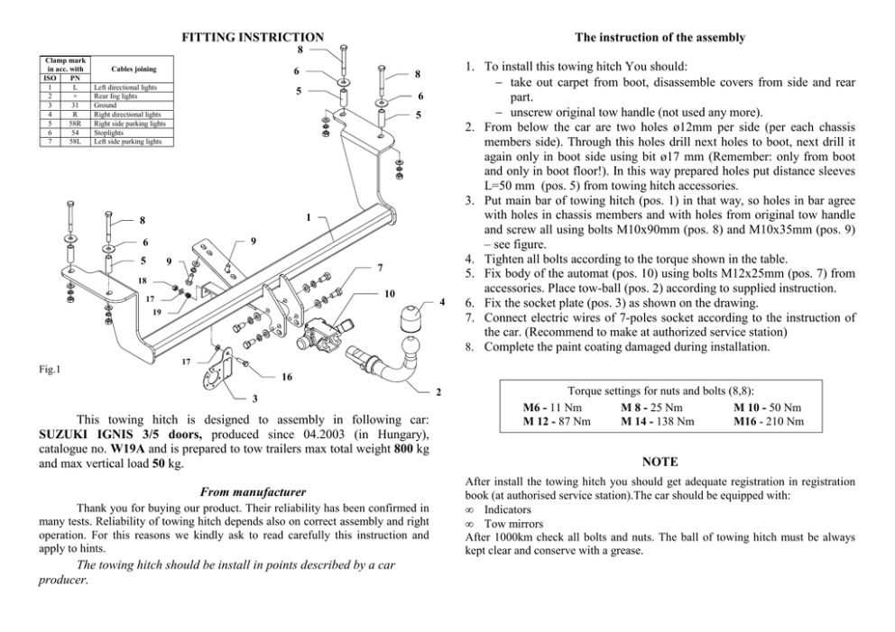 FITTING INSTRICTION The instruction of the assembly 8 Clamp mark in acc. with ISO PN 1 L 2 + 3 31 4 R 5 58R 6 54 7 58L Cables joining Left directional lights Rear fog lights Ground Right directional lights Right side parking lights Stoplights Left side parking lights 6 8 5 6 5 1 8 9 6 5 9 7 18 10 17 4 19 Fig.1 1. To install this towing hitch You should: − take out carpet from boot, disassemble covers from side and rear part. − unscrew original tow handle (not used any more). 2. From below the car are two holes ø12mm per side (per each chassis members side). Through this holes drill next holes to boot, next drill it again only in boot side using bit ø17 mm (Remember: only from boot and only in boot floor!). In this way prepared holes put distance sleeves L=50 mm (pos. 5) from towing hitch accessories. 3. Put main bar of towing hitch (pos. 1) in that way, so holes in bar agree with holes in chassis members and with holes from original tow handle and screw all using bolts M10x90mm (pos. 8) and M10x35mm (pos. 9) – see figure. 4. Tighten all bolts according to the torque shown in the table. 5. Fix body of the automat (pos. 10) using bolts M12x25mm (pos. 7) from accessories. Place tow-ball (pos. 2) according to supplied instruction. 6. Fix the socket plate (pos. 3) as shown on the drawing. 7. Connect electric wires of 7-poles socket according to the instruction of the car. (Recommend to make at authorized service station) 8. Complete the paint coating damaged during installation. 17 16 3 This towing hitch is designed to assembly in following car: SUZUKI IGNIS 3/5 doors, produced since 04.2003 (in Hungary), catalogue no. W19A and is prepared to tow trailers max total weight 800 kg and max vertical load 50 kg. From manufacturer Thank you for buying our product. Their reliability has been confirmed in many tests. Reliability of towing hitch depends also on correct assembly and right operation. For this reasons we kindly ask to read carefully this instruction and apply to hints. The towing hitch should be install in points described by a car producer. 2 Torque settings for nuts and bolts (8,8): M6 - 11 Nm M 8 - 25 Nm M 10 - 50 Nm M 12 - 87 Nm M 14 - 138 Nm M16 - 210 Nm NOTE After install the towing hitch you should get adequate registration in registration book (at authorised service station).The car should be equipped with: • Indicators • Tow mirrors After 1000km check all bolts and nuts. The ball of towing hitch must be always kept clear and conserve with a grease. PPUH AUTO-HAK S. J. Towing hitch accessories: Produkcja Zaczepów Kulowych Henryk & Zbigniew Nejman 76-200 SŁUPSK ul. Słoneczna 16K tel/fax (059) 8-414-414; 8-414-413 E-mail: [email protected] www.autohak.com.pl Towing hitch (without electrical set) Class: A50-X Cat. no. W19A Designed for: Manufacturer: SUZUKI Model: IGNIS Type: 3/5 doors produced since 04.2003 (in Hungary) Technical data: D-value: 5,1 kN maximum trailer weight: 800 kg maximum vertical cup load: 50 kg Approval number according to Directive 94/20/EC: e20*94/20*1141*00 Foreword This towing hitch is designed according to rules of safety traffic regulations. The towing hitch is a safety component and must be installed only by qualified personnel. Any alteration or conversion to the towinh hitch is prohibited and would lead to cancellation of design certification. Remove insulating compound and underseal from vehicle (if present) in the area of the matting surfaces of the towing hitch. The vehicle manufacturer’s specifications regarding trailer load and max. vertical cup load are decisive for driving, and values for the towing hitch must not be exceeded. D-value formula: Max trailer weight [kg] x Max vehicle weight [kg] 9,81 = D [kN] X 1000 Max trailer weight [kg] + Max vehicle weight [kg] INSTRUKCJA MontaŜu i eksploatacji zaczepu kulowego Oznaczenie zacisku wg ISO PN 1 L 2 + 3 31 4 R 5 58R 6 54 7 58L Kolejność czynności przy montaŜu 8 Łączenie przewodów Kierunkowskazy lewe Tylne światła przeciwmgłowe Masa Kierunkowskazy prawe Światła pozycyjne prawe Światła hamowania Światła pozycyjne lewe 6 8 5 6 5 1 8 6 9 9 5 7 18 10 17 4 19 Rys.1 1. W celu zamontowania zaczepu naleŜy: − z bagaŜnika wyjąć dywaniki, zdemontować osłonę ze ścianek bocznych oraz tylniego płata. − odkręcić fabryczne ucho do holowania (nie będzie ponownie montowane). 2. Od spodu samochodu znajdują się po dwa z prawej i lewej strony podłuŜnicy otwory ø12mm, poprzez które naleŜy przewiercić otwory do wnętrza bagaŜnika, a następnie rozwiercić je ø17 mm (tylko te w podłodze bagaŜnika). W tak przygotowane otwory wsunąć tulejki dystansowe L=50mm (poz. 5) z wyposaŜenia zaczepu. 3. PrzyłoŜyć belkę zaczepu (poz. 1) tak, aby otwory zaczepu pokryły się z otworami w podłuŜnicach i w miejscach po odkręconym uchwycie do holowania i skręcić śrubami M10x90mm (poz. 8) oraz M10x35mm (poz. 9) – patrz rysunek. 4. Dokręcić wszystkie śruby z momentem, jak pokazano w tabeli. 5. Przykręcić korpus automatu poz. 10 śrubami M12x25mm poz. 7. Zamocować kulę zgodnie z instrukcją dołączaną do zaczepu z końcówką szybkodemontowalną. 6. Przykręcić blachę pod gniazdo (poz. 3) zgodnie z rysunkiem. 7. Podłączyć przewody z gniazdka 7 – bieg. do instalacji elektrycznej zgodnie z instrukcją fabryczną samochodu (zaleca się wykonanie w ASO). 8. Uzupełnić ewentualne ubytki powłoki malarskiej zaczepu powstałe w trakcie montaŜu. 17 16 2 3 Zaczep kulowy przeznaczony jest do zamontowania w samochodzie SUZUKI IGNIS 3/5 drz. produkowanego od 04.2003r. na Węgrzech, nr katalogowy W19A i słuŜy do ciągnięcia przyczep o masie całkowitej 800 kg i nacisku na kulę max 50 kg. OD PRODUCENTA Dziękujemy za wybór produkowanego przez naszą firmę zaczepu kulowego. Jego niezawodność została potwierdzona licznymi testami oraz opiniami zadowolonych klientów. JednakŜe niezawodność zaczepów kulowych jest zaleŜna równieŜ od prawidłowego montaŜ