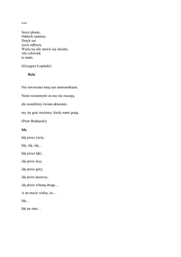 *** Serce płonie, Oddech zamiera. Dotyk ust życie odbiera. Wielu tej sile stawić się chciało, Ale człowiek to mało. (Grzegorz Łopiński) Rola Nie stworzono tutaj nas marionetkami. Nami rozumnymi za nas nie ruszają, ale zostaliśmy świata aktorami, my się grać możemy, kiedy nami grają. (Piotr Bednarski) Idę Idę przez życie, Idę, idę, idę… Idę przez łąki, idę przez lasy, idę przez góry, idę przez puszcze, idę przez własną drogę… A na mecie widzę, że… Idę… Idę na start… Cyrkiel Tu zrobię koło, tu okrąg wykreślę, tu obliczę wzgórza, tam lasy nakreślę, tam oczy narysuje, igłę w środek wbiję… Coś wielkiego stworzę. A gdy człek zobaczy, w mig człek się wzruszy. (Aleksander Gawart)