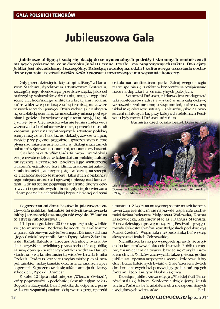 GALA POLSKICH TENORÓW Jubileuszowa Gala Jubileusze obligujà i stajà si´ okazjà do sentymentalnych podró˝y i skromnych reminiscencji majàcych pokazaç to, co w dorobku Jubilata cenne, trwa∏e i ma progresywny charakter. Dzisiejszy Jubilat jest niecodzienny i szczególny. Dziesiàtà rocznic´ narodzin i kulturowego wzrastania obchodzi w tym roku Festiwal Wielka Gala Tenorów i towarzyszàce mu wspania∏e koncerty. osiada nad amfiteatrem parku Zdrojowego, magia teatru spe∏nia si´, a efektem koncertów sà rozÊpiewane noce na deptaku i w sanatoryjnych pokojach. Szanowni Paƒstwo, nie∏atwo jest zredagowaç taki jubileuszowy adres i wyraziç w nim ca∏à oktaw´ wzruszeƒ i szalone tempo wspomnieƒ, które tworzà uk∏adank´ obrazów, sytuacji i aplauzów, jakie na przestrzeni minionych lat, przy kolejnych ods∏onach Festiwalu by∏y moim i Paƒstwa udzia∏em. Burmistrz Ciechocinka Leszek Dzier˝ewicz Gdy przed dziesi´ciu laty „dopinaliÊmy” z Dariuszem Stachurà, dyrektorem artystycznym Festiwalu, szczegó∏y tego donios∏ego przedsi´wzi´cia, jako cel nadrz´dny wskazaliÊmy dzia∏ania, majàce wype∏niç scen´ ciechociƒskiego amfiteatru kreacjami i rolami, które widzowie poniosà z sobà i zapiszà na zawsze w swych sercach i pami´ci. DziÊ z radoÊcià i nieukrywanà satysfakcjà oceniam, ˝e mieszkaƒcy miasta pod t´˝niami, goÊcie i kuracjusze z aplauzem przyj´li t´ inicjatyw´, by w Ciechocinku w∏aÊnie letnie randez vous wyznaczali sobie bohaterowie oper, operetek i musicali kreowani przez najwybitniejszych artystów polskiej sceny muzycznej. I tak ju˝ od dekady, zawsze w lipcu, zwykle przy pi´knej pogodzie i gwieêdzistym niebie p∏ynà nad miastem arie, kawatyny, dialogi muzycznych bohaterów Êpiewane sopranami, tenorami czy basami. Ciechociƒska Wielka Gala Tenorów ju˝ zdoby∏a swoje trwa∏e miejsce w kalendarium polskiej kultury muzycznej. Recenzenci, podkreÊlajàc wirtuozeri´ wykonaƒ, estradowy luz i klimat znakomitej zabawy z publicznoÊcià, zachwycajà si´ i wskazujà na specyfik´ ciechociƒskiego teathronu. JakiÊ duch opiekuƒczy tego miejsca unosi si´ i sprawuje piecz´ nad koncertami. Gdy na scenie pojawiajà si´ s∏ynne duety z operowych i operetkowych librett, gdy ciep∏o wieczoru i s∏ony posmak ciechociƒskiej bryzy niesionej od t´˝ni „Usta milczà” z opery „Weso∏a Wdówka” w wykonaniu artystów: Doroty Laskowieckiej, Dariusza Stachury, Ma∏gorzaty Walewskiej i Zbigniewa Maciasa. Tegoroczna ods∏ona Festiwalu jak zawsze zachwyci∏a publik´. Jednak˝e tej edycji towarzyszy∏a jakby jeszcze wi´ksza magia ni˝ zwykle. W koƒcu to edycja jubileuszowa… 11 lipca o godzinie 20.00 rozpocz´∏o si´ wielkie Êwi´to muzyczne. Podczas koncertu w amfiteatrze w parku Zdrojowym zatytu∏owanego „Dariusz Stachura i Jego GoÊcie” wystàpili: Anna Dytry, Adam Zdunikowski, Ka∏udi Ka∏udow, Tadeusz Szlenkier, Iwona Socha i oczywiÊcie uwielbiany przez ciechociƒskà publik´ za swój dowcip i serdeczny kontakt z widzami Dariusz Stachura. Swà konferansjerkà widzów bawi∏a Emilia Czeka∏a. Podczas koncertu wybrzmia∏y pieÊni neapolitaƒskie, meksykaƒskie oraz arie ze znanych oper i operetek. Zaprezentowa∏a si´ tak˝e formacja dudziarzy szkockich „Pipes & Drumes”. Z kolei 12 lipca mia∏ miejsce „Wieczór Gwiazd”, który poprowadzi∏ - podobnie jak w ubieg∏ym roku Bogus∏aw Kaczyƒski. Bawi∏ publik´ dowcipem, a porusza∏ serca wspania∏à znajomoÊcià Êwiata opery, operetki i musicalu. Z kolei na muzycznej scenie muszli koncertowej zaprezentowa∏y si´ naprawd´ wspania∏e osobistoÊci Êwiata belcanto: Ma∏gorzata Walewska, Dorota Laskowiecka, Zbigniew Macias i Dariusz Stachura. Po raz dziesiàty opraw´ muzycznà Festiwalu przygotowa∏a Orkiestra Symfoników Bydgoskich pod dyrekcjà Marka Czeka∏y. Wspania∏à niespodziankà by∏ wyst´p skrzypaczki Izabeli ˚ebrowskiej. Niemilknàce brawa po wyst´pach sprawi∏y, ˝e artyÊci obu koncertów wielokrotnie bisowali. Robili to ch´tnie, z uÊmiechem na twarzy, bawiàc si´ muzykà i urokiem chwili. Widzów zachwyca∏a tak˝e pi´kna, godna jubileuszu oprawa artystyczna sceny - kolorowe ∏ab´dzie i burza fioletowych kwiatów. Zwieƒczeniem dwóch dni koncertowych by∏ porywajàcy pokaz taƒczàcych fontann, które lÊni∏y w blasku ksi´˝yca… Dziesiàta jubileuszowa edycja „Wielkiej Gali Tenorów” sta∏a si´ faktem. Serdecznie dzi´kujemy, ˝e tak wielu z Paƒstwa by∏a udzia∏em obu niezapomnianych i wyjàtkowych wieczorów. Red. 13 ZDRÓJ CIECHOCI¡SKI lipiec 2014 Wielka Gala Tenoró ów - 10 lat min´∏o... GALA POLSKICH TENORÓW Rozmowa z Dariuszem Stachurà - W tym roku odby∏a si´ X, jubileuszowa Gala Polskich Tenorów i po raz 10 pe∏ni∏ pan funkcj´ dyrektora artystycznego tego wydarzenia. Czy pami´ta Pan pierwszà edycj´ tej imprezy i kto wpad∏ na pomys∏ organizacji jej w∏aÊnie w Ciechocinku? - Zdziwi∏bym si´ gdyby dyrektorem tego festiwalu Skrzypaczka Izabela ˚ebrowska przylecia∏a na Gal´ ze Stanów Zjednoczonych. by∏ ktoÊ inny. Sam pomys∏ na koncert powsta∏ w obr´bie trzech osób. Po pierwsze Pana profesora Szymona Kubiaka - mojego przyjaciela, u którego kilka lat wczeÊniej leczy∏em si´, a raczej ∏adowa∏em baterie, bioràc zabiegi w Szpitalu Wojskowym na gard∏o. To On w∏aÊnie poprosi∏ mnie, a w∏aÊciwie zapyta∏ czy móg∏bym zorganizowaç Mu koncert na zjazd dla laryngologów sanatoryjnych. Pan Burmistrz Leszek Dzier˝ewicz, który mia∏ w danej chwili zapotrzebowanie na drugi koncert, dope∏ni∏ reszt´. Ja oczywiÊcie ucieszy∏em si´ i powiedzia∏em, ˝e z przyjemnoÊcià podejm´ si´ zorganizowania obydwu koncertów. Po wielkim sukcesie pierwszej edycji tej imprezy, nast´pny rok by∏ tylko formalnoÊcià, aby stworzyç nowe wydarzenie artystyczne pod moim kierownictwem. Rozpocz´∏o si´ koncertami, a zmieni∏o si´ w cykl coroc