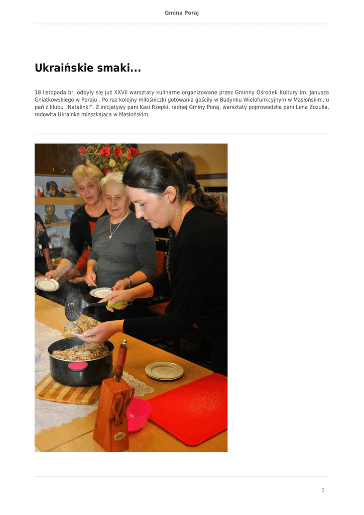 Gmina Poraj Ukraińskie smaki... 18 listopada br. odbyły się już XXVII warsztaty kulinarne organizowane przez Gminny Ośrodek Kultury im. Janusza Gniatkowskiego w Poraju . Po raz kolejny miłośniczki gotowania gościły w Budynku Wielofunkcyjnym w Masłońskim, u pań z klubu „Natalinki”. Z inicjatywy pani Kasi Rzepki, radnej Gminy Poraj, warsztaty poprowadziła pani Lena Zozulia, rodowita Ukrainka mieszkająca w Masłońskim. 1 Gmina Poraj Fot. arch. GOK w Poraju W Masłońskim odbyły się kolejne Warsztaty Kulinarne. Tym razem z inicjatywy radnej Katarzyny Rzepki W menu znalazły się dania rodem z Ukrainy. Wśród przepysznych potraw znalazła się sałatka jarzynowa oliwije z dodatkiem drobiowej wędliny lub mortadeli, ryż z makaronem oraz barszcz ukraiński z grzankami czosnkowymi i słoniną specjalnie na tą okazję przywiezioną z Ukrainy. Zwieńczeniem uczty był słodki deser tiramisu z malinami przygotowany przez panią Jolantę Płatek. Poniżej przepisy na ukraiński specjały: SAŁATKA OLIWIJE SKŁADNIKI: 6 średnich ziemniaków ugotowanych w mundurkach 10 jajek ugotowanych na twardo 3-4 ogórki kiszone 40 dag. Mortadeli / drobiowej wędliny 1-2 szt. cebuli puszka groszku majonez PRZYGOTOWANIE: Wszystkie składniki kroimy w drobną kostkę i mieszamy. RYŻ Z MAKARONEM SKŁADNIKI: 250g makaron nitki 1kg ryżu kostka masła sól PRZYGOTOWANIE: Przepłukany ryż wrzucamy do garnka z bardzo dużą ilością zimnej wody (najlepiej w proporcji 1: 6) i gotujemy. Na suchą patelnię wrzucić makaron-cały czas mieszać, aż makaron będzie brązowy. Uwaga - nie wolno odchodzić od makaronu bo może się przypalić i zepsuje to całe danie. Gdy makaron będzie już gotowy wrzucamy go do garnka z ryżem. Delikatnie mieszamy. Jak tylko zacznie kipieć ryz z makaronem – odcedzamy. Do garnka wrzucamy 1/3 masła pokrojonego w paski, wsypujemy 1/3 ryżu z makaronem i solimy. Robimy takie 2-3 warstwy. Masło-makaron z ryżem-sól. Stawiamy na bardzo małym ogniu od czasu do czasu delikatnie mieszając od spodu. Po ok. 20 minutach ryz z makaronem jest gotowy. BARSZCZ UKRAIŃSKI SKŁADNIKI: 1,5 - 2kg żeberek 1kg buraków 2kg ziemniaków główka kapusty białej 4 szt marchewki 2 cebule 3 szt kopru 1,5 słoika koncentratu pomidorowego sól 2 łyżki cukru liść laurowy pieprz czarny 0,5 szklanki oleju śmietana 12% LUB 18% PRZYGOTOWANIE: Wstawiamy pokrojone żeberka i obrane buraki – mają się gotować 1h. Gdy buraki się ugotują wyciągamy je, dodajemy pokrojone ziemniaki, kapustę i czekamy do momentu kiedy ugotują się ziemniaki. Na patelnię dajemy olej, bardzo drobno pokrojoną marchewkę, cebulę i buraki (te ugotowane) pokrojone w patyczki i dusimy. Gdy wszystkie warzywa się przesmażą dajemy koncentrat pomidorowy i cukier, mieszamy, trwa to ok. 5 min. Uwaga! - cukier z koncentratem lubi się przypalać! Wrzucamy do garnka z zupą dodajemy sól i pieprz. Gotujemy ok. 15-20 minut. Po tym czasie dodajemy koper i gotujemy jeszcze przez 5 minut. 2