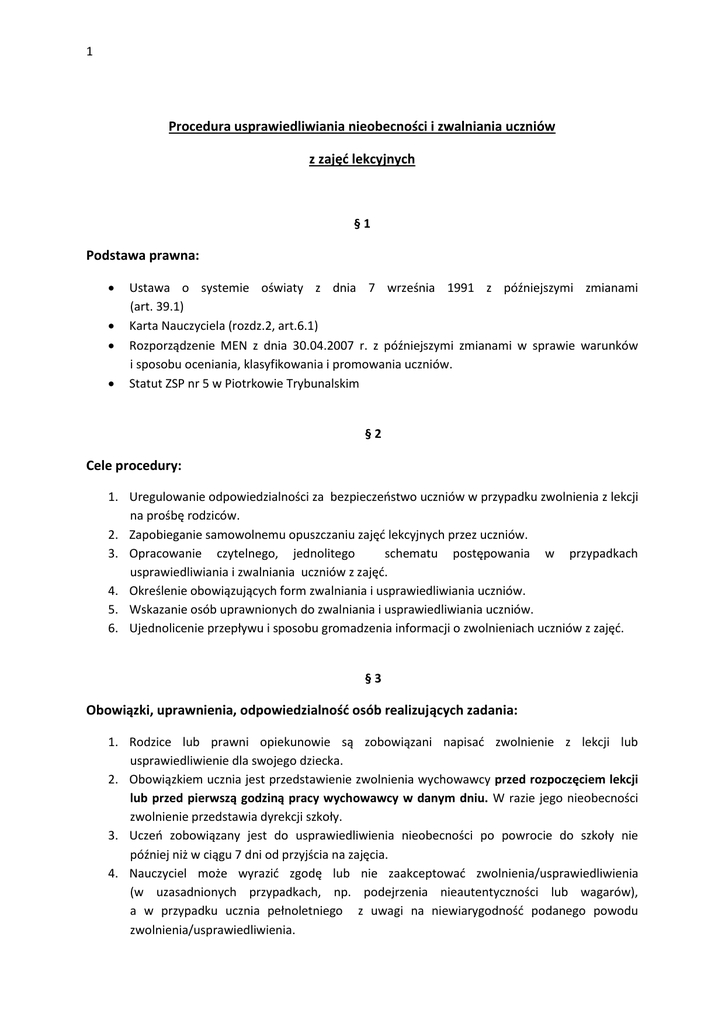 1 Procedura usprawiedliwiania nieobecności i zwalniania uczniów z zajęć lekcyjnych §1 Podstawa prawna: Ustawa o systemie oświaty z dnia 7 września 1991 z późniejszymi zmianami (art. 39.1) Karta Nauczyciela (rozdz.2, art.6.1) Rozporządzenie MEN z dnia 30.04.2007 r. z późniejszymi zmianami w sprawie warunków i sposobu oceniania, klasyfikowania i promowania uczniów. Statut ZSP nr 5 w Piotrkowie Trybunalskim §2 Cele procedury: 1. Uregulowanie odpowiedzialności za bezpieczeństwo uczniów w przypadku zwolnienia z lekcji na prośbę rodziców. 2. Zapobieganie samowolnemu opuszczaniu zajęć lekcyjnych przez uczniów. 3. Opracowanie czytelnego, jednolitego schematu postępowania w przypadkach usprawiedliwiania i zwalniania uczniów z zajęć. 4. Określenie obowiązujących form zwalniania i usprawiedliwiania uczniów. 5. Wskazanie osób uprawnionych do zwalniania i usprawiedliwiania uczniów. 6. Ujednolicenie przepływu i sposobu gromadzenia informacji o zwolnieniach uczniów z zajęć. §3 Obowiązki, uprawnienia, odpowiedzialność osób realizujących zadania: 1. Rodzice lub prawni opiekunowie są zobowiązani napisać zwolnienie z lekcji lub usprawiedliwienie dla swojego dziecka. 2. Obowiązkiem ucznia jest przedstawienie zwolnienia wychowawcy przed rozpoczęciem lekcji lub przed pierwszą godziną pracy wychowawcy w danym dniu. W razie jego nieobecności zwolnienie przedstawia dyrekcji szkoły. 3. Uczeń zobowiązany jest do usprawiedliwienia nieobecności po powrocie do szkoły nie później niż w ciągu 7 dni od przyjścia na zajęcia. 4. Nauczyciel może wyrazić zgodę lub nie zaakceptować zwolnienia/usprawiedliwienia (w uzasadnionych przypadkach, np. podejrzenia nieautentyczności lub wagarów), a w przypadku ucznia pełnoletniego z uwagi na niewiarygodność podanego powodu zwolnienia/usprawiedliwienia. 2 §4 Usprawiedliwianie nieobecności na zajęciach dydaktycznych: 1. Za terminowe rozliczanie uczniów z nieobecności odpowiedzialny jest wychowawca klasy. 2. Nauczyciel prowadzący zajęcia odpowiada za systematyczne i rzetelne odnotowywanie nieobecności ucznia na zajęciach. 3. Obowiązkiem każdego wychowawcy jest miesięczne rozliczenie frekwencji swoich wychowanków (do 14 każdego miesiąca). 4. Usprawiedliwienie nieobecności ucznia powinno mieć formę pisemną. 5. Uczniowie przynoszą usprawiedliwienia od rodziców na specjalnych drukach przygotowanych przez szkołę. Usprawiedliwienie ma zawierać: datę usprawiedliwionej nieobecności, wymiar w dniach, przyczynę, wyraźny podpis osoby wystawiającej usprawiedliwienie, w przypadku długich nieobecności (pobyt w szpitalu, sanatorium, choroba) do druku dołączane jest zwolnienie lekarskie. 6. W przypadku niepoinformowania szkoły przez rodzica o nieobecności ucznia w szkole powyżej 5 dni wychowawca zobowiązany jest do podjęcia działań mających na celu wyjaśnienie przyczyny tej nieobecności. 7. W przypadku, kiedy uczeń przed upływem siedmiodniowego terminu usprawiedliwienia nieobecności ponownie jest nieobecny w szkole, wychowawca powinien podjąć działania mające na celu wyjaśnienie przyczyn jego nieobecności. 8. Wychowawca nie ma obowiązku usprawiedliwiania nieobecności ucznia po upływie 7 dni od chwili jego powrotu do szkoły. W szczególnie uzasadnionych sytuacjach, po bezpośrednim kontakcie z rodzicami, może być usprawiedliwiona, przy czym wychowawca sporządza odpowiednią notatkę w dzienniku. 9. W przypadku gdy całkowita ilość godzin nieusprawiedliwionych przekroczyła: tygodniowy wymiar godzin lekcyjnych, wychowawca decyduje o udzieleniu uczniowi upomnienia i odnotowuje ten fakt w dzienniku oraz powiadamia rodziców, dwutygodniowy wymiar godzin lekcyjnych, wychowawca decyduje o udzieleniu uczniowi nagany i odnotowuje ten fakt w dzienniku, powiadamia rodziców, pedagoga szkolnego oraz dyrektora szkoły, trzytygodniowy wymiar godzin lekcyjnych, dyrektor szkoły decyduje o udzieleniu uczniowi upomnienia, a wychowawca odnotowuje ten fakt w dzienniku oraz powiadamia rodziców, czterotygodniowy wymiar godzin lekcyjnych, dyrektor decyduje o udzieleniu uczniowi nagany oraz w stosunku do ucznia niepełnoletniego powiadamia pisemnie Sąd Rodzinny o nierealizowaniu przez ucznia obowiązku nauki, wychowawca odnotowuje ten fakt w dzienniku oraz powiadamia rodziców. Wyżej wymierzone działania muszą być poprzedzone wnikliwą, zindywidualizowaną analizą sytuacji ucznia oraz środkami oddziaływań wychowawczych ( rozmowa z rodzicami, rozmowa z uczniem, ostrzeżenie ucznia, spotkanie z pedagogiem szkolnym itp.) 3 W stosunku do ucznia pełnoletniego nieusprawiedliwiony czterotygodniowy wymiar godzin lekcyjnych, po przeprowadzeniu wnikliwej analizy sytuacji ucznia, może być podstawą do skierowania przez wychowawcę wniosku o skreślenie ucznia z listy uczniów do Rady Pedagogicznej, a dyrektor wszczyna postępowanie egzekucyjne. 10. Nieusprawiedliwione spóźnienie na lekcję powyżej 15 minut – traktowane jest jak godzina nieobecna. 11. Jeśli liczba spóźnień nieusprawiedliwionych w semestrze osiągnie sumę 15-tu, wychowawca ma prawo udzielić uczniowi karę upomnienia. 12. Spóźnienia usprawiedliwione są oznaczone w dzienniku jako "s", a spóźnienia nieusprawiedliwione jako "sn". 13. W wyjątkowych sytuacjach losowych wychowawca może usprawiedliwić nieobecność ucznia na pierwszej godzinie lekcyjnej. 14. Pojedyncze godziny lekcyjne w ciągu dnia nie są usprawiedliwiane bez wcześniejszego zwolnienia. §5 Dopuszczalne formy zwolnienia ucznia z zajęć lekcyjnych: 1. Na pisemną prośbę rodzica/opiekuna, po upewnieniu się co do autentyczności jego podpisu (wzory podpisów znajdują się w dokumentacji wychowawcy klasy). 2. Na ustną prośbę rodzica/opiekuna – podczas osobistego kontaktu. 3. W wyjątkowych sytuacjach na prośbę rodzica/opiekuna wyrażoną podczas rozmowy telefonicznej, po zidentyfikowaniu rozmówcy jako rodzica/opiekuna na podstawie dokładny