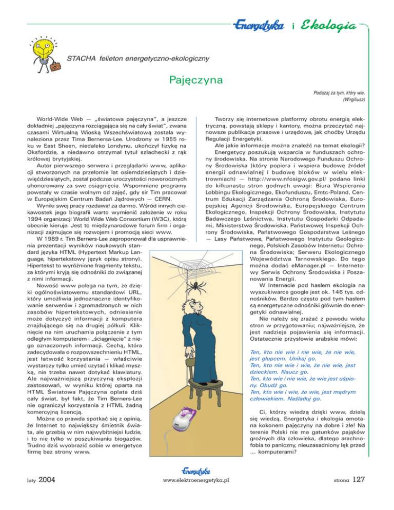 STACHA felieton energetyczno-ekologiczny Pajêczyna Pod¹¿aj za tym, który wie. (Wirgiliusz) World-Wide Web wiatowa pajêczyna, a jeszcze dok³adniej pajêczyna rozci¹gaj¹ca siê na ca³y wiat, zwana czasami Wirtualn¹ Wiosk¹ Wszechwiatow¹ zosta³a wynaleziona przez Tima Bernersa-Lee. Urodzony w 1955 roku w East Sheen, niedaleko Londynu, ukoñczy³ fizykê na Oksfordzie, a niedawno otrzyma³ tytu³ szlachecki z r¹k królowej brytyjskiej. Autor pierwszego serwera i przegl¹darki www, aplikacji stworzonych na prze³omie lat osiemdziesi¹tych i dziewiêædziesi¹tych, zosta³ podczas uroczystoci noworocznych uhonorowany za swe osi¹gniêcia. Wspomniane programy powsta³y w czasie wolnym od zajêæ, gdy sir Tim pracowa³ w Europejskim Centrum Badañ J¹drowych CERN. Wyniki swej pracy rozdawa³ za darmo. Wród innych ciekawostek jego biografii warto wymieniæ za³o¿enie w roku 1994 organizacji World Wide Web Consortium (W3C), któr¹ obecnie kieruje. Jest to miêdzynarodowe forum firm i organizacji zajmuj¹ce siê rozwojem i promocj¹ sieci www. W 1989 r. Tim Berners-Lee zaproponowa³ dla usprawnienia prezentacji wyników naukowych standard jêzyka HTML (Hypertext Markup Language, hipertekstowy jêzyk opisu strony). Hipertekst to wyró¿nione fragmenty tekstu, za którymi kryj¹ siê odnoniki do zwi¹zanej z nimi informacji. Nowoæ www polega na tym, ¿e dziêki ogólnowiatowemu standardowi URL, który umo¿liwia jednoznaczne identyfikowanie serwerów i zgromadzonych w nich zasobów hipertekstowych, odniesienie mo¿e dotyczyæ informacji z komputera znajduj¹cego siê na drugiej pó³kuli. Klikniêcie na nim uruchamia po³¹czenie z tym odleg³ym komputerem i ci¹gniêcie z niego oznaczonych informacji. Cech¹, która zadecydowa³a o rozpowszechnieniu HTML, jest ³atwoæ korzystania w³aciwie wystarczy tylko umieæ czytaæ i klikaæ myszk¹, nie trzeba nawet dotykaæ klawiatury. Ale najwa¿niejsz¹ przyczyn¹ eksplozji zastosowañ, w wyniku której oparta na HTML wiatowa Pajêczyna oplata dzi ca³y wiat, by³ fakt, ¿e Tim Berners-Lee nie ograniczy³ korzystania z HTML ¿adn¹ komercyjn¹ licencj¹. Mo¿na co prawda spotkaæ siê z opini¹, ¿e Internet to najwiêkszy mietnik wiata, ale grzebi¹ w nim najwybitniejsi ludzie, i to nie tylko w poszukiwaniu biogazów. Trudno dzi wyobraziæ sobie w energetyce firmê bez strony www. luty 2004 Tworzy siê internetowe platformy obrotu energi¹ elektryczn¹, powstaj¹ sklepy i kantory, mo¿na przeczytaæ najnowsze publikacje prasowe i urzêdowe, jak choæby Urzêdu Regulacji Energetyki. Ale jakie informacje mo¿na znaleæ na temat ekologii? Energetycy poszukuj¹ wsparcia w funduszach ochrony rodowiska. Na stronie Narodowego Funduszu Ochrony rodowiska (który popiera i wspiera budowê róde³ energii odnawialnej i budowê bloków w wielu elektrowniach) http://www.nfosigw.gov.pl/ podano linki do kilkunastu stron godnych uwagi: Biura Wspierania Lobbingu Ekologicznego, Ekofunduszu, Emtc-Poland, Centrum Edukacji Zarz¹dzania Ochron¹ rodowiska, Europejskiej Agencji rodowiska, Europejskiego Centrum Ekologicznego, Inspekcji Ochrony rodowiska, Instytutu Badawczego Lenictwa, Instytutu Gospodarki Odpadami, Ministerstwa rodowiska, Pañstwowej Inspekcji Ochrony rodowiska, Pañstwowego Gospodarstwa Lenego Lasy Pañstwowe, Pañstwowego Instytutu Geologicznego, Polskich Zasobów Internetu: Ochrona rodowiska; Serweru Ekologicznego Województwa Tarnowskiego. Do tego mo¿na dodaæ eManager.pl Internetowy Serwis Ochrony rodowiska i Poszanowania Energii. W Internecie pod has³em ekologia na wyszukiwarce google jest ok. 146 tys. odnoników. Bardzo czêsto pod tym has³em s¹ energetyczne odnoniki g³ównie do energetyki odnawialnej. Nie nale¿y siê zra¿aæ z powodu wielu stron w przygotowaniu; najwa¿niejsze, ¿e jest nadzieja pojawienia siê informacji. Ostatecznie przys³owie arabskie mówi: www.elektroenergetyka.pl Ten, kto nie wie i nie wie, ¿e nie wie, jest g³upcem. Unikaj go. Ten, kto nie wie i wie, ¿e nie wie, jest dzieckiem. Naucz go. Ten, kto wie i nie wie, ¿e wie jest upiony. Obud go. Ten, kto wie i wie, ¿e wie, jest m¹drym cz³owiekiem. Naladuj go. Ci, którzy wiedz¹ dziêki www, dziel¹ siê wiedz¹. Energetyka i ekologia omotana kokonem pajêczyny na dobre i z³e! Na terenie Polski nie ma gatunków paj¹ków gronych dla cz³owieka, dlatego arachnofobia to paniczny, nieuzasadniony lêk przed ... komputerami? strona 127