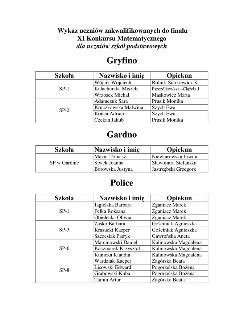 Wykaz uczniów zakwalifikowanych do finału XI Konkursu Matematycznego dla uczniów szkół podstawowych Gryfino Szkoła SP-1 SP-2 Nazwisko i imię Wójcik Wojciech Kałachurska Miszela Wrzosek Michał Adamczuk Sara Kruczkowska Malwina Końca Adrian Czekan Jakub Opiekun Rolnik-Siarkiewicz K. Pszczółkowksa –Ciążela J. Maskowicz Marta Prusik Monika Szych Ewa Szych Ewa Prusik Monika Gardno Szkoła SP w Gardnie Nazwisko i imię Mazur Tomasz Siwek Joanna Borowska Justyna Opiekun Niewiarowska Jowita Sławomira Stefańska Jastrzębski Grzegorz Police Szkoła SP-1 SP-3 SP-6 SP-8 Nazwisko i imię Jagielska Barbara Pelka Roksana Obielecka Oliwia Zaśko Barbara Krasucki Kacper Szczesiak Patryk Marcinowski Daniel Kaczmarek Krzysztof Kunicka Klaudia Wardziak Kacper Lisowski Edward Grabowski Kuba Tamm Artur Opiekun Zganiacz Marek Zganiacz Marek Zganiacz Marek Gościniak Agnieszka Gościniak Agnieszka Gawrońska Aneta Kalinowska Magdalena Kalinowska Magdalena Kalinowska Magdalena Zagórska Beata Pogorzelska Bożena Pogorzelska Bożena Zagórska Beata Tanowo Szkoła SP w Tanowie Nazwisko i imię Jakubiec Julianna Chojnacki Jakub Strzelecki Wiktor Opiekun Wróblewska Hanna Wróblewska Hanna Wróblewska Hanna Szczecin Bezrzecze Szkoła Nazwisko i imię SP w Bezrzeczu Gryszkiewicz Maciej Atamańczuk Mateusz Jurska Małgorzata Opiekun Zgórecka Anna Zielińska Małgorzata Zgórecka Anna Mierzyn Szkoła SP w Mierzynie Nazwisko i imię Śliwiński Michał Polak Konrad Mysłowski Kamil Opiekun Piasecka Anna Piasecka Anna Piasecka Anna Myślibórz Szkoła SP-2 SP-3 Nazwisko i imię Dąbrowski Paweł Balcewicz Dariusz Figiel Bartosz Markowski Szymon Droń Michał Lewandowski Filip Opiekun Darewska-Sawicka Lucyna Darewska Sawicka Lucyna Darewska Sawicka Lucyna Lewandowska Danuta Sobiegraj Małgorzata Sobiegraj Małgorzata Łobez Szkoła Nazwisko i imię SP - 2 w Łobzie Karau Przemysław Kościukiewicz Natalia Miłek Wojciech Opiekun Bromberg Julita Bromberg Julita Bromberg Julita Rożnowo Nowogardzkie Szkoła SP Rożnowo Nowogardzkie Nazwisko i imię Stenka Wiktoria Opiekun Ibowicz Anna Szczecin Szkoła SP-1 SP-3 SP-10 Nazwisko i imię Linek Oskar Kiełbratowski Igor Ciarka Dawid Just Jędrzej Dzioba Arkadiusz Kozłowski Maciej Kuciak Artur Pychtin Michał Kowalewski Michał Jankowski Tomasz Sadecki Bartosz Dąbrowski Jan Fiuk Oskar Urbala Anna Olszewski Błażej Szybka Emilia Nowak Adam Abramczuk Beata Abramczuk Beata Abramczuk Beata Krukowska Iwona Krukowska Iwona Krukowska Iwona Nowicka Aneta Lubawa Natalia Lubawa Natalia Nowicka Aneta Lubawa Natalia Nowicka Aneta Wolska Wioletta Wolska Wioletta Wolska Wioletta Krawiec Elżbieta Krawiec Elżbieta Krawiec Elżbieta Krawiec Elżbieta Kaczmarzyk de Castellatti Gofin Claudia Juszkiewicz Małgorzata Janowska Nikola Pawlak Patrycja Piekarczyk Marcin Małysa Krzysztof Tworek Michał Bassa Karolina Król Michał Belina Mikołaj Wełpa Wiktoria Schodowski Jakub Popławska Sandra Juszkiewicz Małgorzata Juszkiewicz Małgorzata Pietrzak Ewa Kloc Sylwia Dudzik Małgorzata Drozdowska Anna Drozdowska Anna Drozdowska Anna Kozińska Anna Kozinska Anna Chełchowska Teresa Przybylski Wojciech SP-11 ZS-13 SP- 14 ZS - 16 SP-18 SP-20 Opiekun SP-23 SP-28 SP - 35 Ignor Wiktoria Czerniecka Zuzanna Niciejewski Michał Gołdyn Jakub Potyrała Łukasz Lewoczko Marsel Dynowski Zbigniew Czyżewski Maciej Kwapiszewski Bartosz Pliszka Piotr Drozdek Kacper SP-37 Sikora Jakub Machałowski Marcin SP-39 SP-41 SP-42 SP-45 SP-46 SP-47 SP-48 SP-51 Ronewicz Anna Śmiałkowski Karol Podgórski Michał Zchciał Edyta Opolski łażej Kosycarz Aleksandra Oślizło Joanna Oślizło Alicja Kimber Łukasz Owsikowski Konrad Sawicki Piotr Śmiałek Aleksandra Skotnicki Jakub Matysewicz Adrianna Czekaj Zuzanna Maruszczak Maciej Dąbek Jakub Pempera Krzysztof Reszka Elżbieta Grynkiewicz Adrianna Biernacki Bartosz Dyguś Szymon Mirowski Krzysztof Zawadzki Jakub Ostrowska Ewa Głowacka Anna Grzenkowicz Katarzyna Głowacka Anna Wic-Rudnicka Wanda Baran Barbara Baran Barbara Wachowiak-Rajman Ewa Matwijów Barbara Matwijów Barbara Bochniak Ewa Sankiewicz Anita Bochniak Ewa Pałasz Izabela Bochniak Ewa Pałasz Izabela Bochniak Ewa Pałasz Izabela Mokrzycka Maria Mokrzycka Maria Zbiorczyk Barbara Lewandowska Teresa Lewandowska Teresa Malinowska Anna Sobala Aneta Sobala Aneta Sobala Aneta Ankudowicz Magdalena Zdanowicz Dorota Ankudowicz Magdalena Czerniakiewicz Ewa Lulno Milena Czerniakiewicz Ewa Budnicka Nikola Syguda Halina Budnicka Nikola Budnicka Nikola Staśkowska Danuta Żełndziewicz Małgorzata Żełndziewicz Małgorzata Dżugaj Magdalena Masełko Krystyna Dżugaj Magdalena SP-53 SP-54 SP-55 SP-56 SP-59 SP-61 SP-63 SP-64 SP-65 SP-68 SP- 69 SP-71 SP-74 Dziczek Natalia Kuźmiński Radosław Jedrzejak Lidia Darda Rozalia Derenda Wojciech Pokrywka Szymon Rogowski Krzysztof Kopaczyk Paweł Boczek Alexander Weiss Arkadiusz Weiss Wojciech Górski Krzysztof Śmieszek Wojciech Parada Jakub Motyl Magdalena Zalewska Patrycja Maj Anna Król Jakub Glinkowski Kamil Szcześniak Jakub Bodziony Mateusz Margula Adrian Nicpoń Kacper Feret Beata Czajkowski Artur Rychel Patryk Łopatka Michał Frąckowiak Krystian Drabarek Paweł Poliński Nicolas Szkudlarek Maciej Krysiak Sandra Kotlicka Edyta Włodarski Krystian Targosz Adrian Matyszczak Mateusz Łubkowska Jagoda Humański Kamil Subocz Marek Kożluk Adrian Bigott Piotr Mikulewicz Aldona Mikulewicz Aldona Mikulewicz Aldona Kalinowska Wiesława Molik Magdalena Molik Magdalena Gralak Danuta Bazyluk Anna Bazyluk Anna Komorowska Magdalena Komorowska Magdalena Komorowska Magdalena Komorowska Magdalena Zagórska Krzysztofa Zagórska Krzysztofa Zagórska Krzysztofa Hryniuk Hanna Hryniuk Hanna Hryniuk Hanna Kruszewska Joanna Michalec Urszula Kruszewska Joanna Łyska Iwona Szczotkowska Iwona Łyska Iwona Rychlik Maria Ciołak Joanna Tyszka Edyta Hajdukiewicz Marta Maliszewska Agnieszka Hajdukiewicz Marta Cieślewicz Elżbieta Cieślewicz Elżbieta Cieślewicz Elżbieta Konopcza